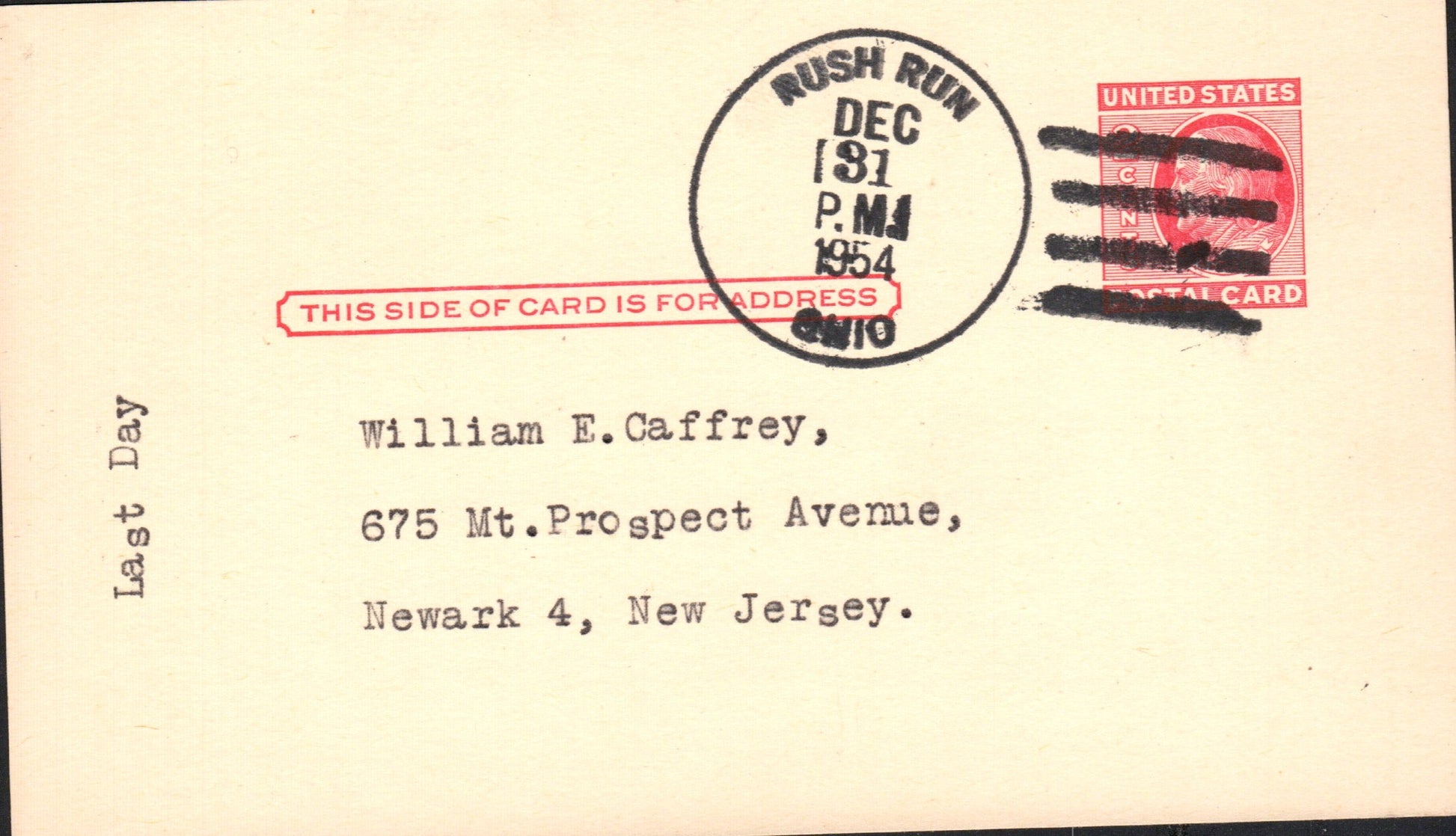 Rush Run (1858-1954) 1954 4-bar on LD Postal Card