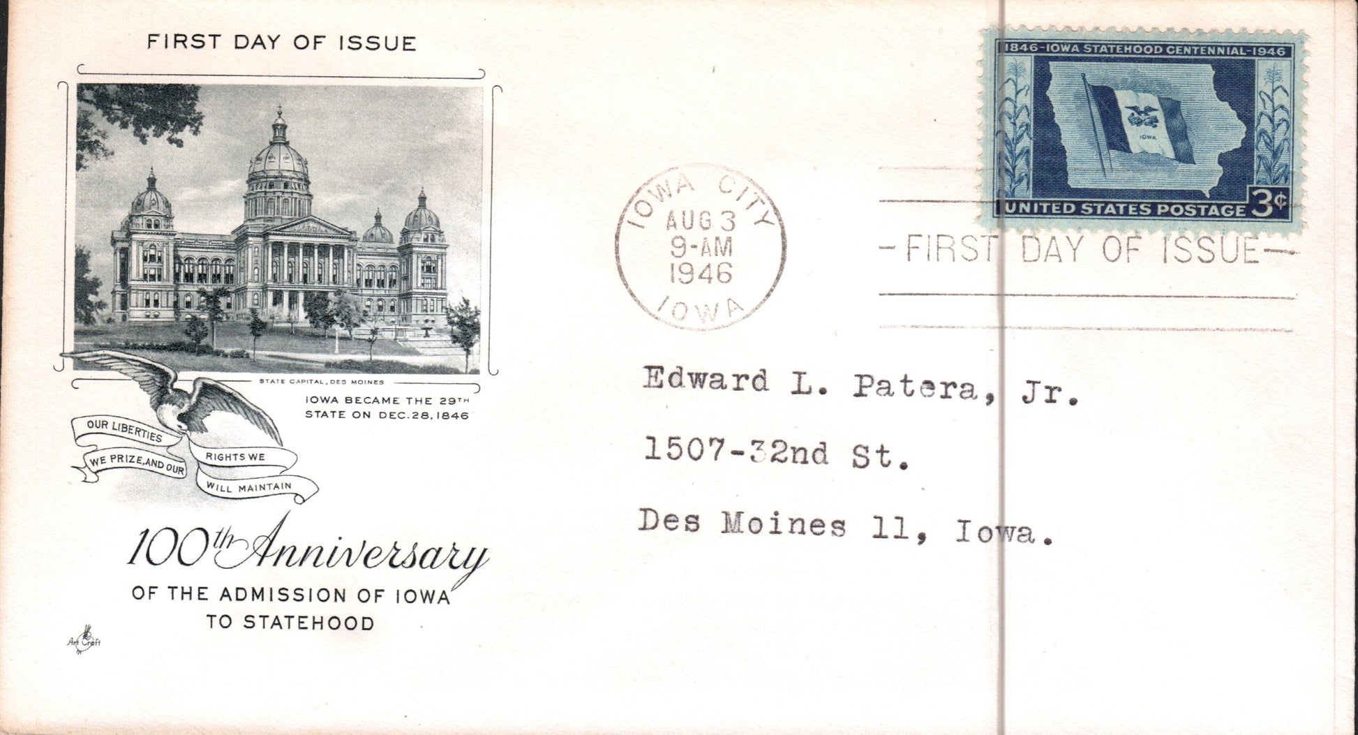 Iowa City 1889 cds on cover; 1946 FD of issue of 3¢ Iowa Statehood stamp on cacheted cover