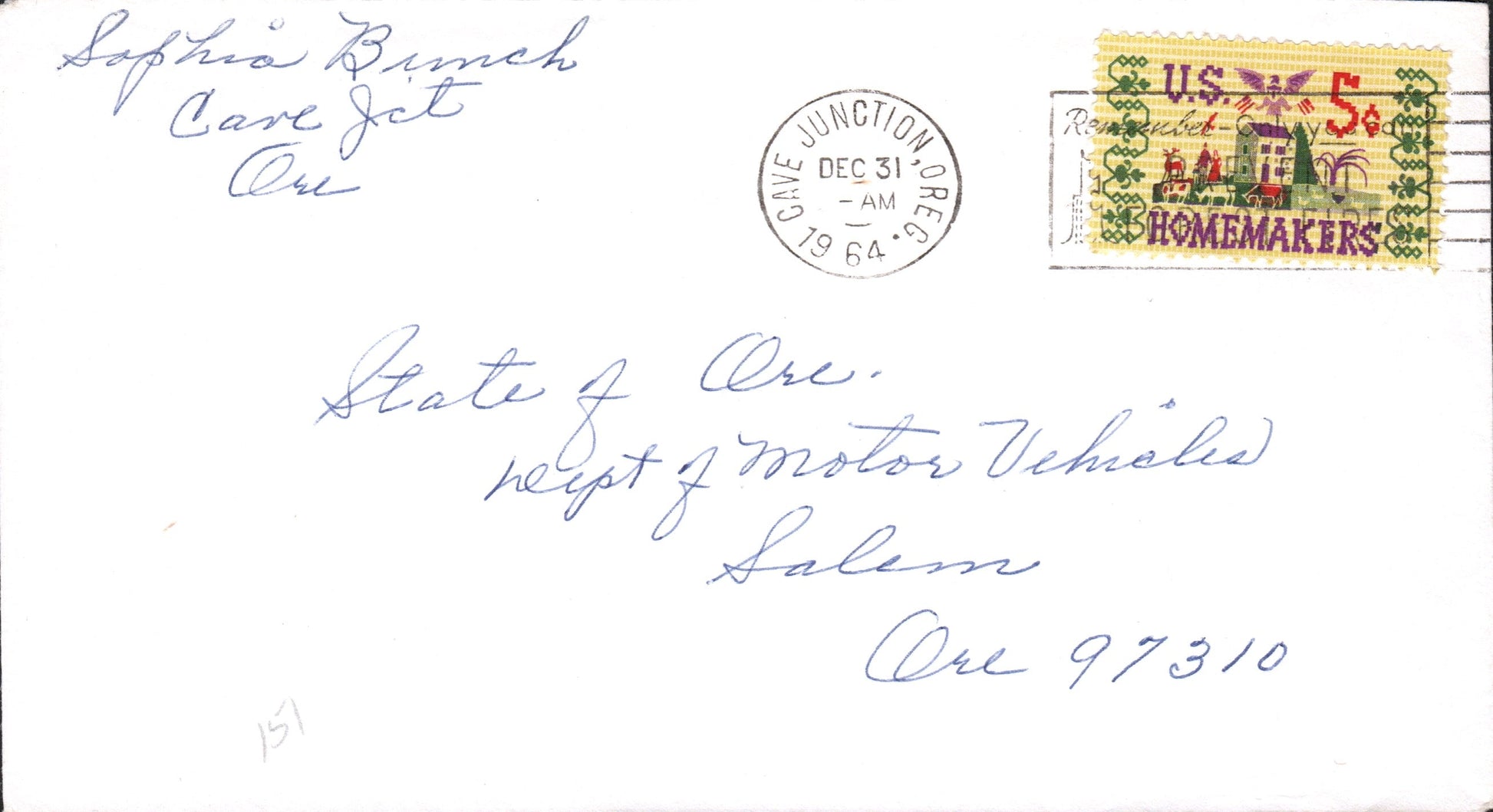 - Cave Junction 1955 4-bar on post card, view of Muir Motel; 1964 machine cancel on cover; 1978 machine slogan “Only You can prevent Forest Fires” on cover