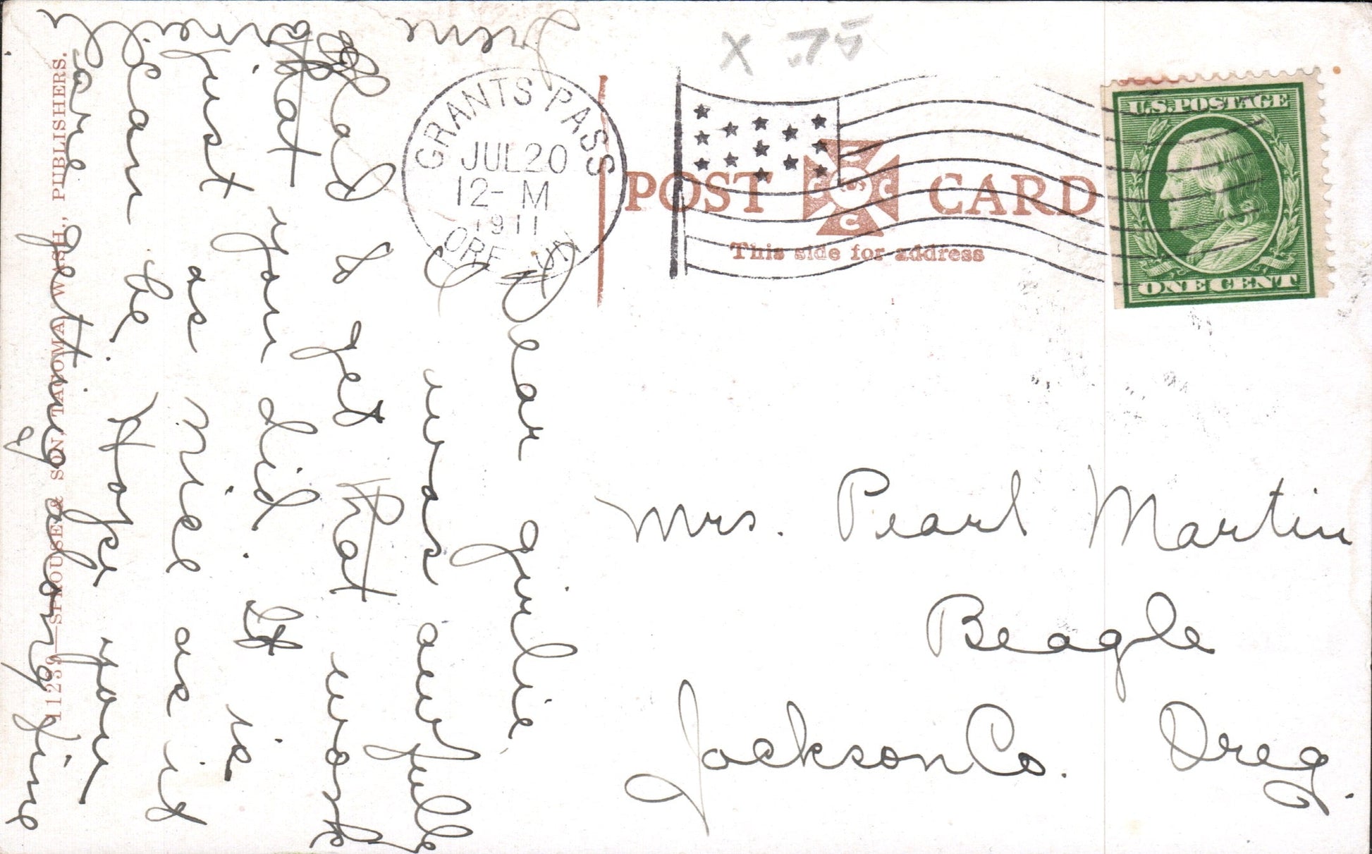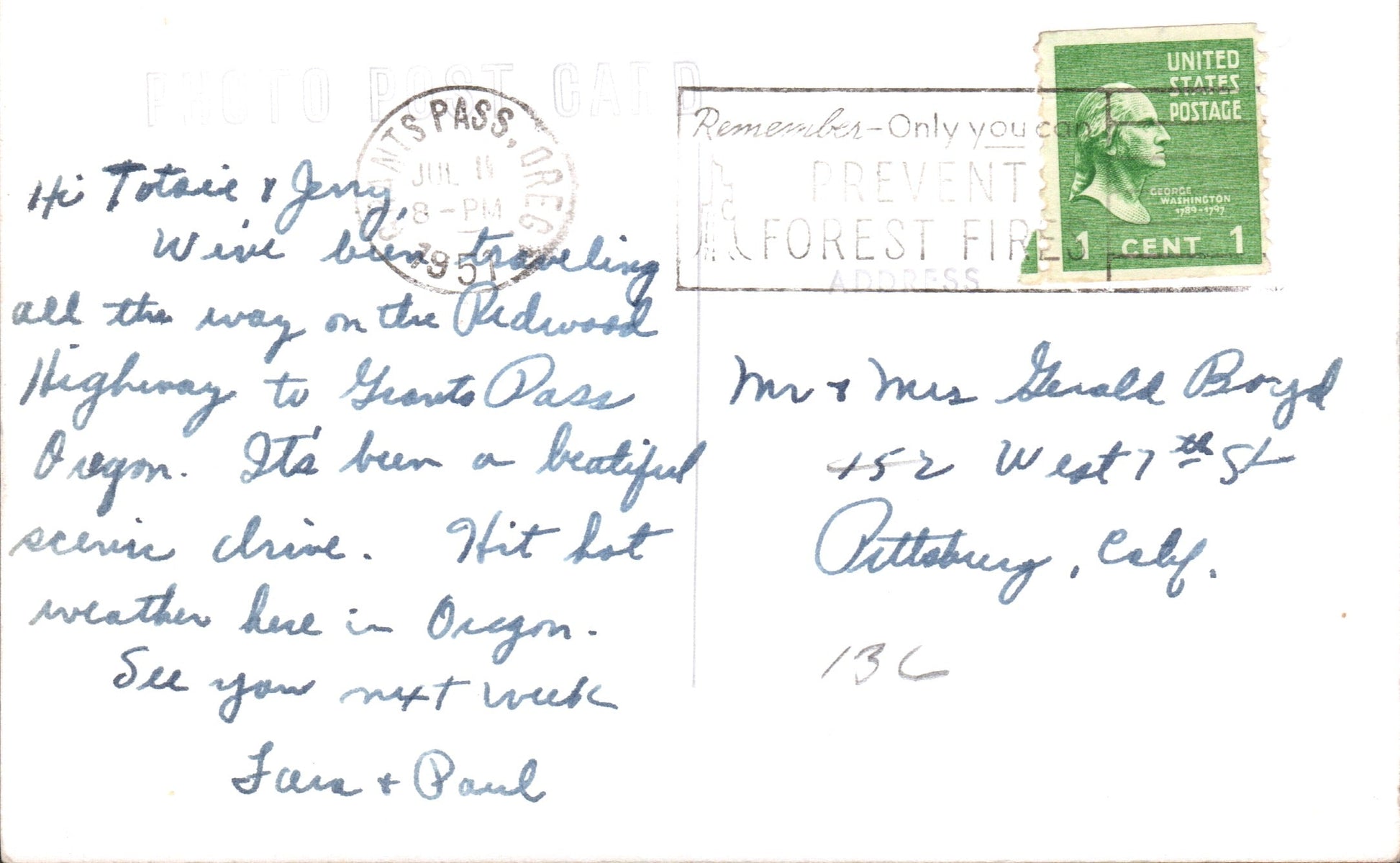 - Grants Pass 1911 Flag cancel on post card, view of city park; 1951 machine slogan “Only You can Prevent Forest Fires” on post card; 1952 machine cancel on post card; 1987 machine cancel on post card