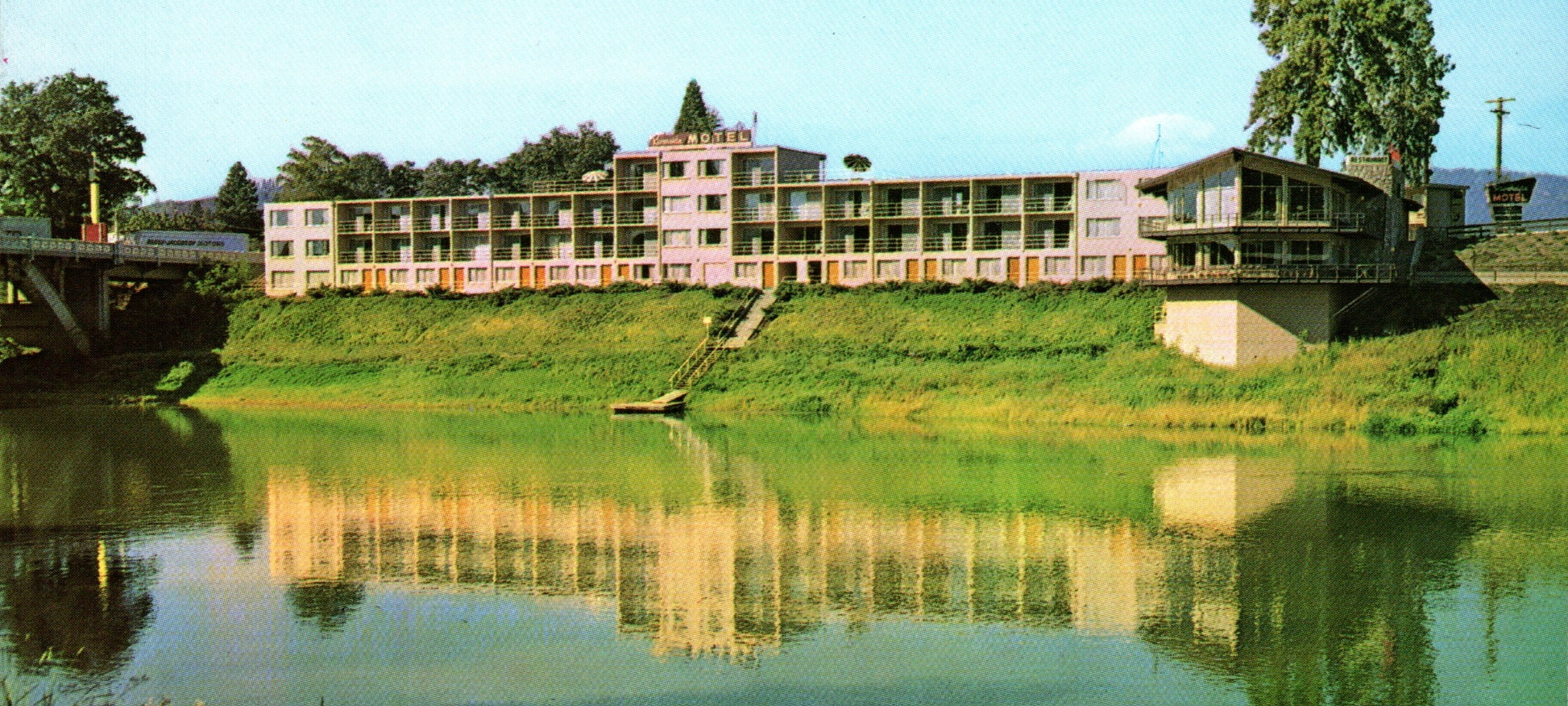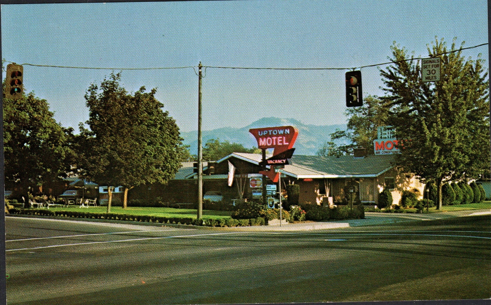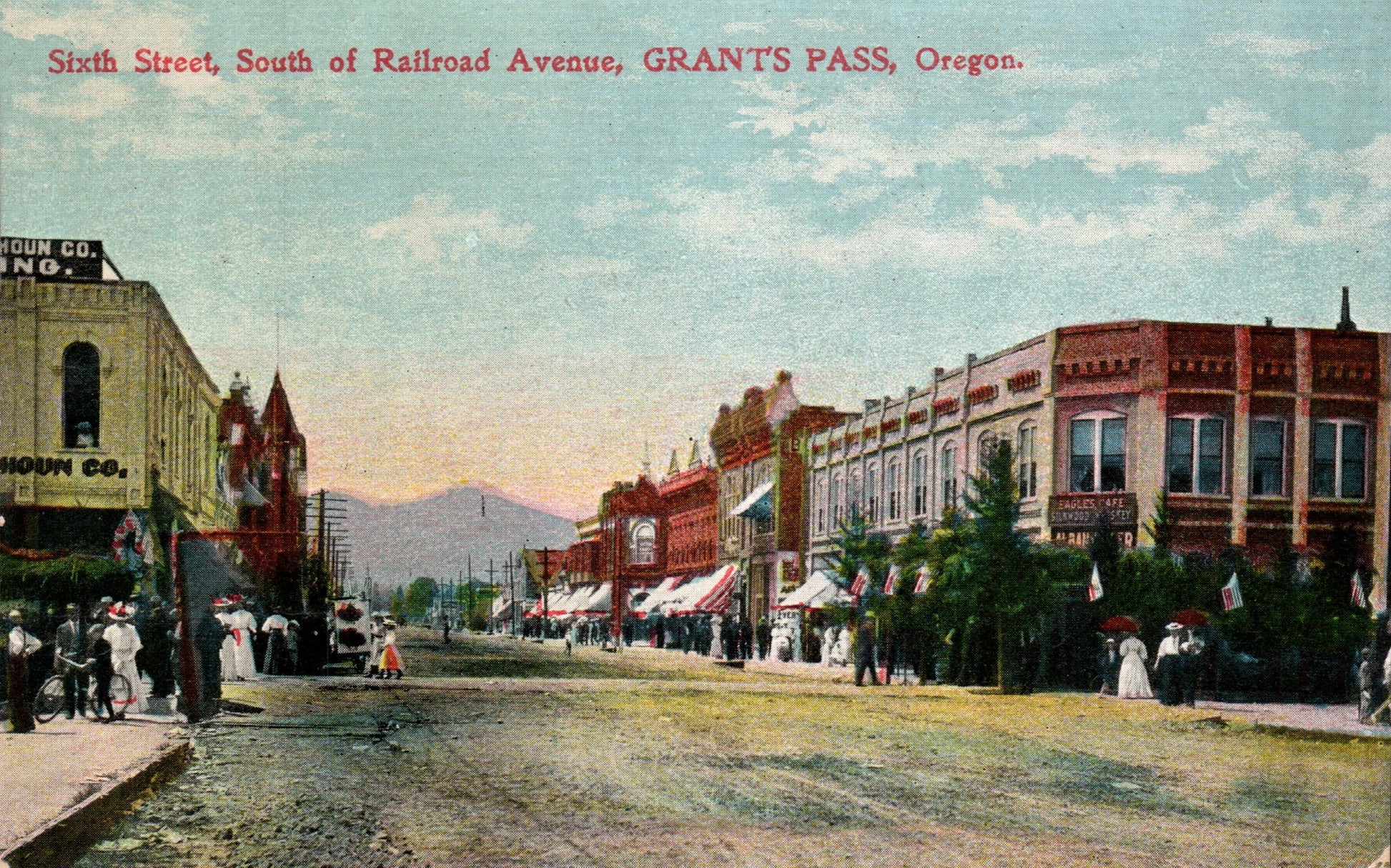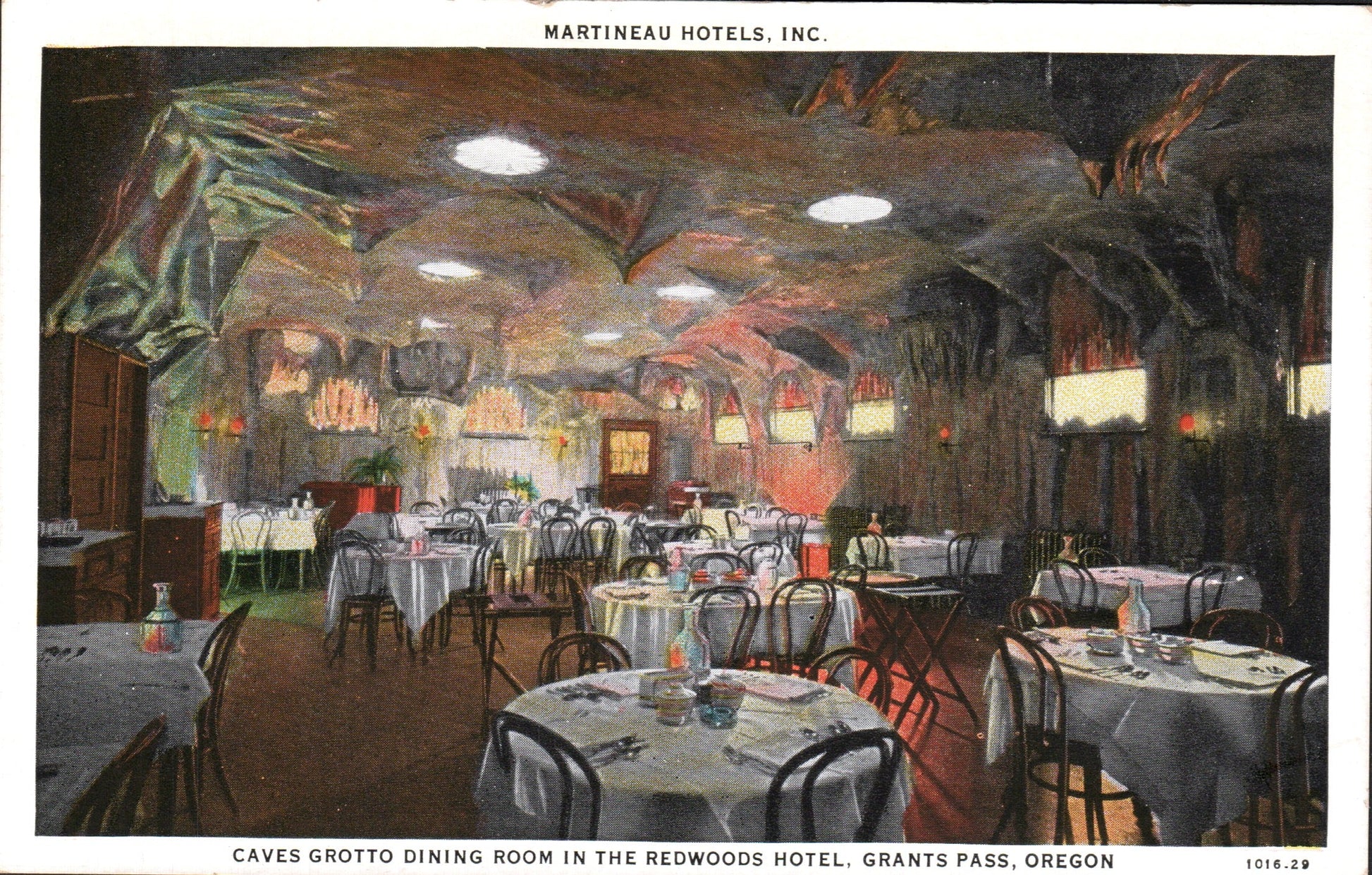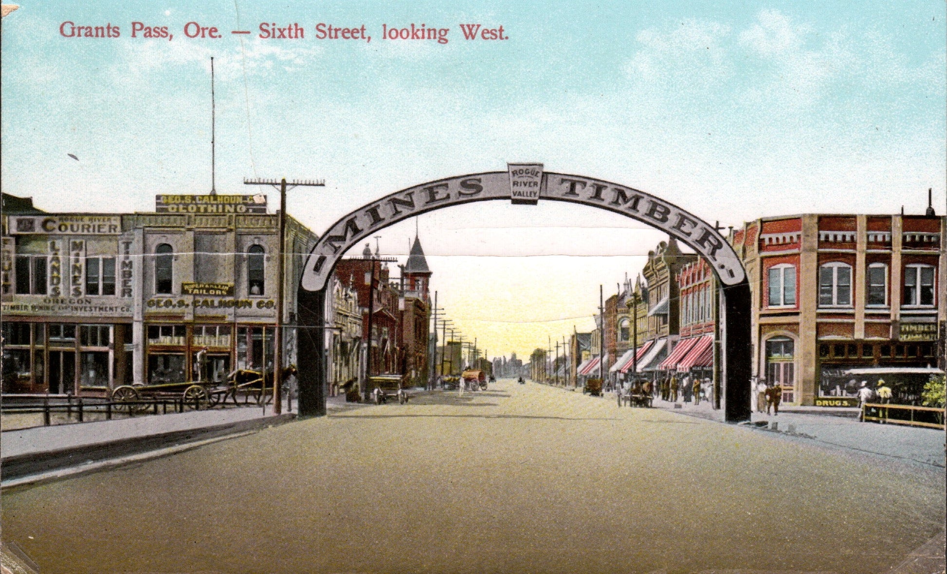- Post cards: “Sixth Street South of Railroad Avenue” [1909 Grants Pass Flag cancel]; Sixth Street with overhead sign [c.1910]; Main street with “Greetings from” [chrome]; Grants Pass Motel [chrome]; Redwoods Hotel Caves Grotto Dining Room [chrome]; Riverside Motel and Restaurant [chrome]; “Uptown Motel” [2 chrome cards, different views]