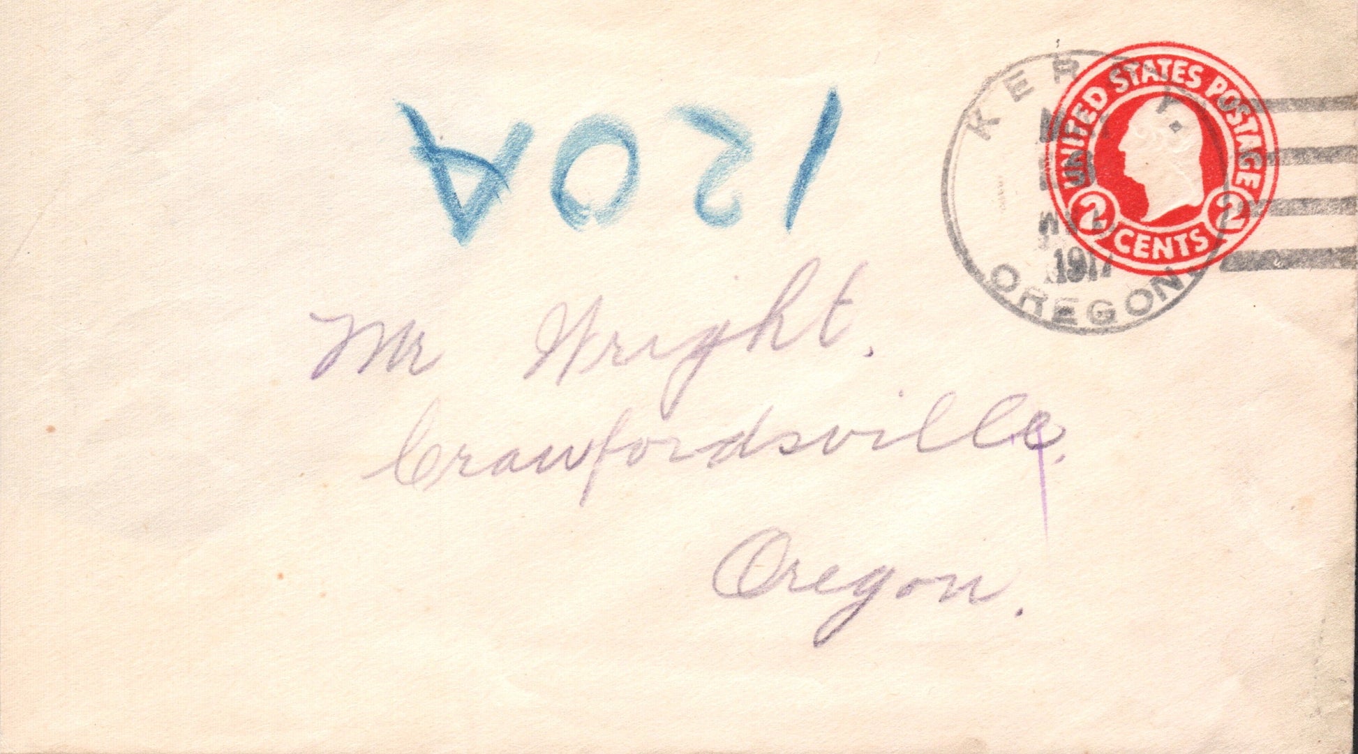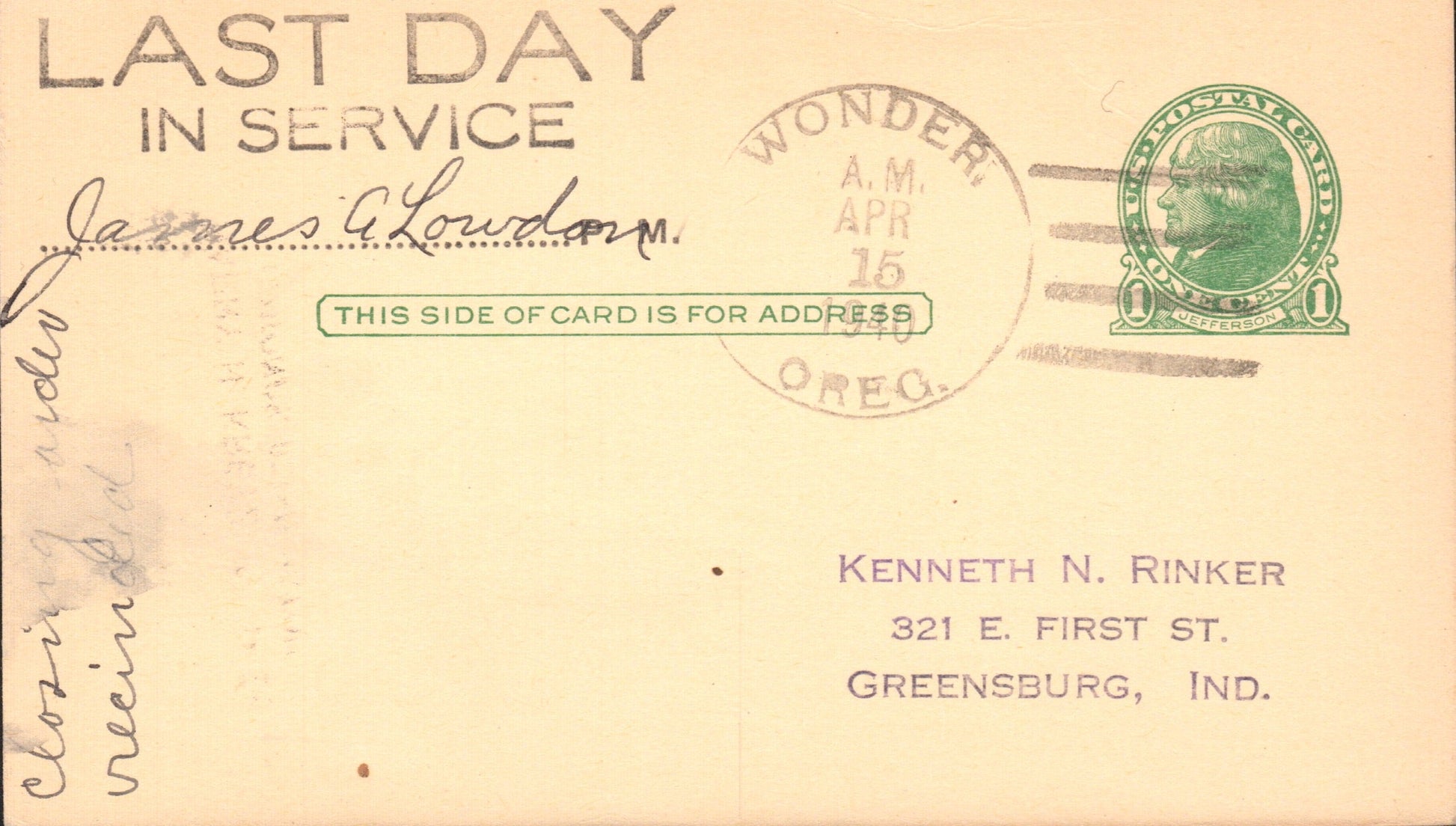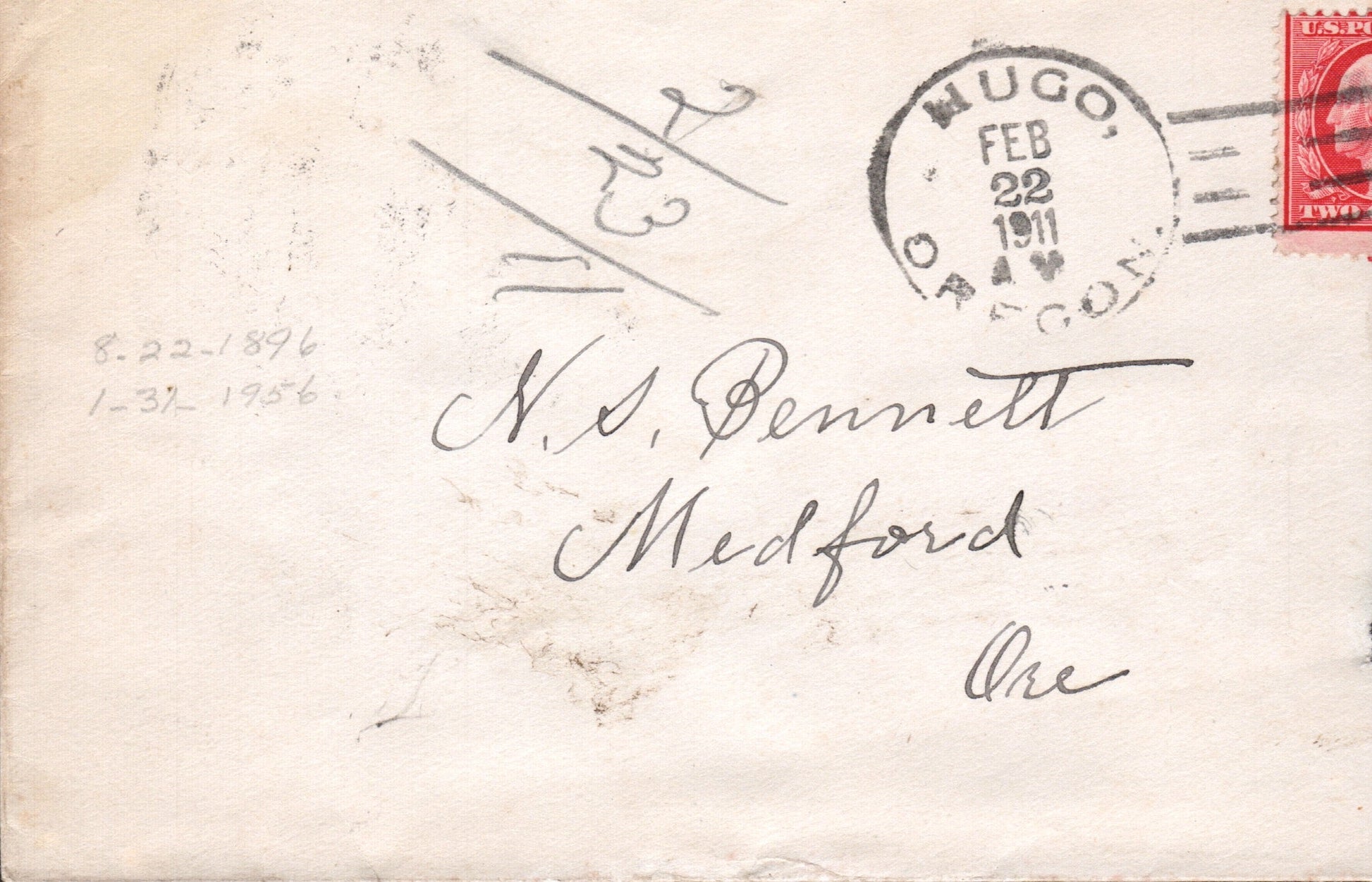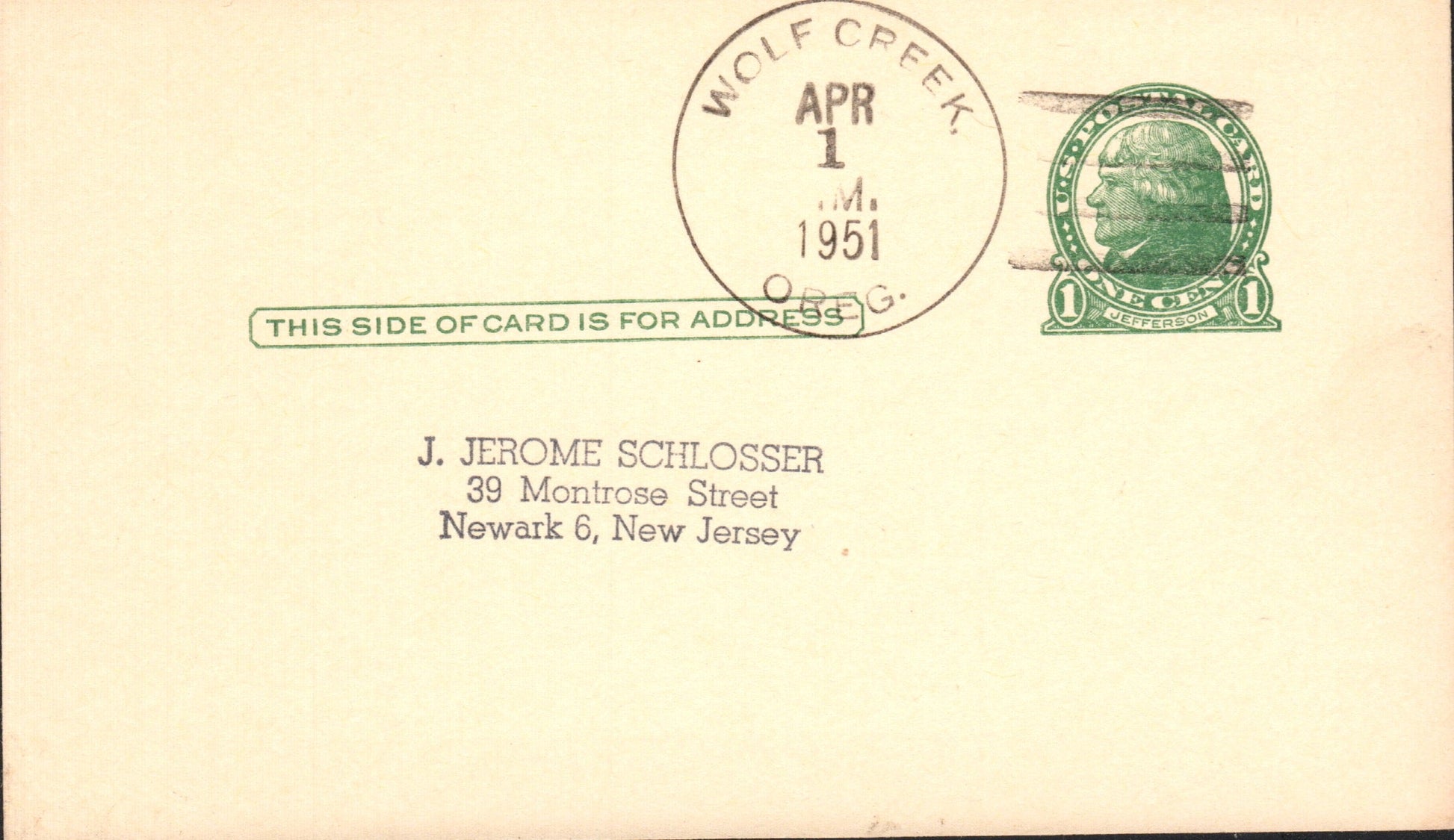 - Wolf Creek 1951 4-bar on Postal Card; 1985 4-bar on cover; 2009 Oregon Sesquicentennial pictorial cancel on cover