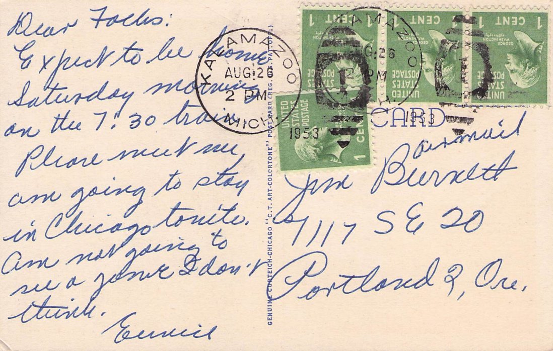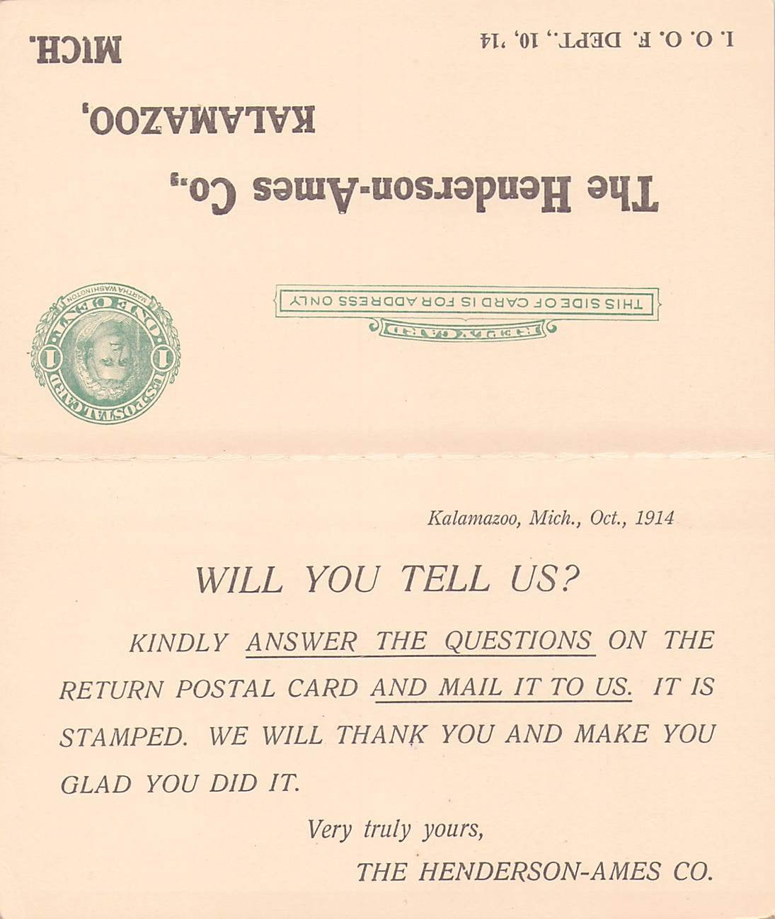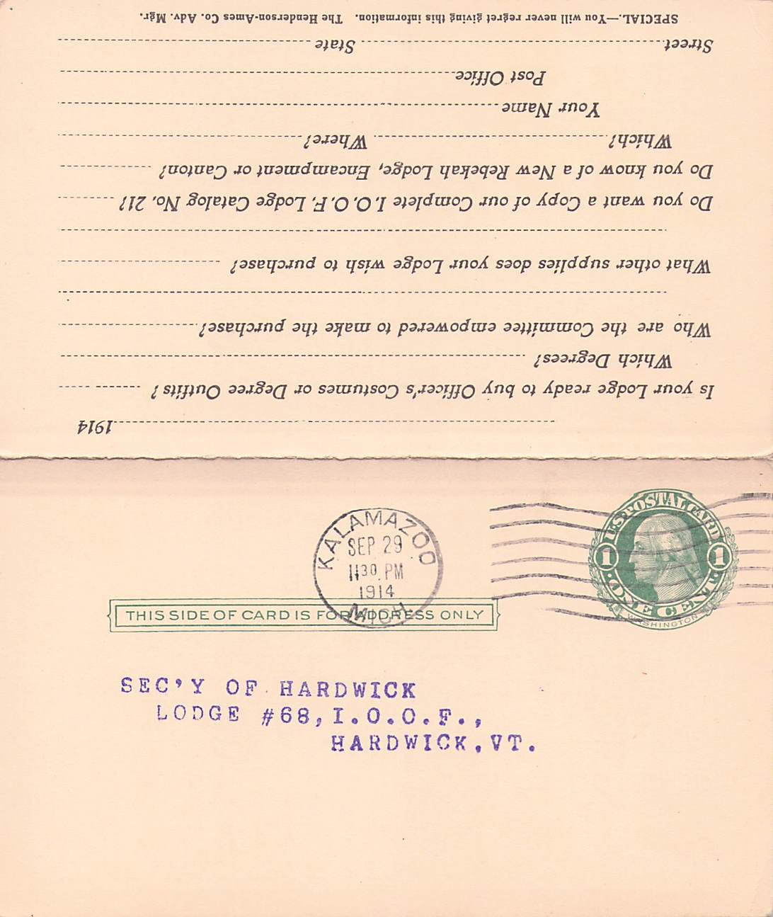 Kalamazoo c.1880 cds on cover; 1910 Columbia machine cancel on post card; 1914 machine cancel on Postal Card with attached reply card; 1953 duplex on post card; 1953 machine slogan, “Help Goodwill Industries” on slightly oversized cover; 1991 machine cancel on cover.