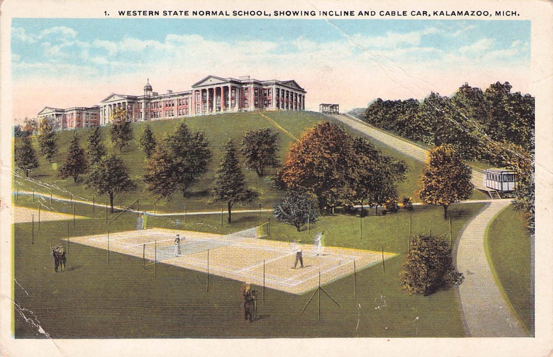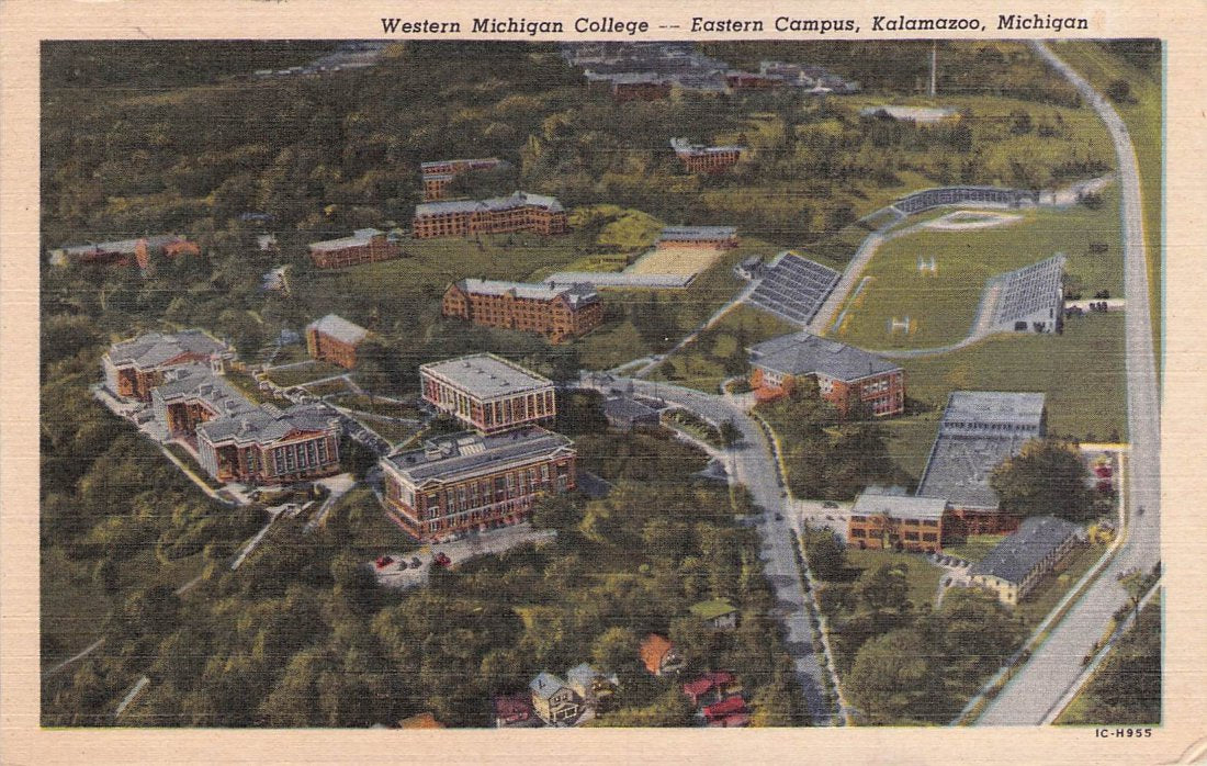Post cards: Burdick Street Mall [chrome, 1972]; “Main Office of the Kalamazoo Vegetable Parchment Co.” [chrome]; Post office [white border]; County Building [chrome]; Upjohn Factory [chrome]; Public Library [1907]; “Western State Normal School, Showing Incline and Cable Car” [white border]; “Kalamazoo College and Men’s Dormitory” [linen]; Second Church of Christ Scientist” [chrome]; Nature Center [chrome]; First Methodist Church [chrome, interior view); Bronson Park [1909]