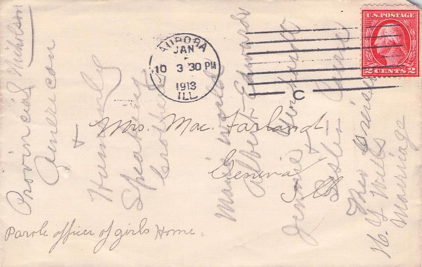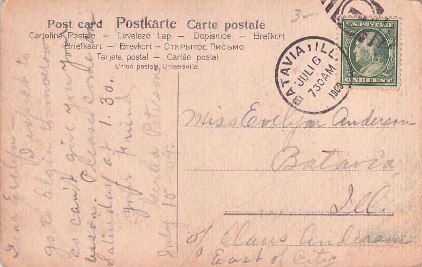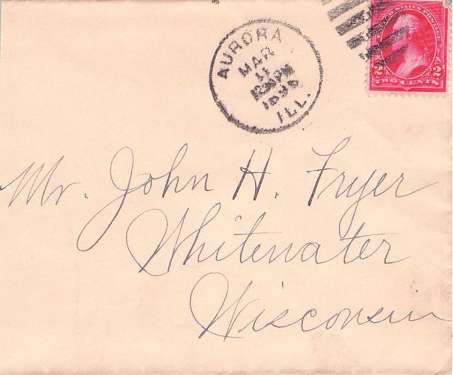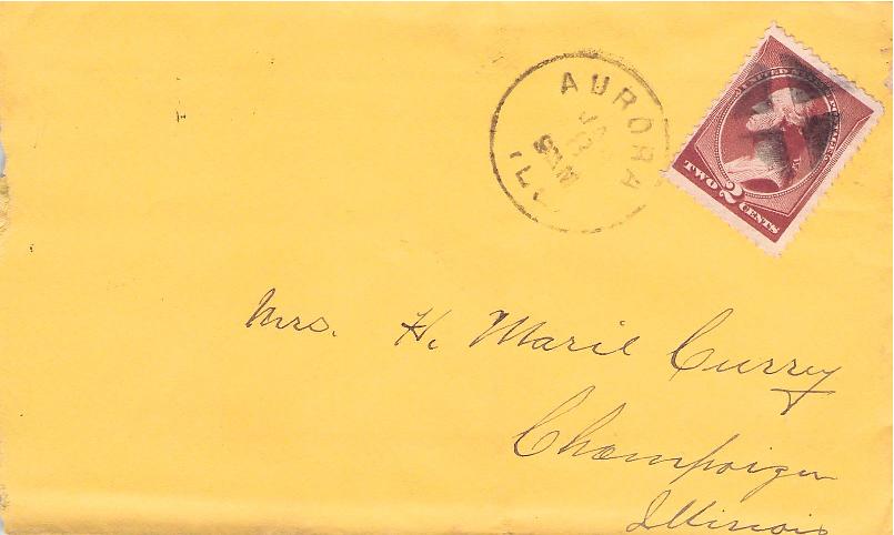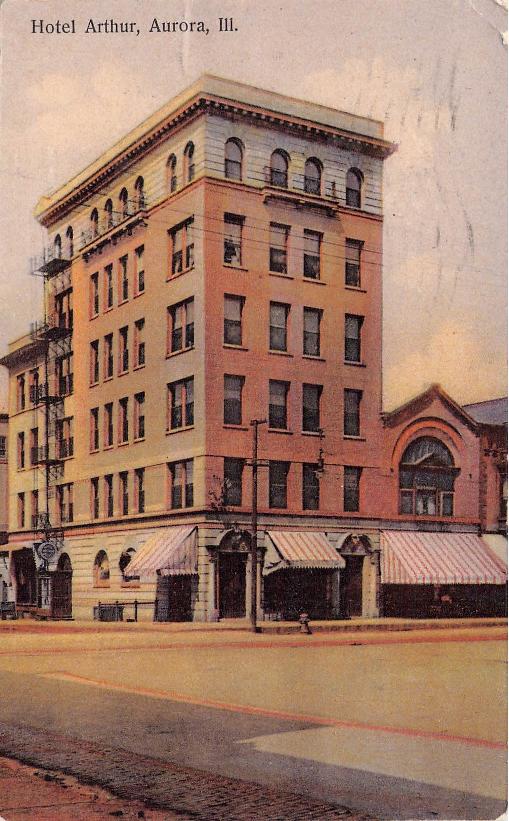 - Aurora c.1880 cds on cover; 1896 duplex on cover; 1908 Flag cancel on nice view of Hotel Arthur; 1913 Columbia machine cancel on cover, Geneva Ill Rec’d on back.