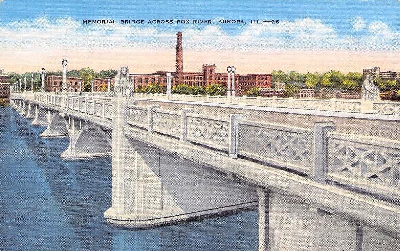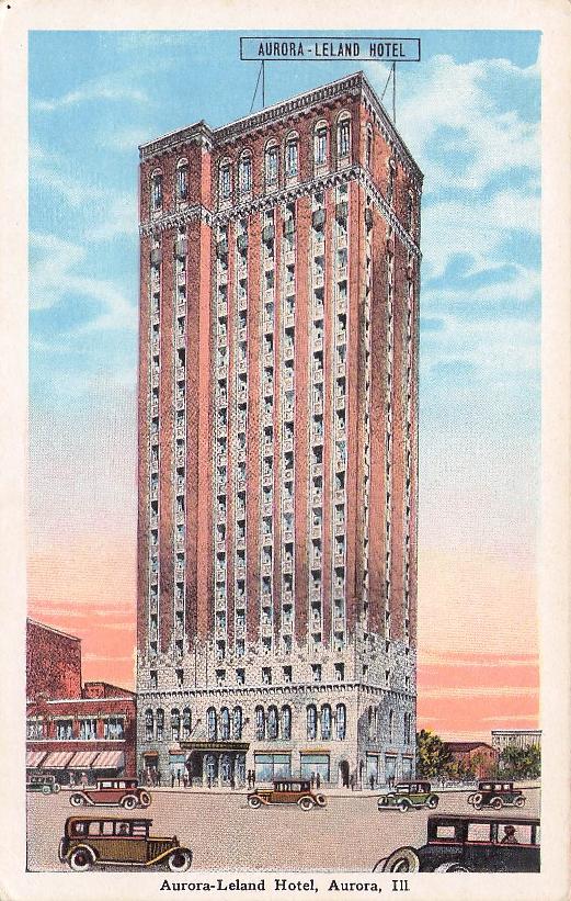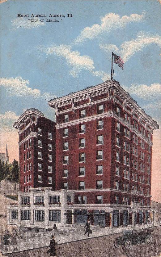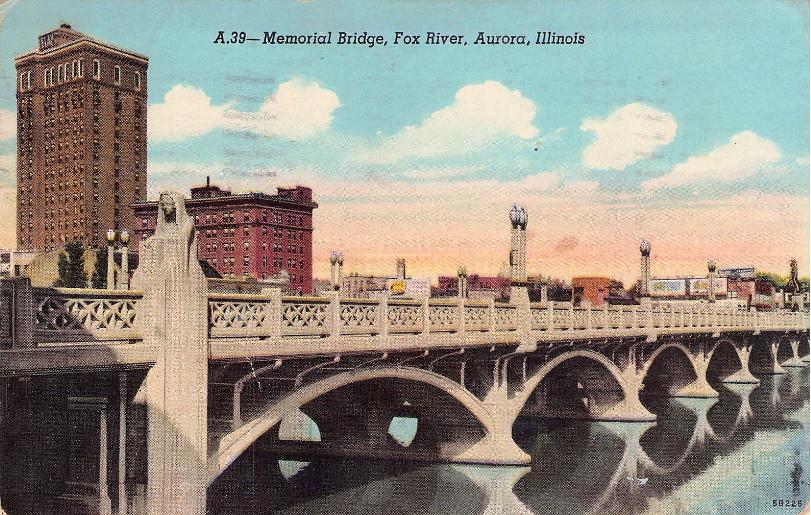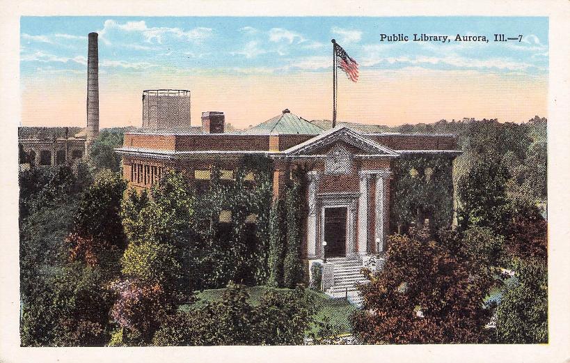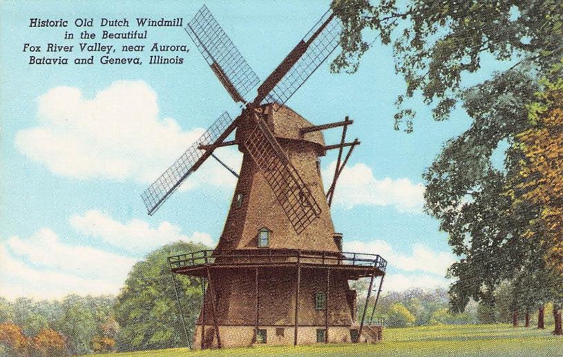 - Post cards: Memorial Bridge and downtown [2 views, one linen, one pmkd. 1955]; Hotel Aurora [c.1920]; Aurora-Leland Hotel [c.1930]; Metzger’s A-1 Cabins [B&W]; Public Library [white border, c.1940]; West Aurora High School [1905]; “Grist Mill at Pioneer Farm” [chrome]; “Old Dutch Windmill... near Aurora” [linen]
