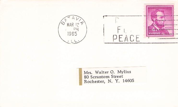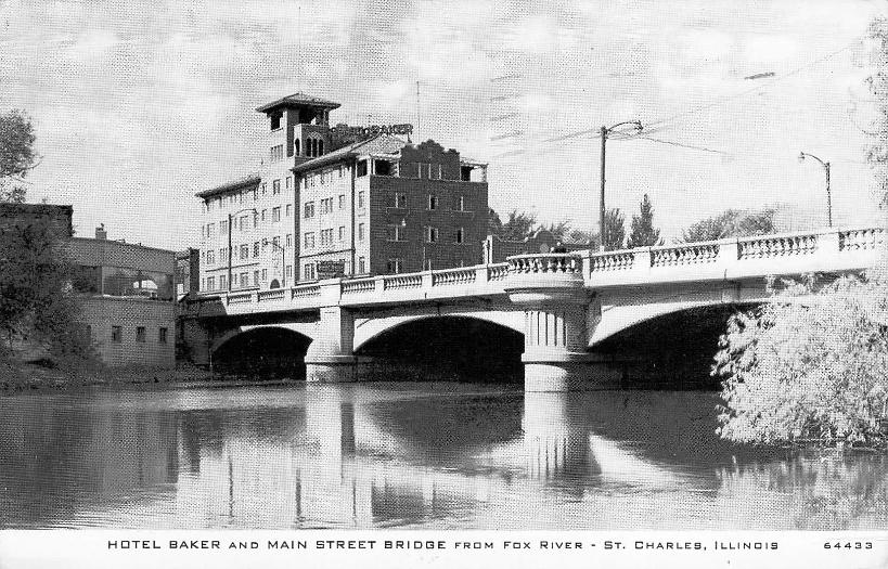 - Saint Charles 1968 machine slogan “Pray for Peace” on post card [Sweden House Smorgasbord, Naperville]. Post cards: State Bank of St. Charles [chrome]; “Hotel Baker and Main Street Bridge” [1957]