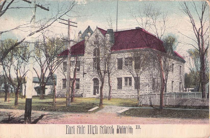 - Batavia 1909 duplex on post card, view of East Side High School; poor 1965 Pray for Peace slogan on 3x5 card. Post card: Batavia Avenue [c.1910]