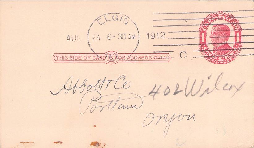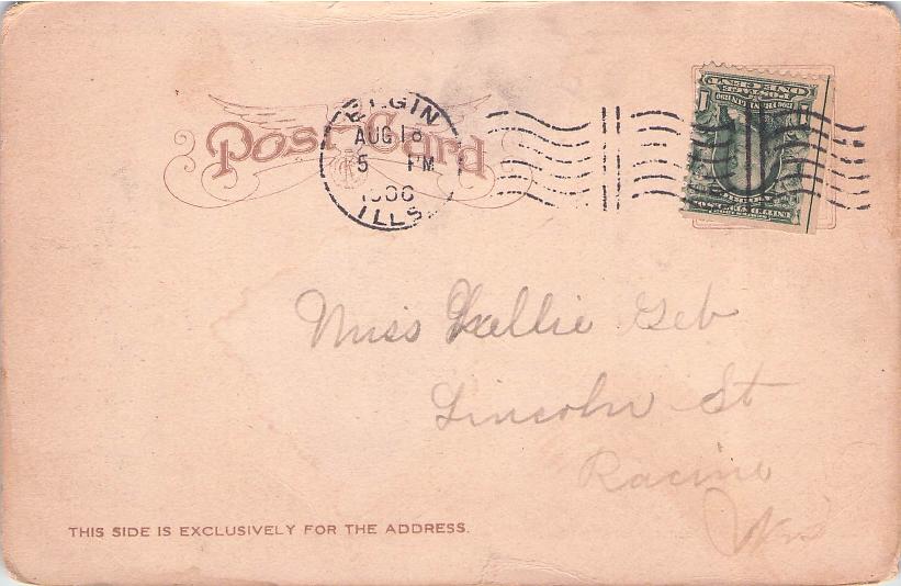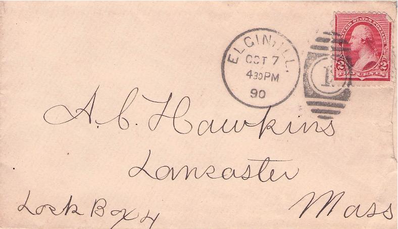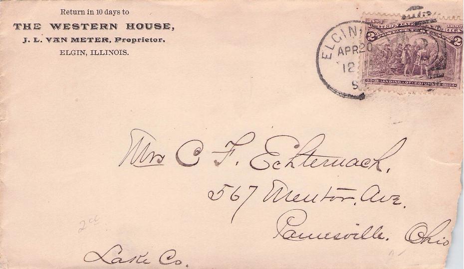 - Elgin 1890 duplex on cover; 1893 duplex on 2¢ Columbian stamp, “The Western House, J.L. Van Meter, Proprietor; 1900 machine cancel on post card; Time-Cummins 1912 machine cancel on Postal card.