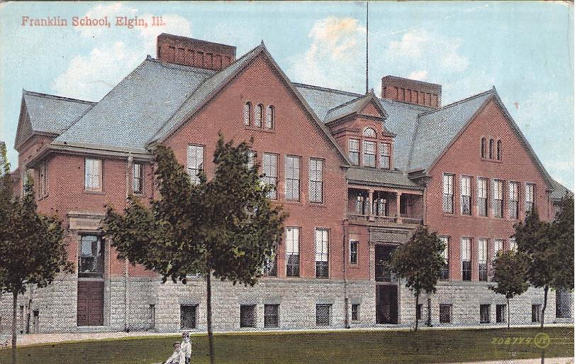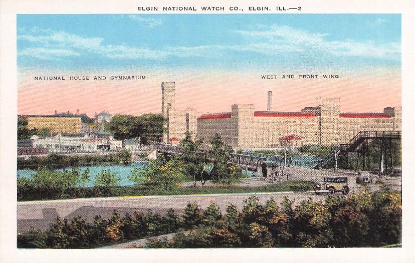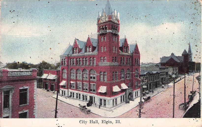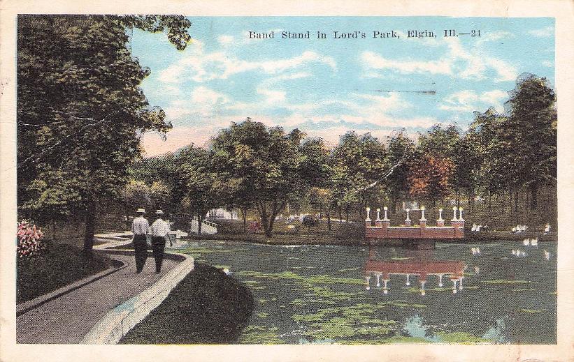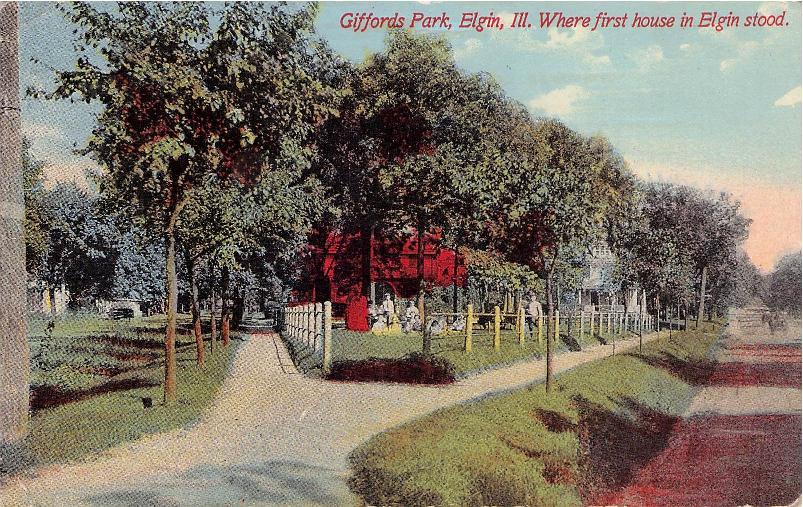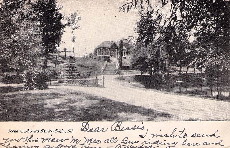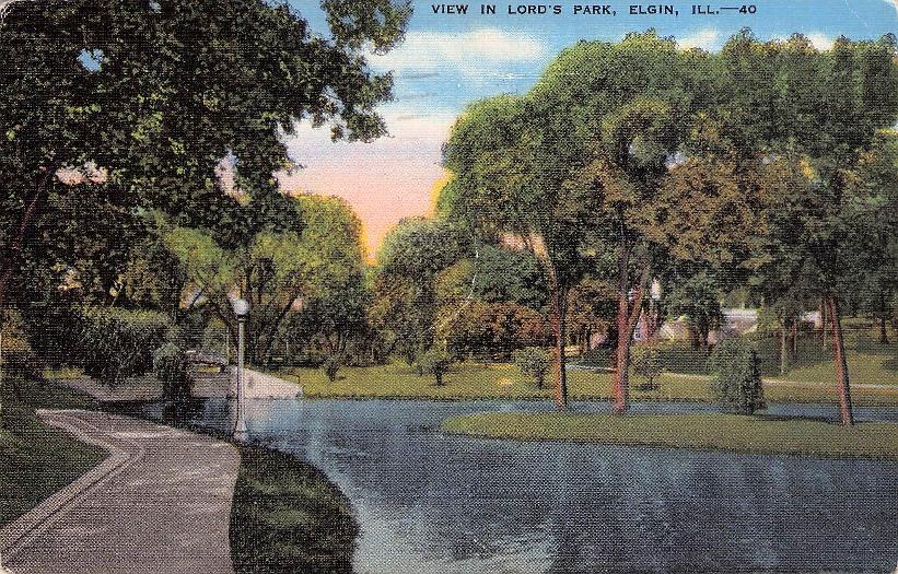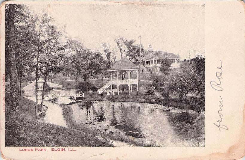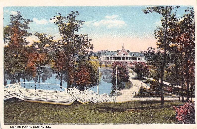- Post cards: Al’s Cafe [chrome]; “Elgin National Watch Co. [white border, c.1930]; City Hall [2 horse-drawn vehicles]; Franklin School [1912]; Judson College campus [chrome]; Gifford’s Park “Where First House in Elgin Stood” [1911]; Lord’s Park [4 views, one B&W, 1906, one 1923, one c.1930. one linen 1951]
