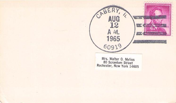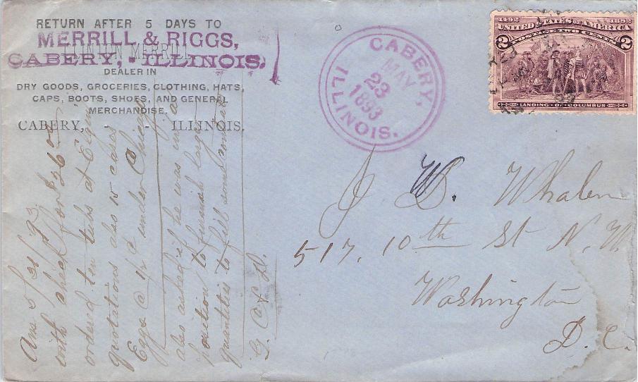 - Carbery 1893 double circle on cover, 2¢ Columbian stamp, “Merrill & Riggs, Drygoods, Groceries, Clothing” corner; 1965 machine cancel on 3x5 card