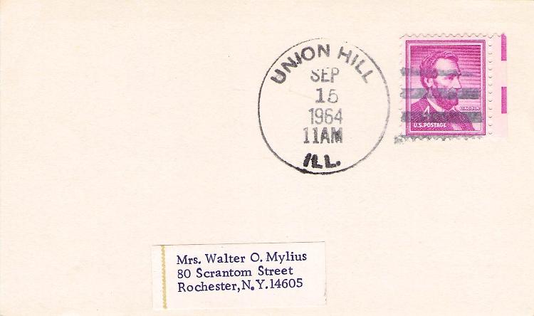 - Union Hill 1964 machine cancel on 3x5 card