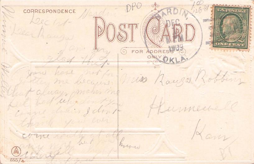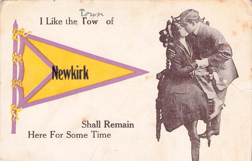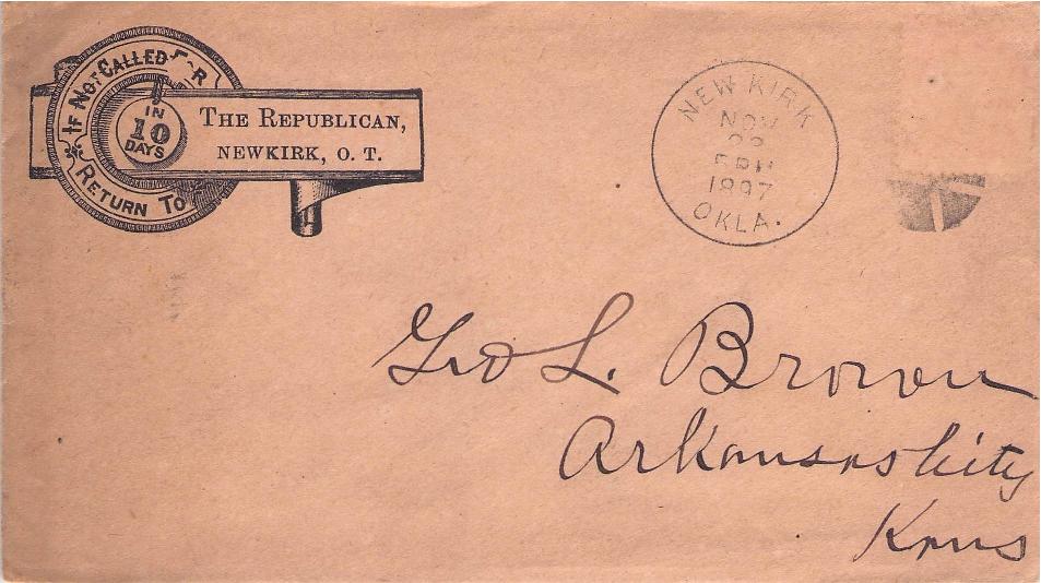 Newkirk 1897 cds on cover ”The Republican” corner, stamp missing; unreadable c.1920 date-our duplex on Newkirk pennant post card