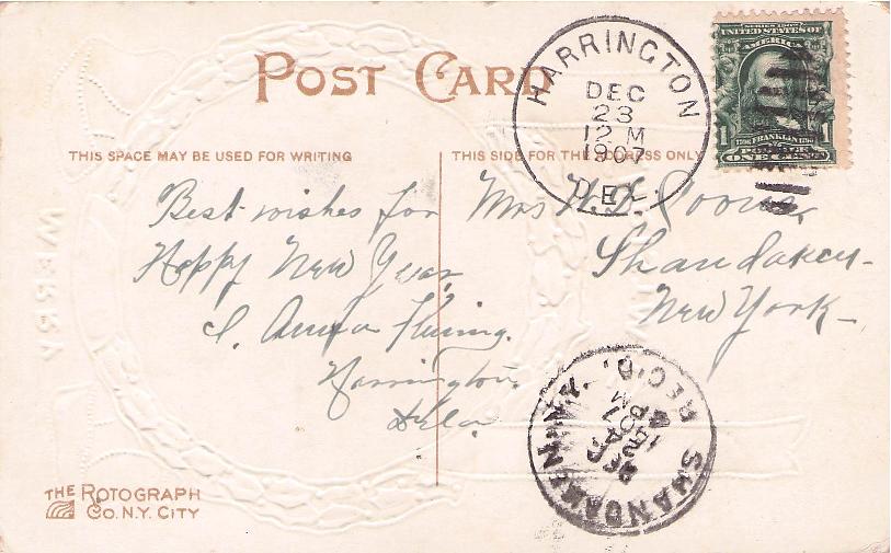 Harrington 1907 duplex on post card, also Sandaken NY Rec’d.