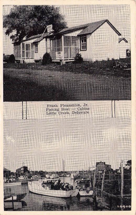 Little Creek Post card: “Fishing Boat - Cabins” [B&W]