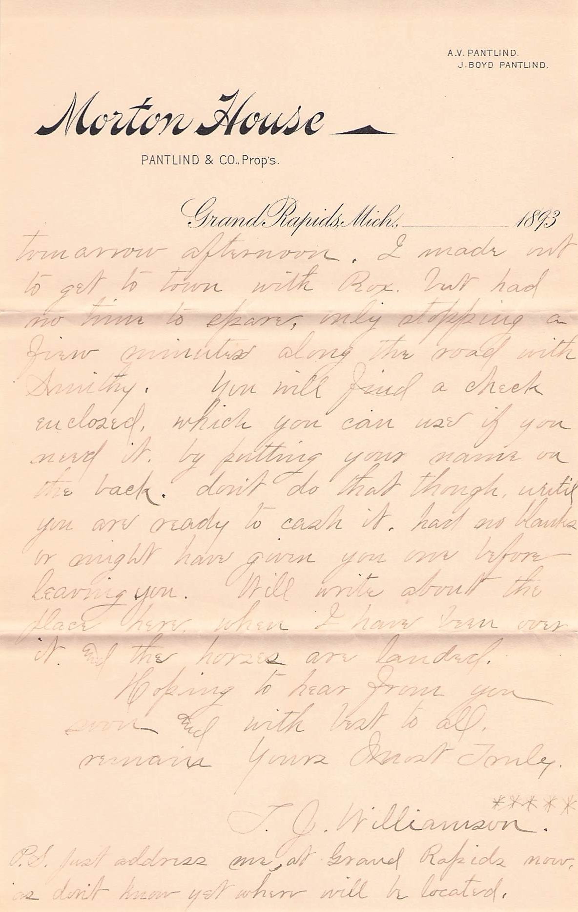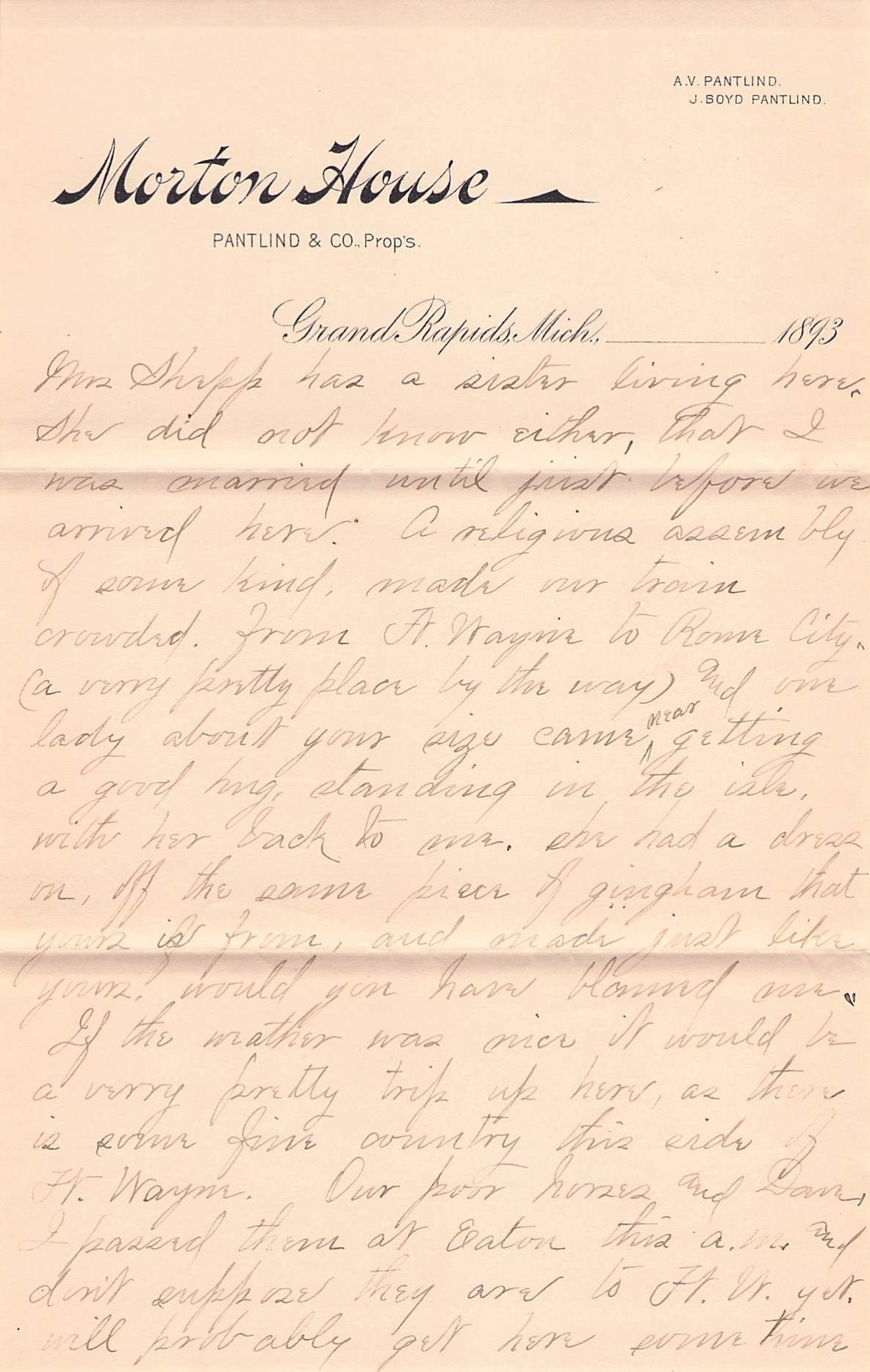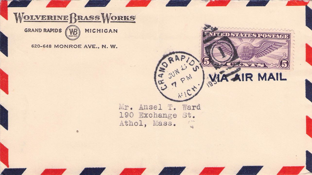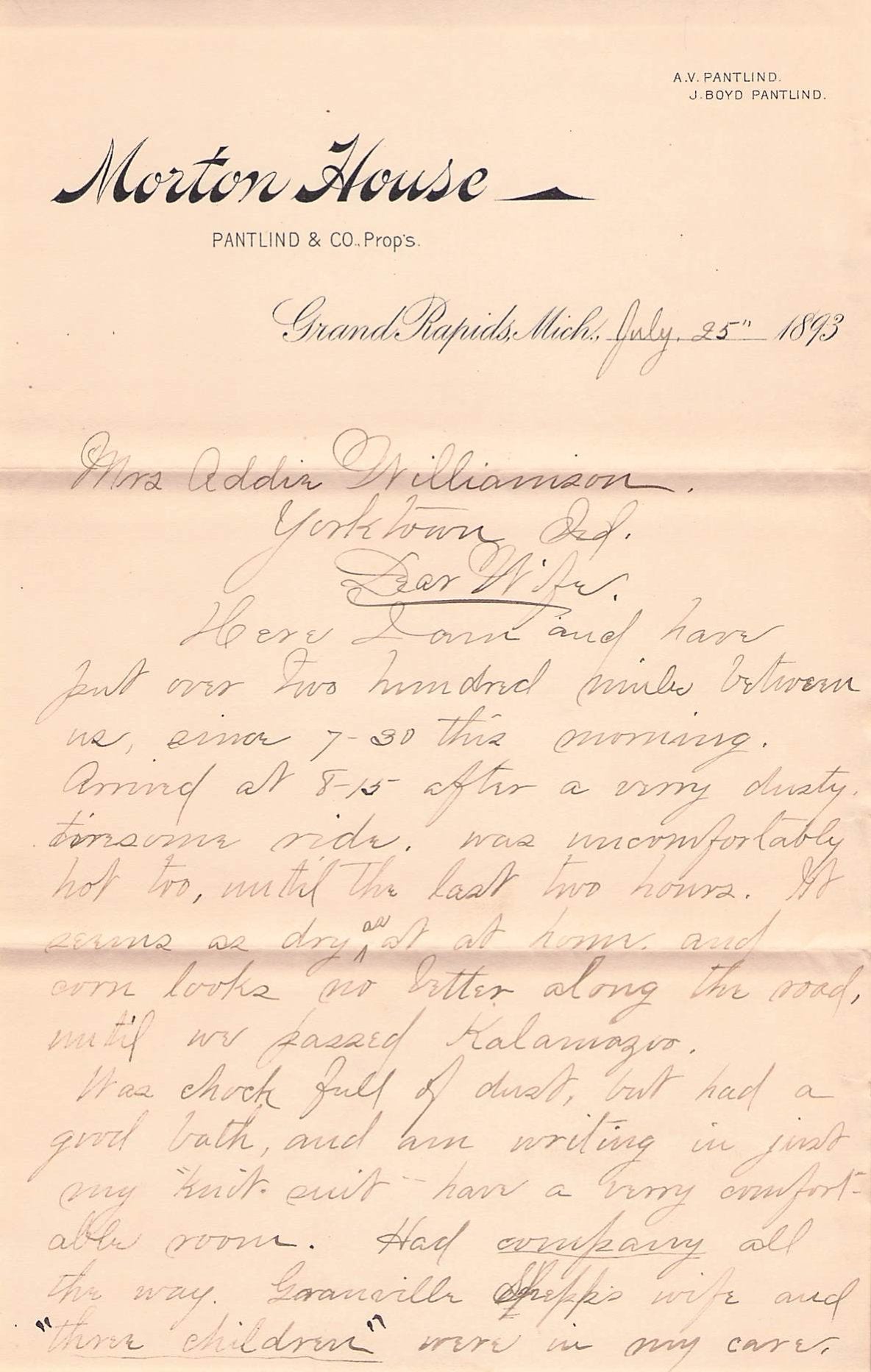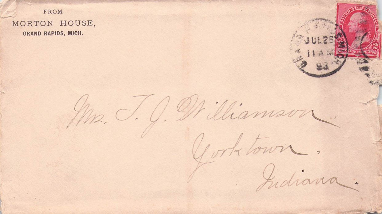 Grand Rapids poor 1893 duplex on cover (opened ragged right into stamp) with Morton House corner and original contents on Morton House stationery; 1932 date-out duplex on air mail cover (5¢ Air Mail stamp) with corner of Wolverine Brass Works; scrunched 1963 machine cancel on cover