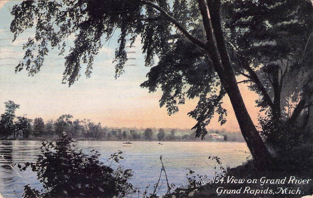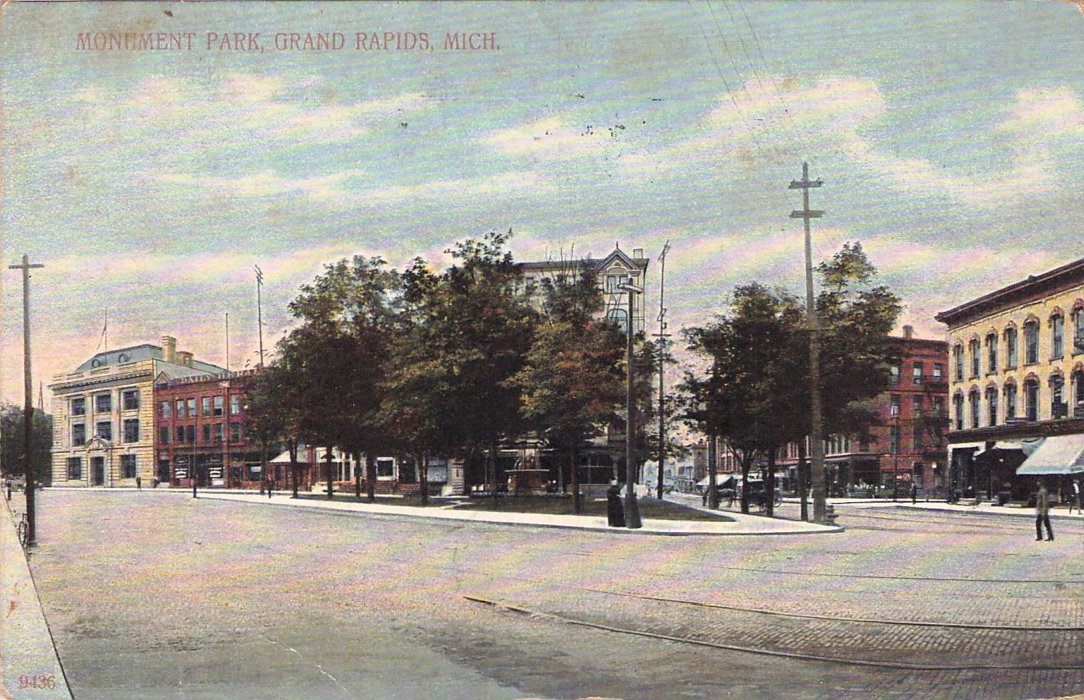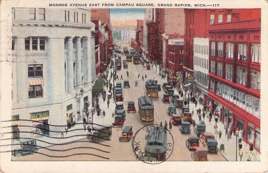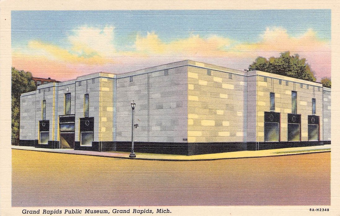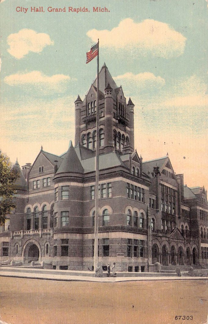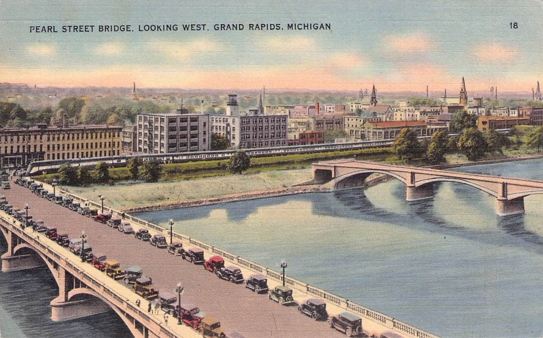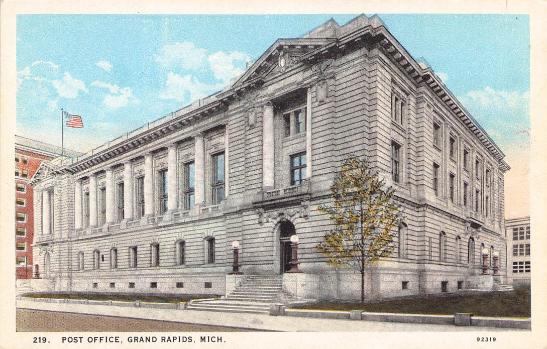 Post cards: Downtown, aerial view [linen]; Skyline, river [chrome]; Monroe Ave., bird’s-eye view [linen]; “Pearl Street Bridge Looking West” over downtown [linen]; “Monroe Avenue East from Campau Square” [1931 - Bakersfield Cal. rec’g mark on front]; Monument Park and street scene [1910]; Hermitage Building [c.1910]; Morton Hotel [B&W]; Pantlind Hotel [2 views, one linen, one chrome]; Butterworth Hospital [linen]; St. Mary’s Hospital [1917]; Post Office [c.1940]; Union Station [c.1910]; Kent County Court House[c.1910]; City Hall [1914]; Ryerson Library [1910]; Museum [2 views, one linen, one chrome]; Masonic Temple [linen]; Masonic Home [c.1910]; Main Building, Soldiers’ Home [linen]; “Michigan Veterans’ Facility - R.V. Gay Memorial Bldg.” (B&W); High School (B&W) [1906]; Calvin College [2 views, one linen, one chrome]; Fox Residence [1914]; Pavilion and Dock, Reeds Lake [1910]; John Hall Park [c.1910]; “A View on Grand River” [1911]