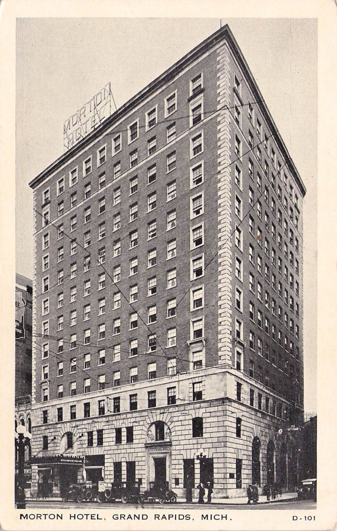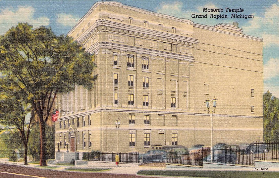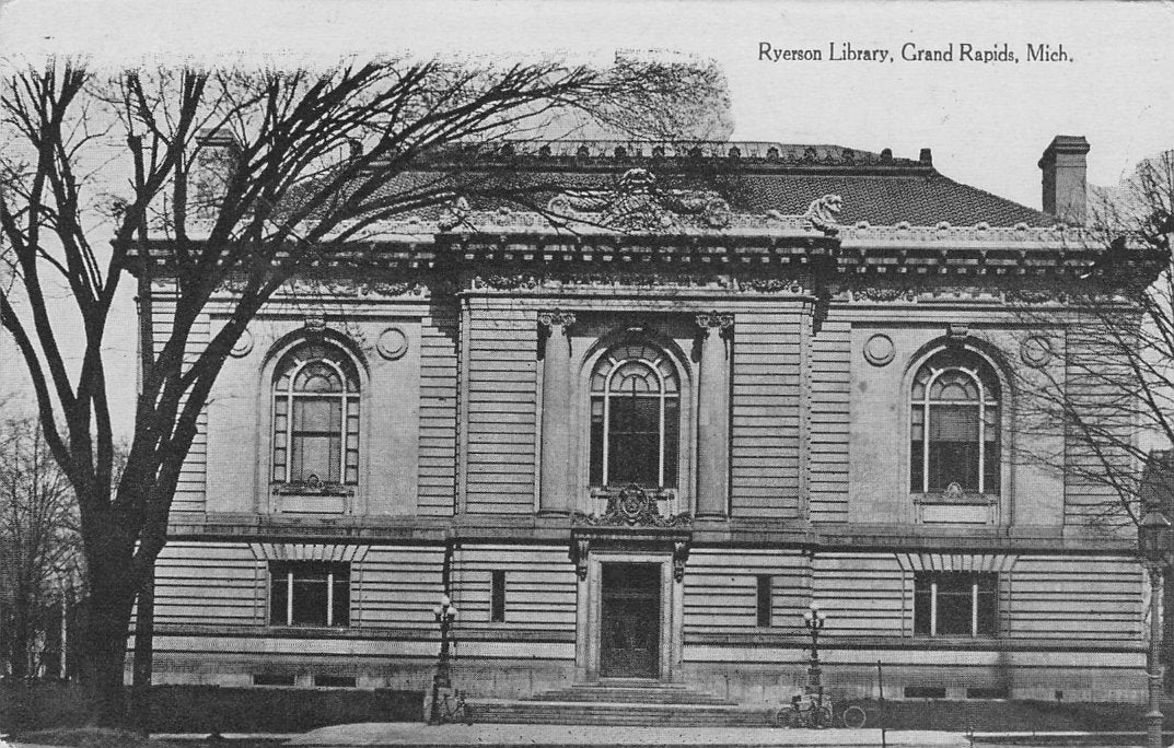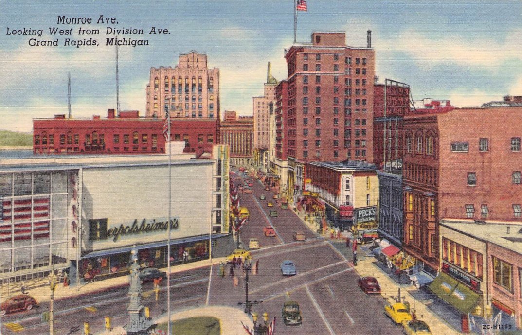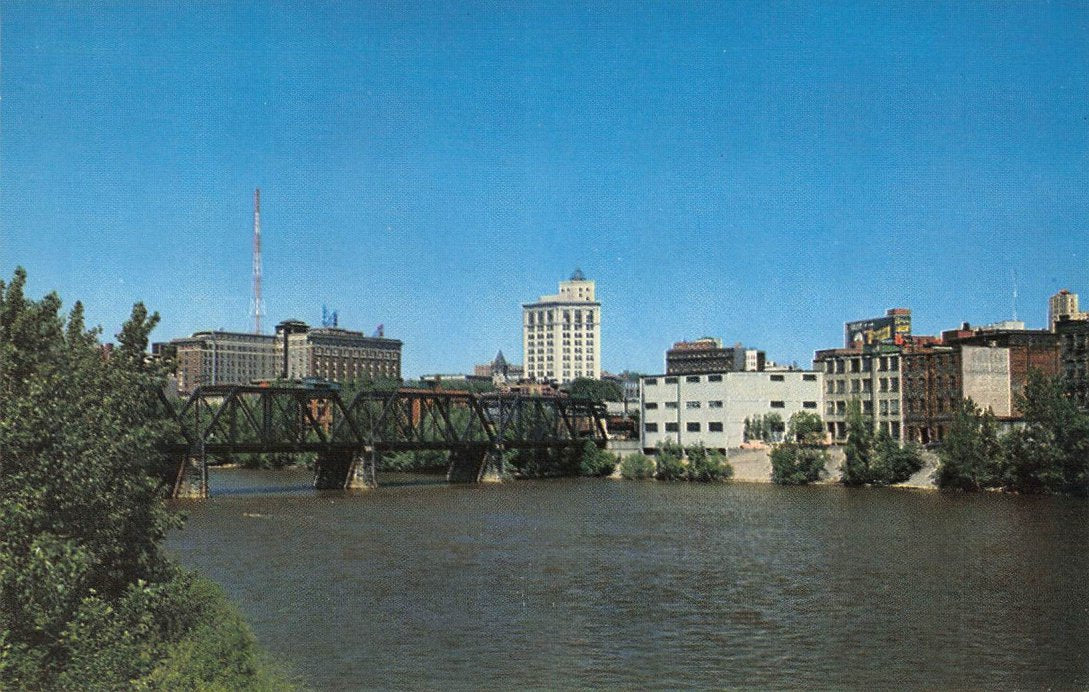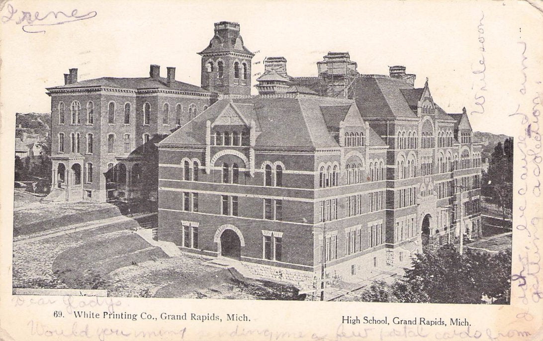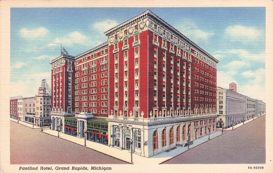 Post cards: Downtown, aerial view [linen]; Skyline, river [chrome]; Monroe Ave., bird’s-eye view [linen]; “Pearl Street Bridge Looking West” over downtown [linen]; “Monroe Avenue East from Campau Square” [1931 - Bakersfield Cal. rec’g mark on front]; Monument Park and street scene [1910]; Hermitage Building [c.1910]; Morton Hotel [B&W]; Pantlind Hotel [2 views, one linen, one chrome]; Butterworth Hospital [linen]; St. Mary’s Hospital [1917]; Post Office [c.1940]; Union Station [c.1910]; Kent County Court House[c.1910]; City Hall [1914]; Ryerson Library [1910]; Museum [2 views, one linen, one chrome]; Masonic Temple [linen]; Masonic Home [c.1910]; Main Building, Soldiers’ Home [linen]; “Michigan Veterans’ Facility - R.V. Gay Memorial Bldg.” (B&W); High School (B&W) [1906]; Calvin College [2 views, one linen, one chrome]; Fox Residence [1914]; Pavilion and Dock, Reeds Lake [1910]; John Hall Park [c.1910]; “A View on Grand River” [1911]
