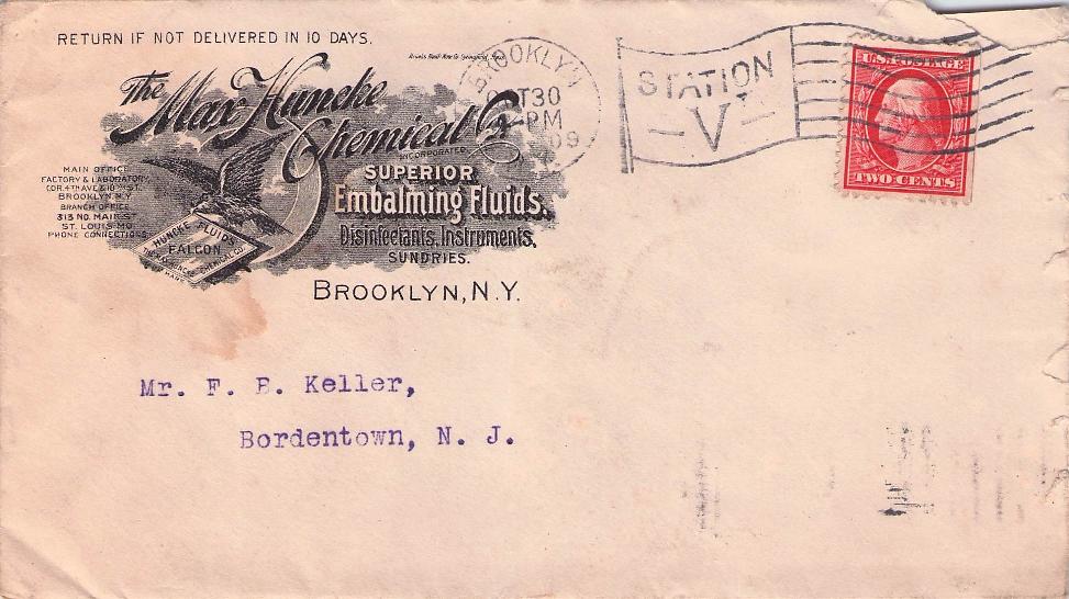 Sta. V 1909 wavy machine cancel on cover with fancy corner “Max Huncke Chemicals, Superior Embalming Fluids”