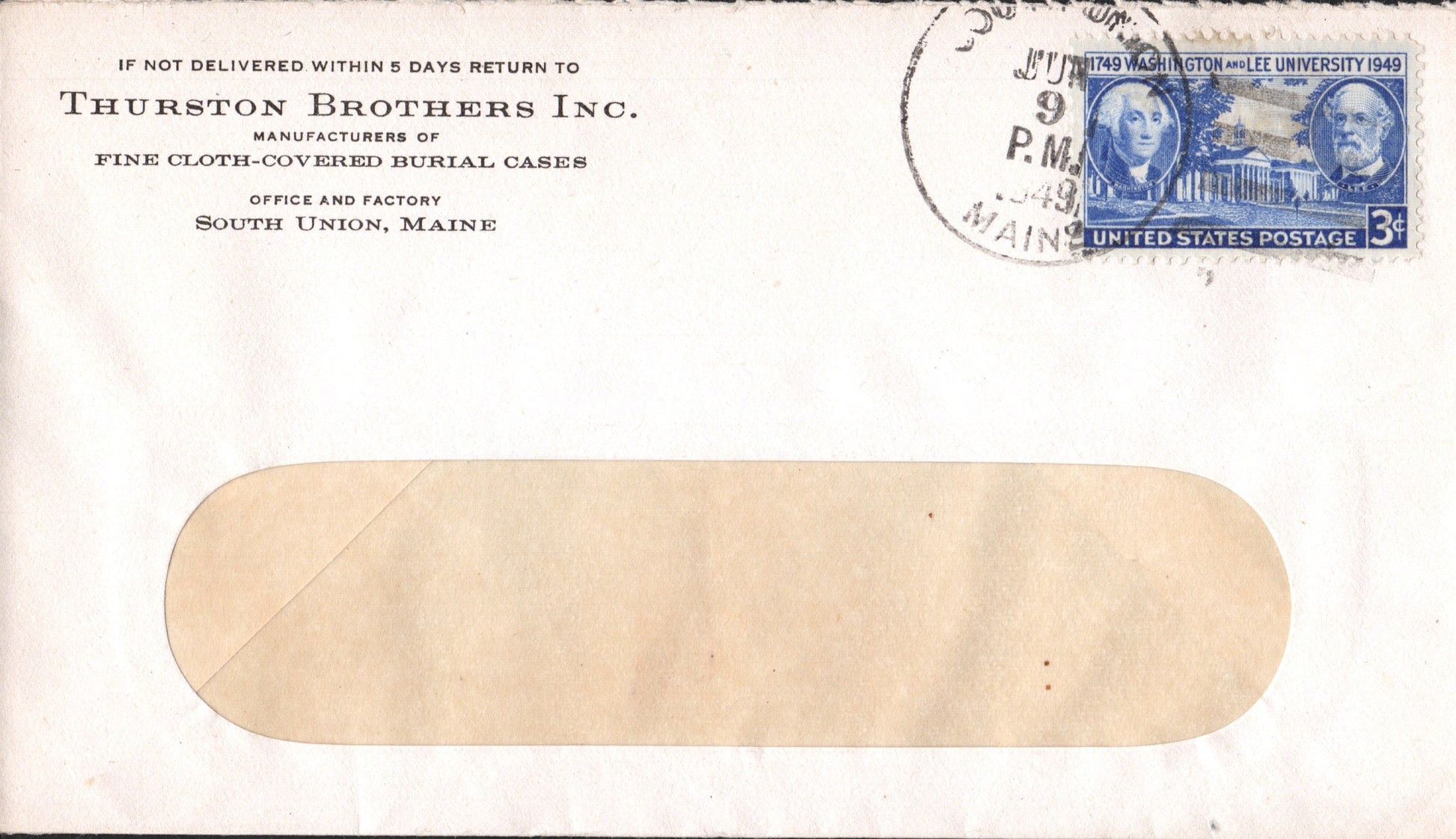 South Union (1879-1953) poor 1949 4-bar on cover, “Thurston Brothers Inc., Burial Cases” corner
