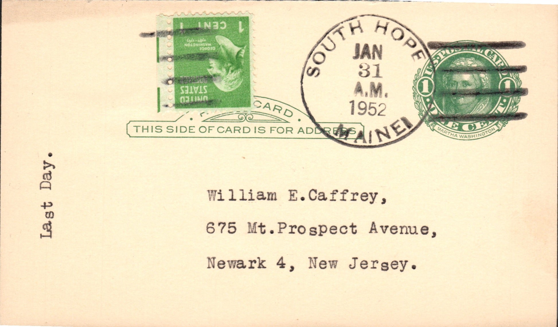 South Hope (1848-1957) 1957 4-bar on LD Postal Card