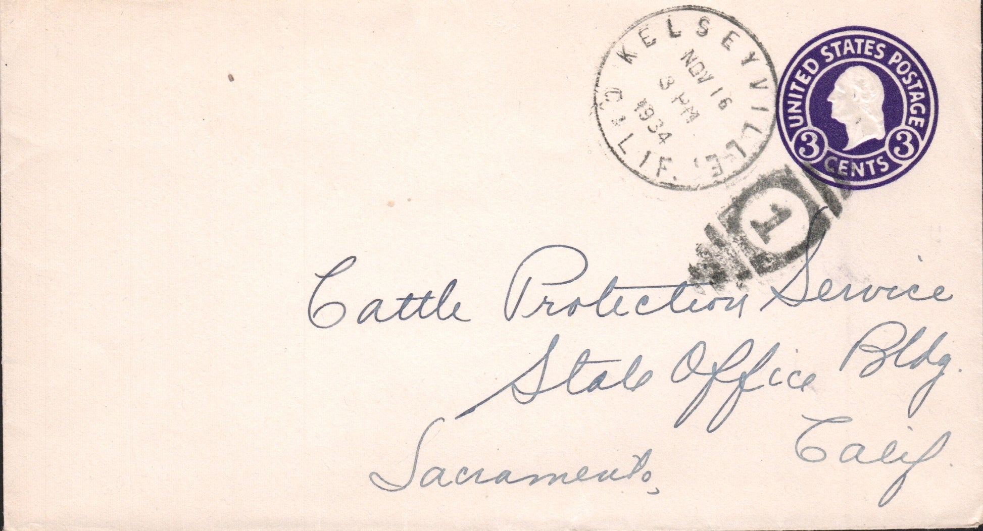 Kelseyville 1934 duplex on cover; 1958 machine cancel on cover