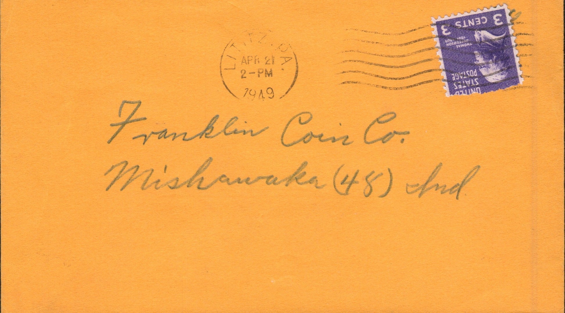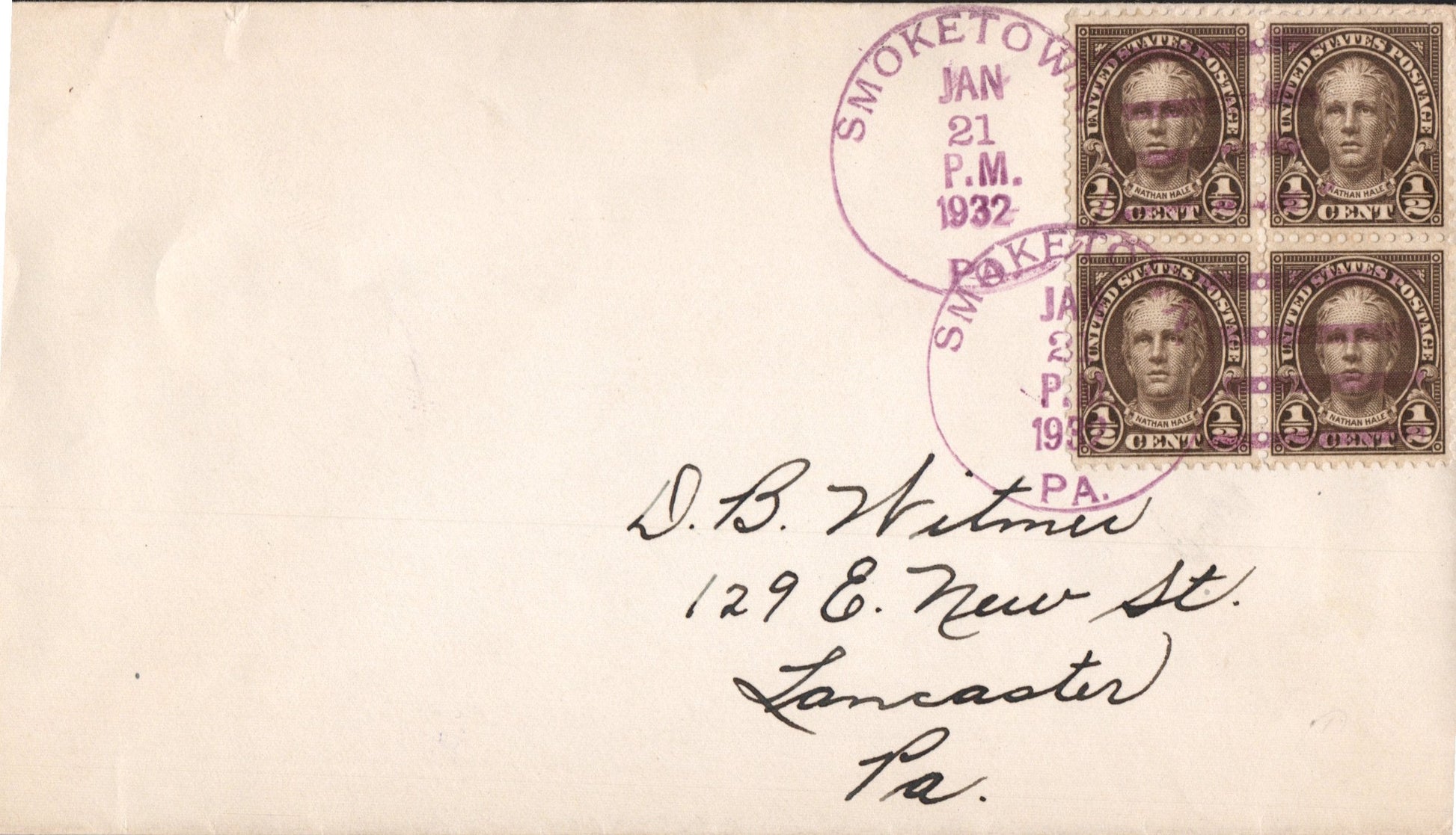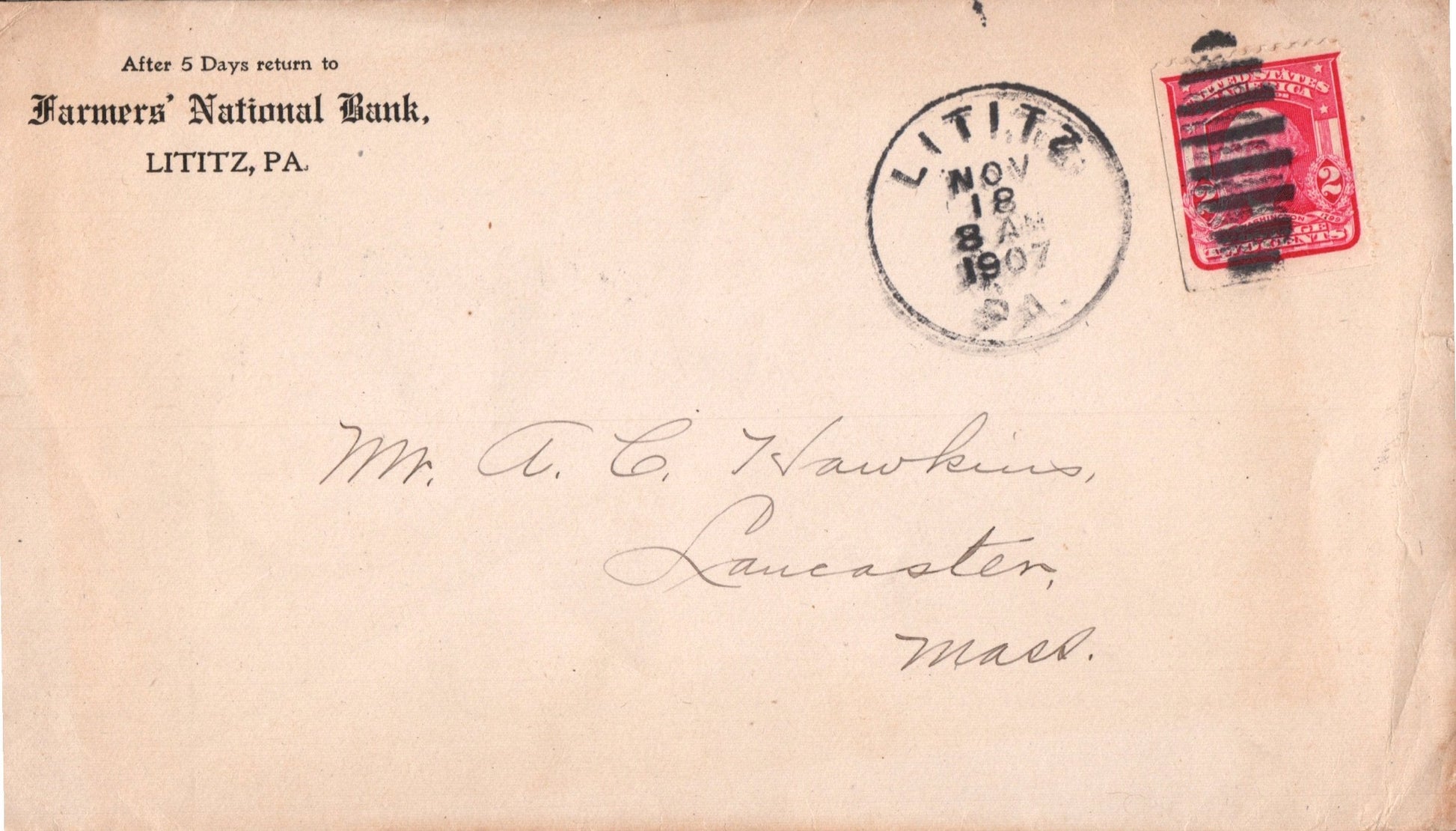 Lititz 1907 duplex on cover, “Farmers’ National Bank” corner; poor 1949 machine cancel on cover