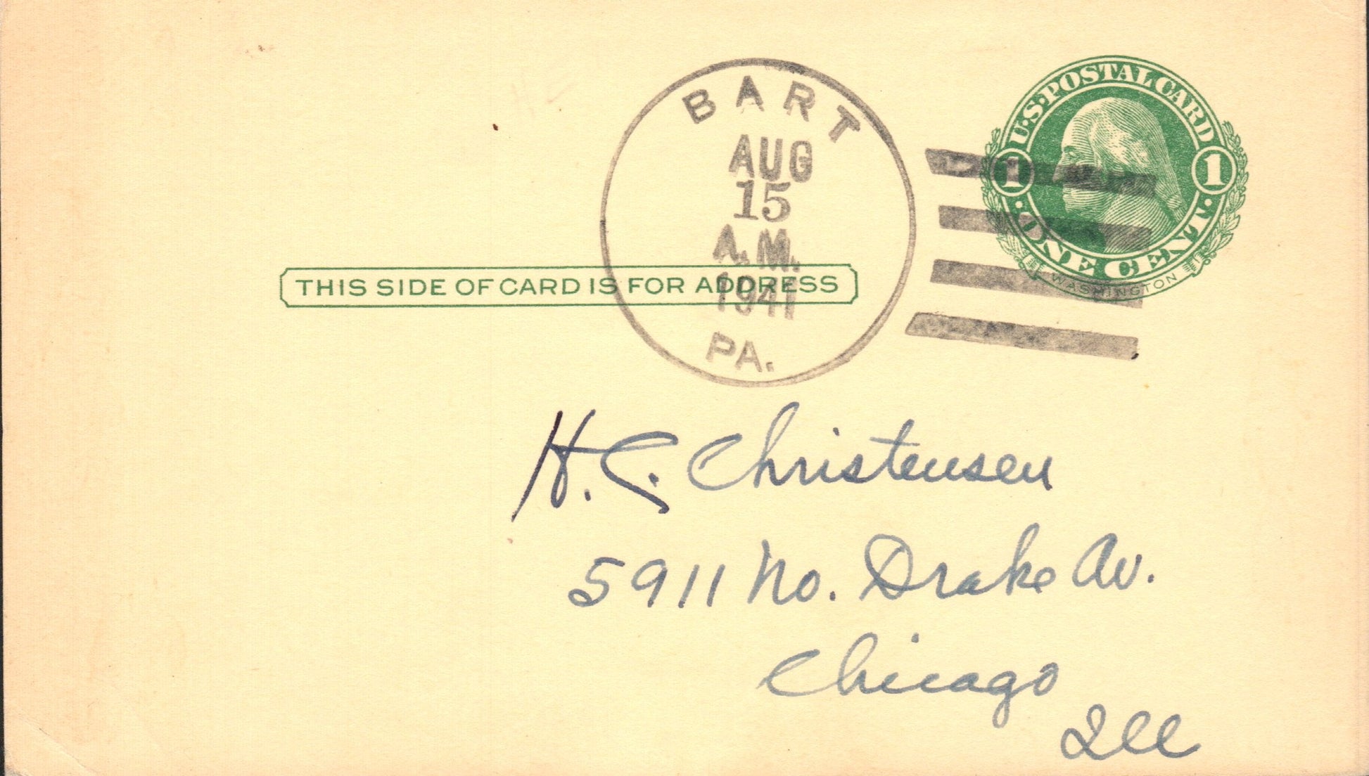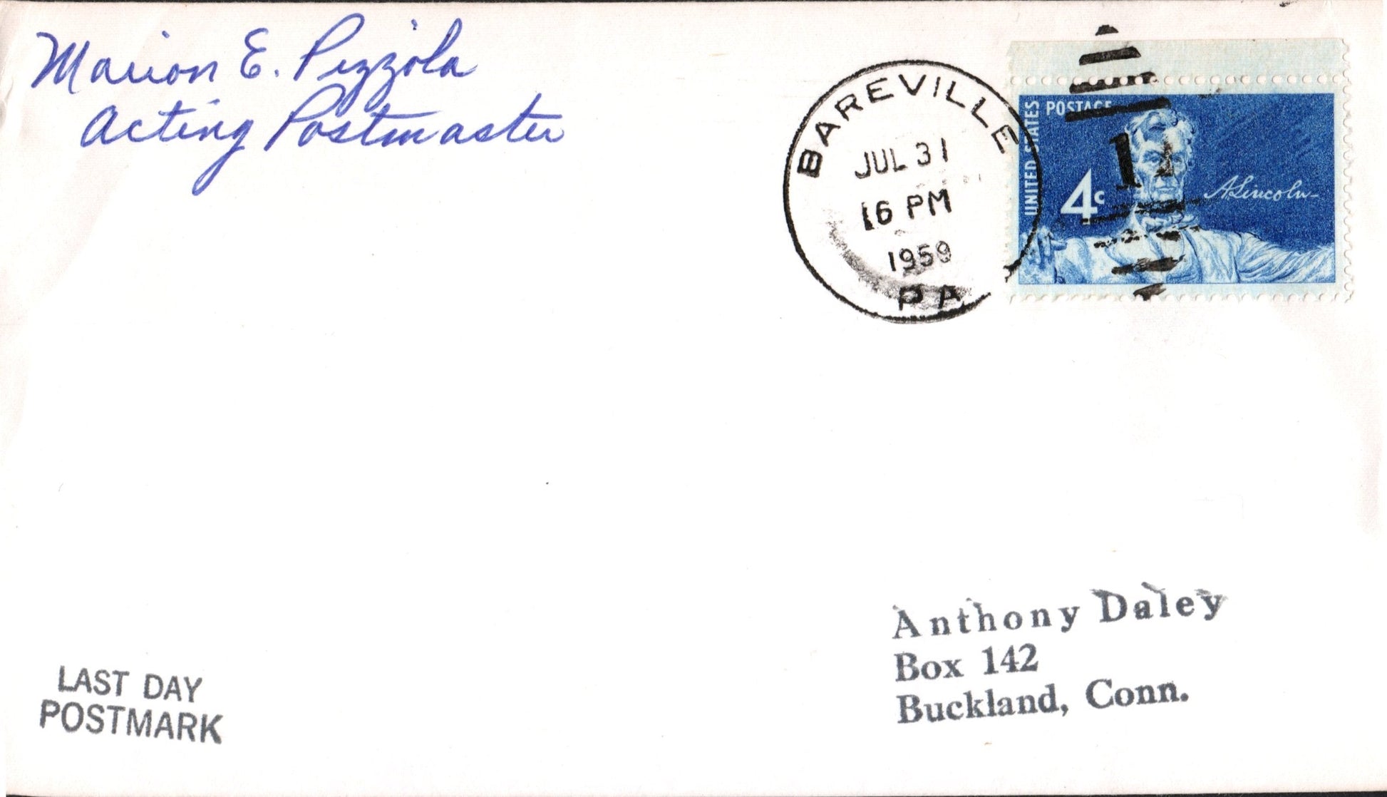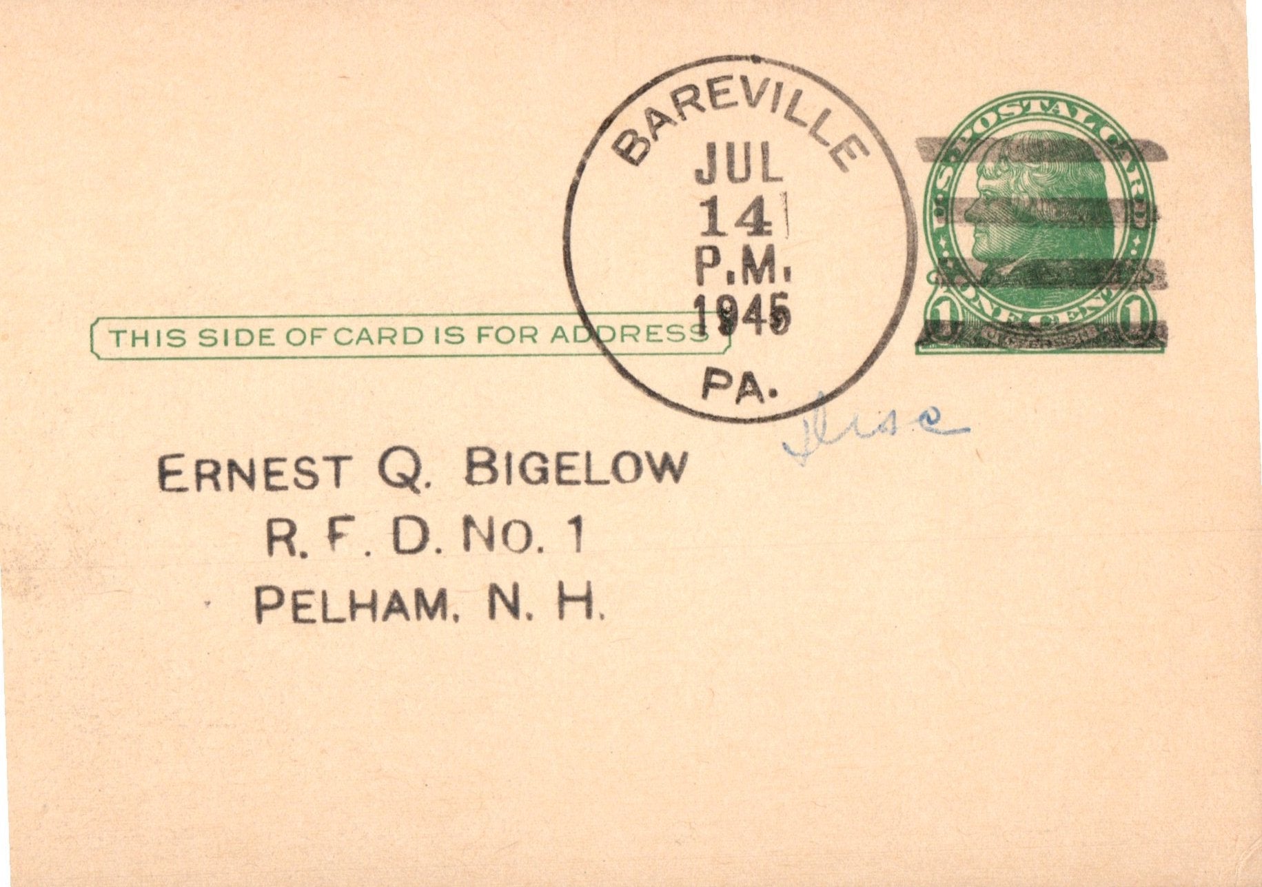 Bareville (1845-1959) 1945 4-bar on Postal Card; 1959 duplex on LD cover, Act. P.M. autograph
