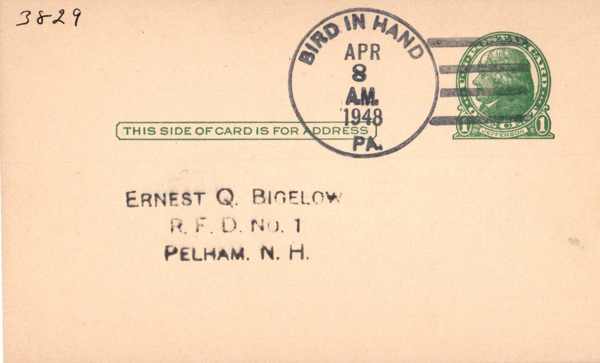Bird in Hand 1948 4-bar on Postal Card; 1969 4-bar on cover.