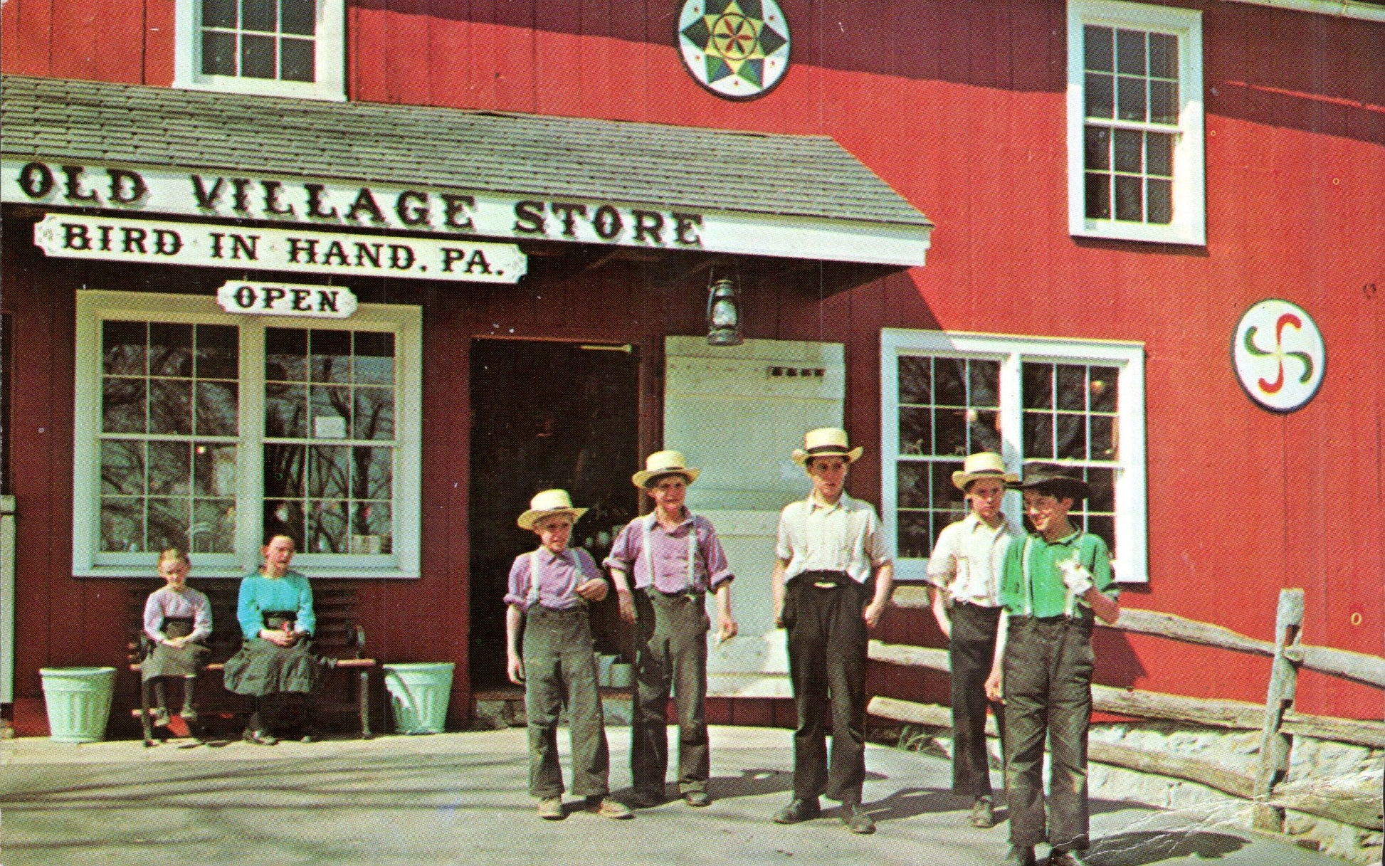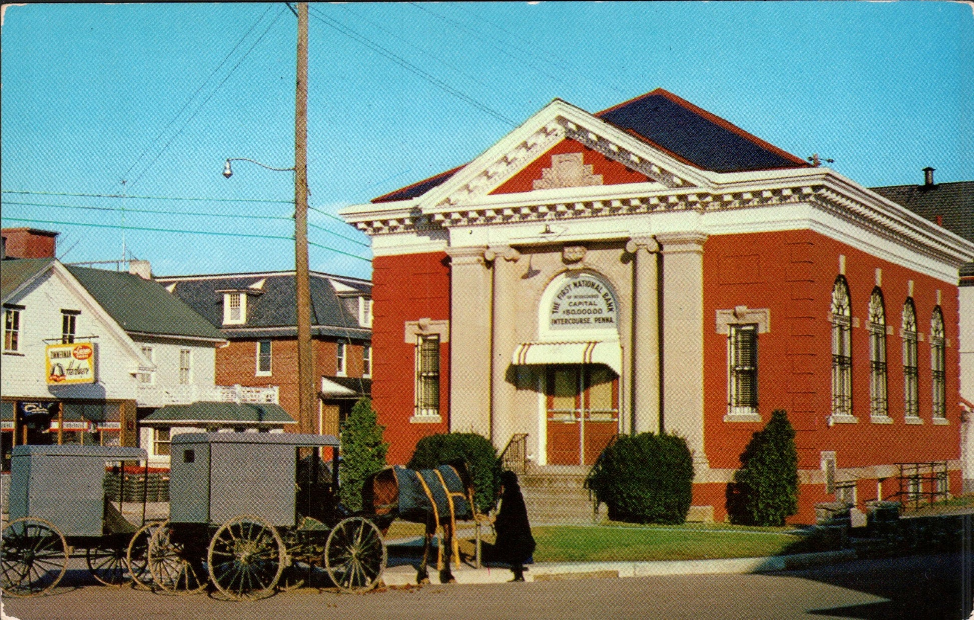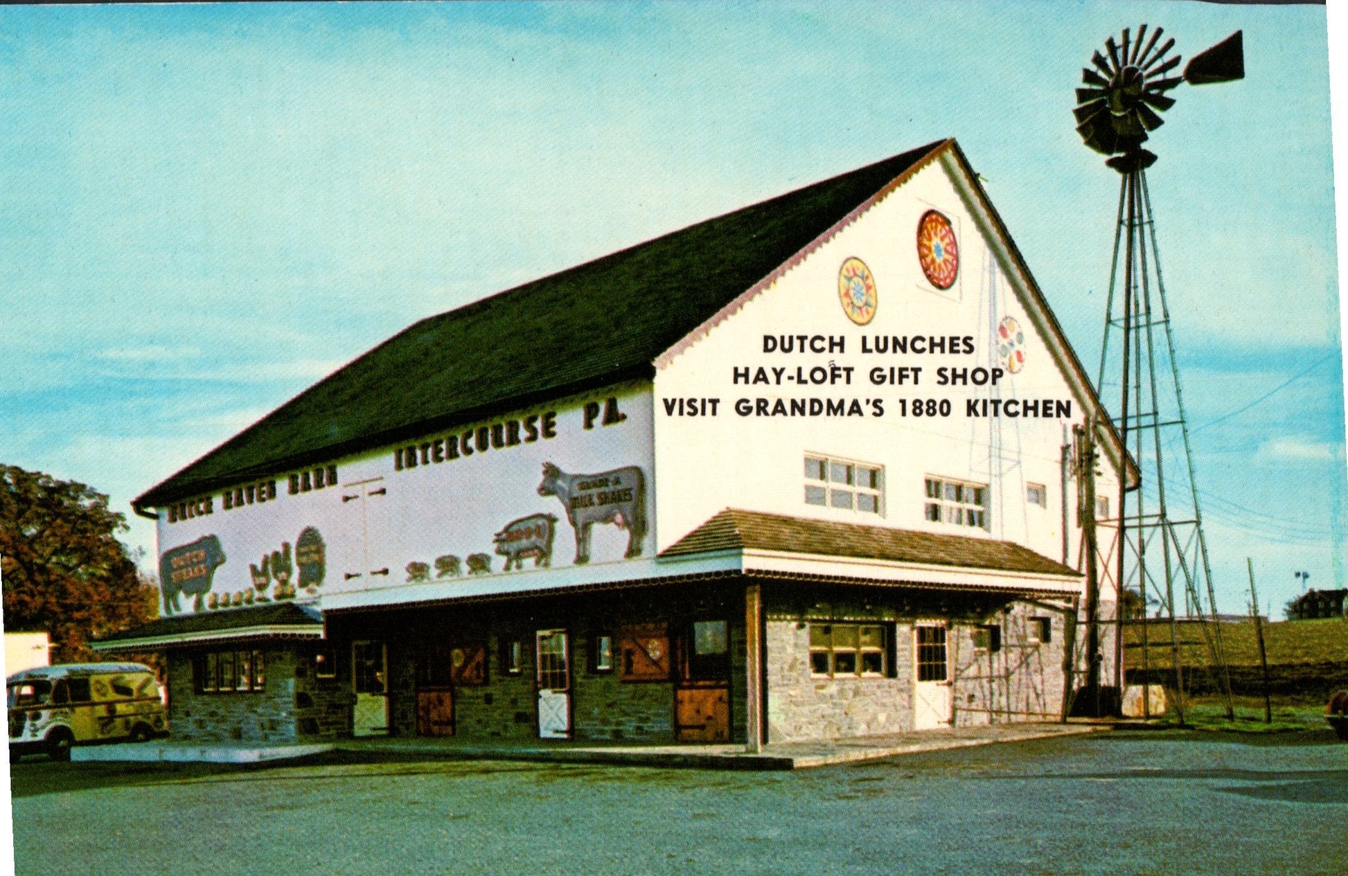 Post cards: Bank [chrome]; Dutch Haven Barn [chrome]; Old Schoolhouse [chrome]; Plain & Fancy Farm [chrome, crease]; Travelers’ Rest Motel [chrome, 1969]