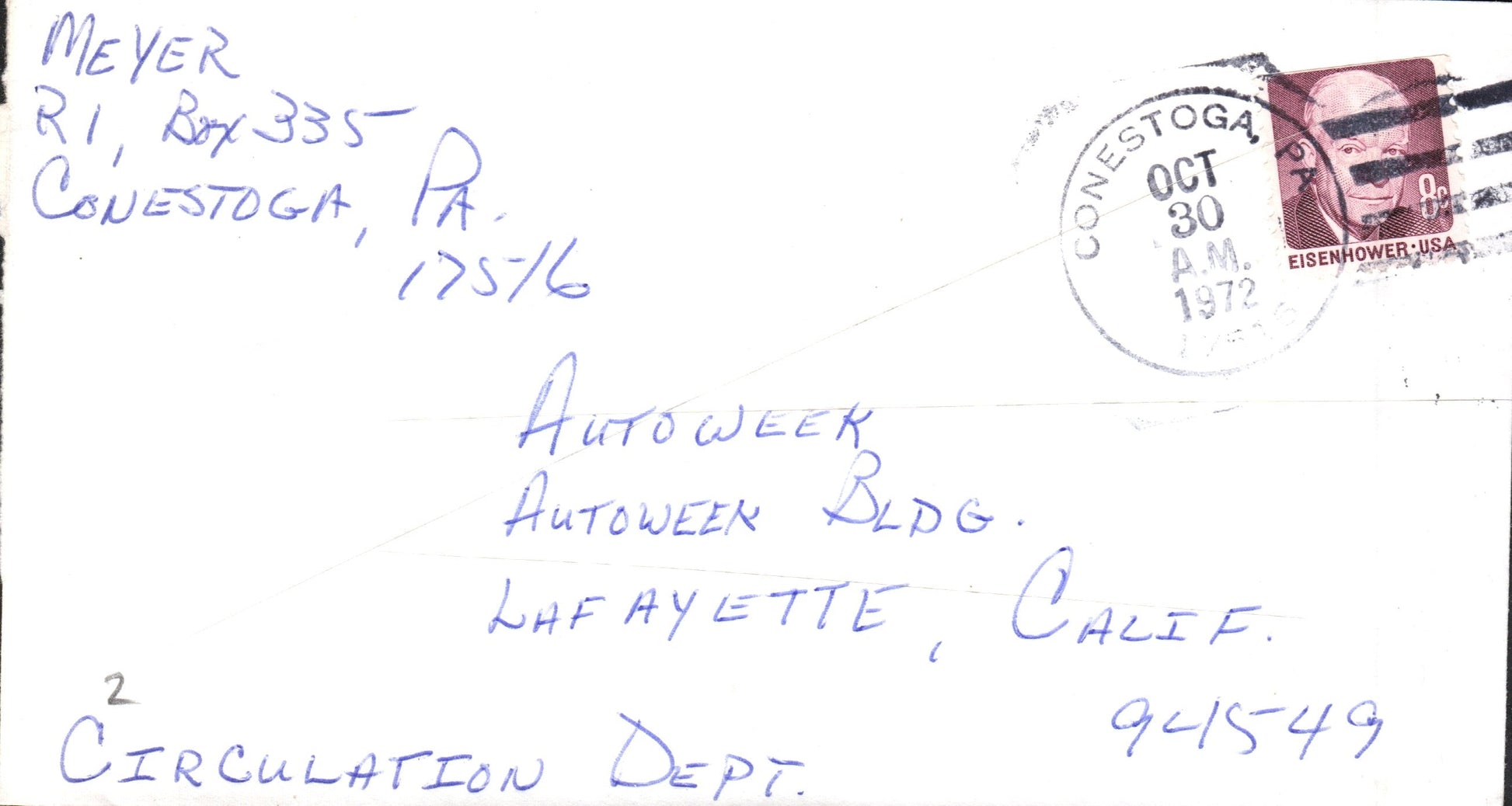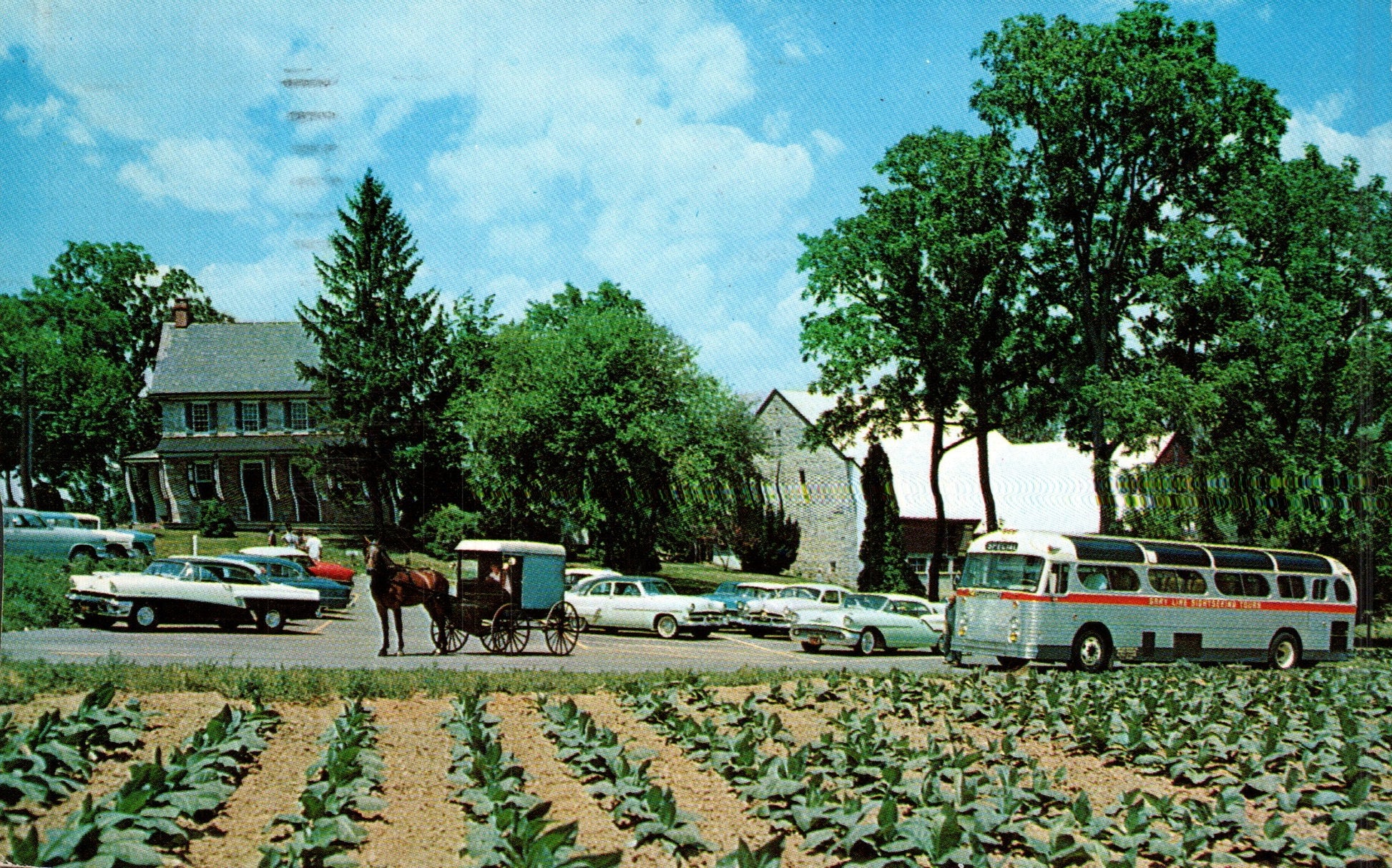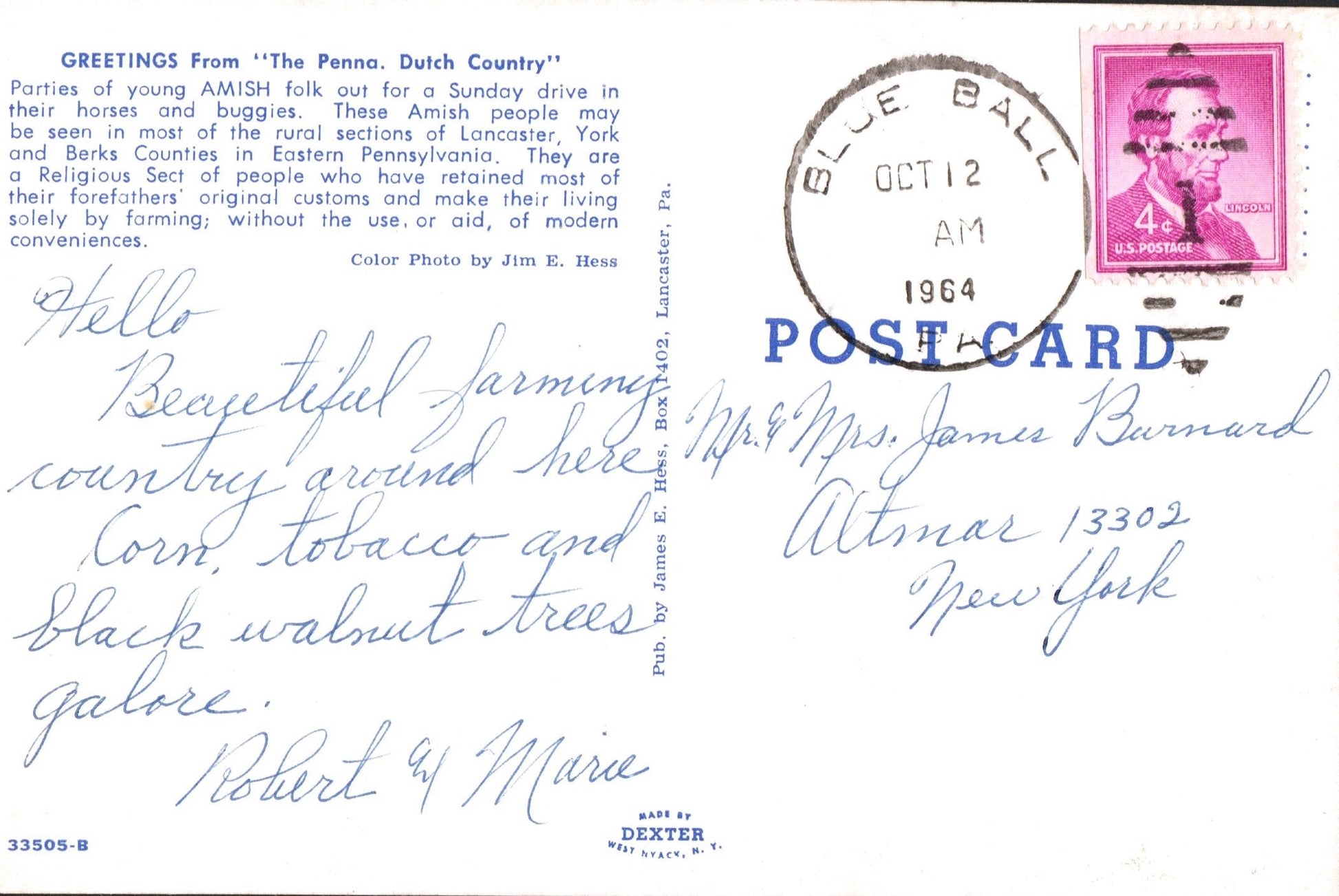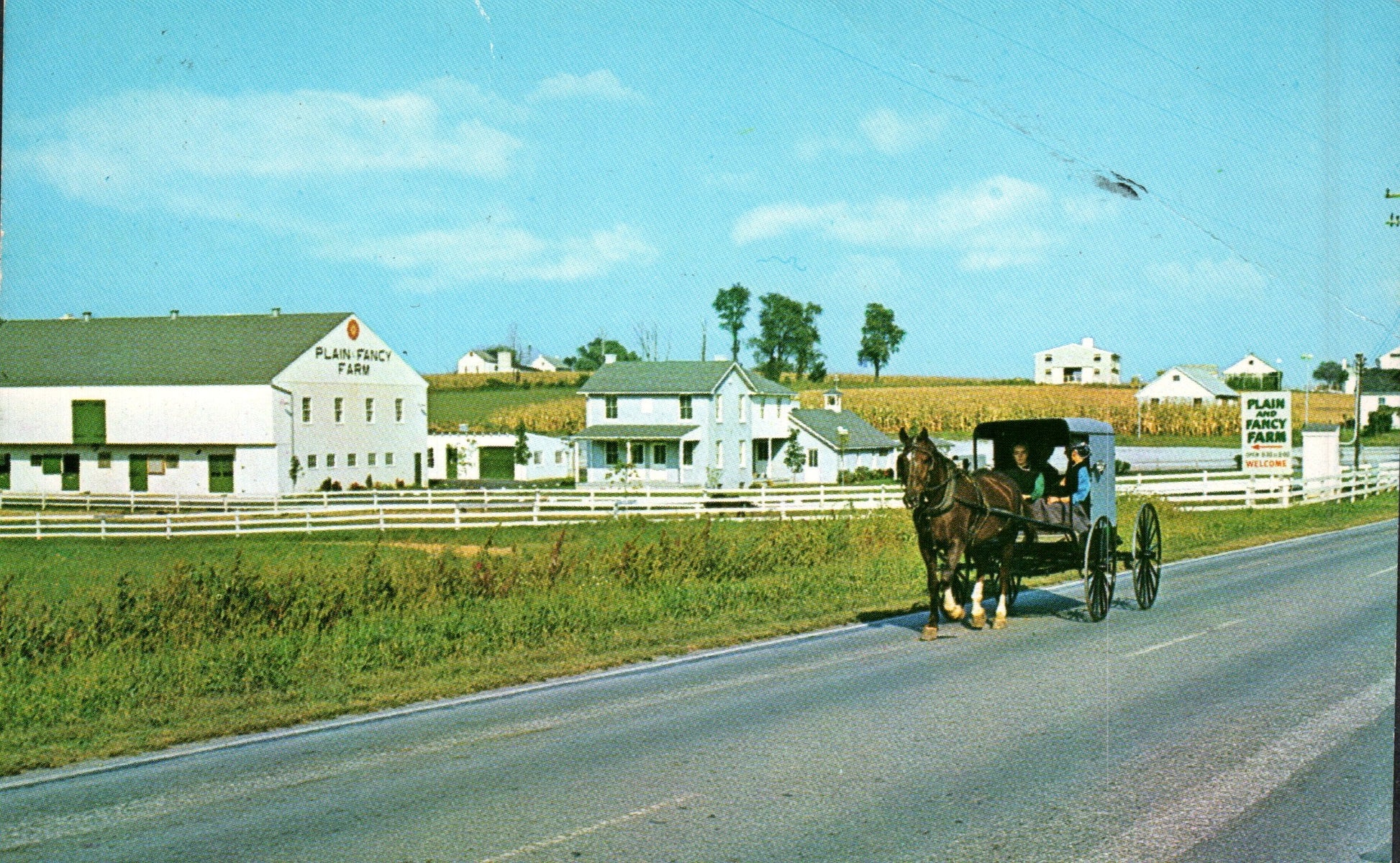 Blue Ball 1964 duplex on post card, Amish vehicles