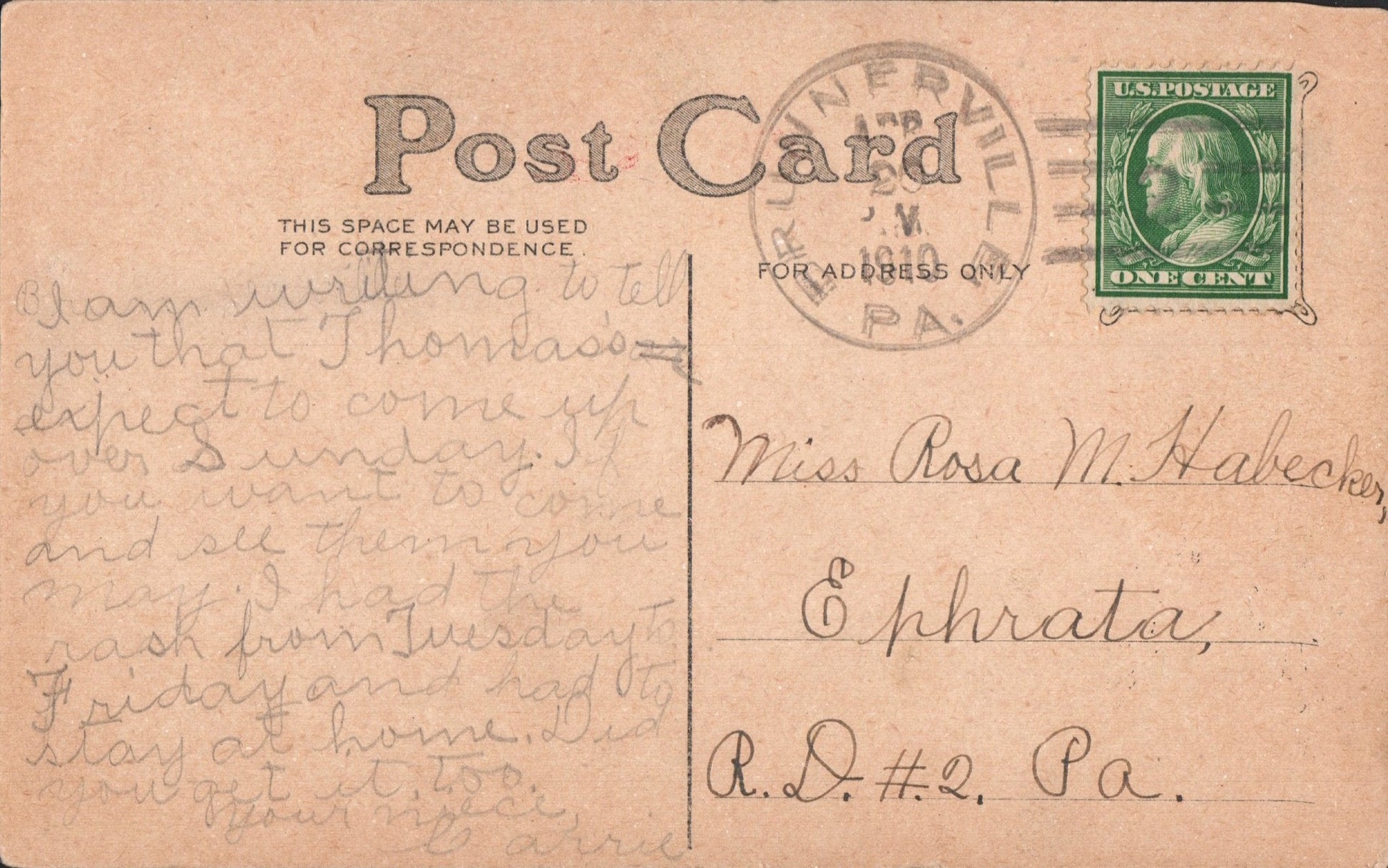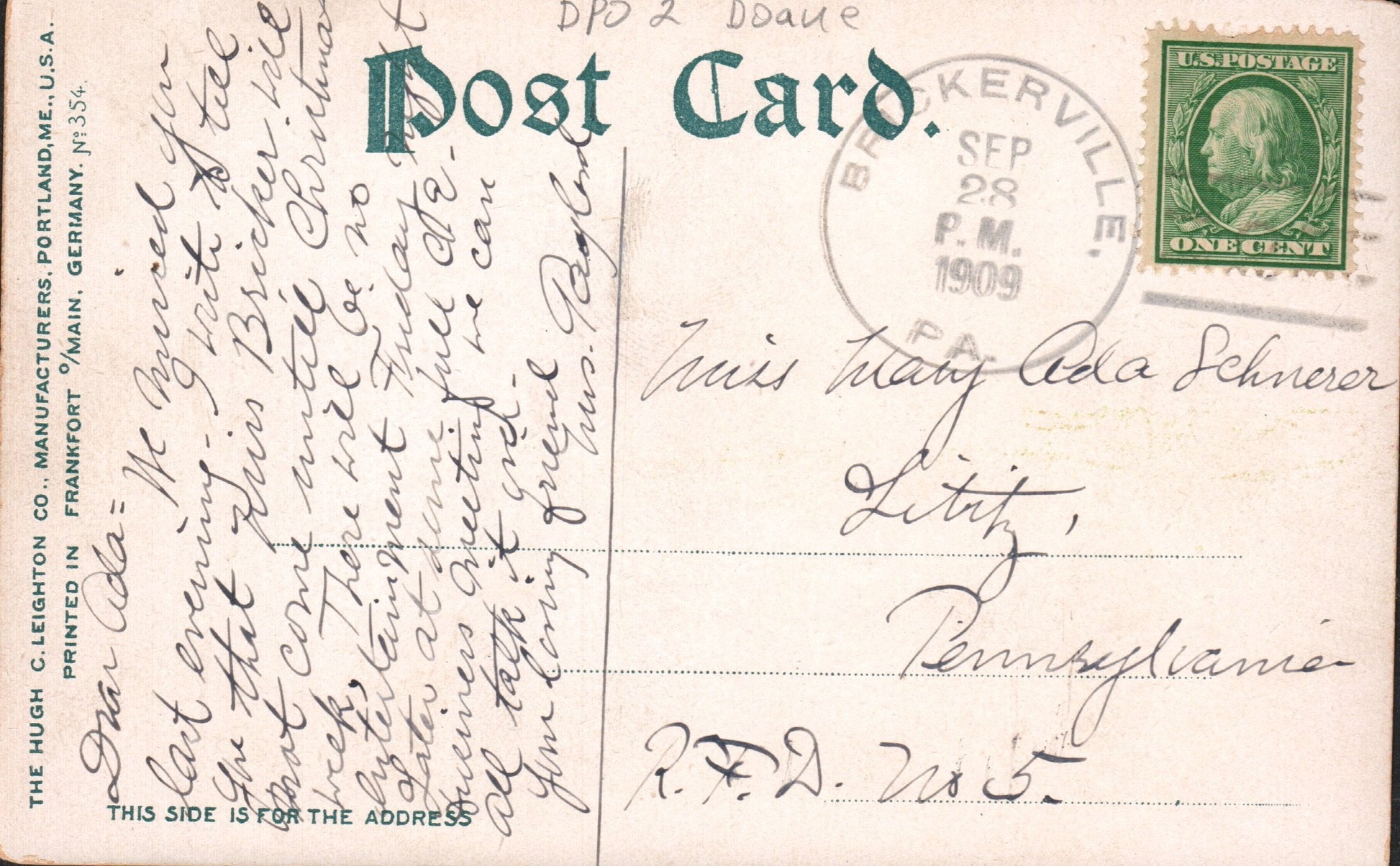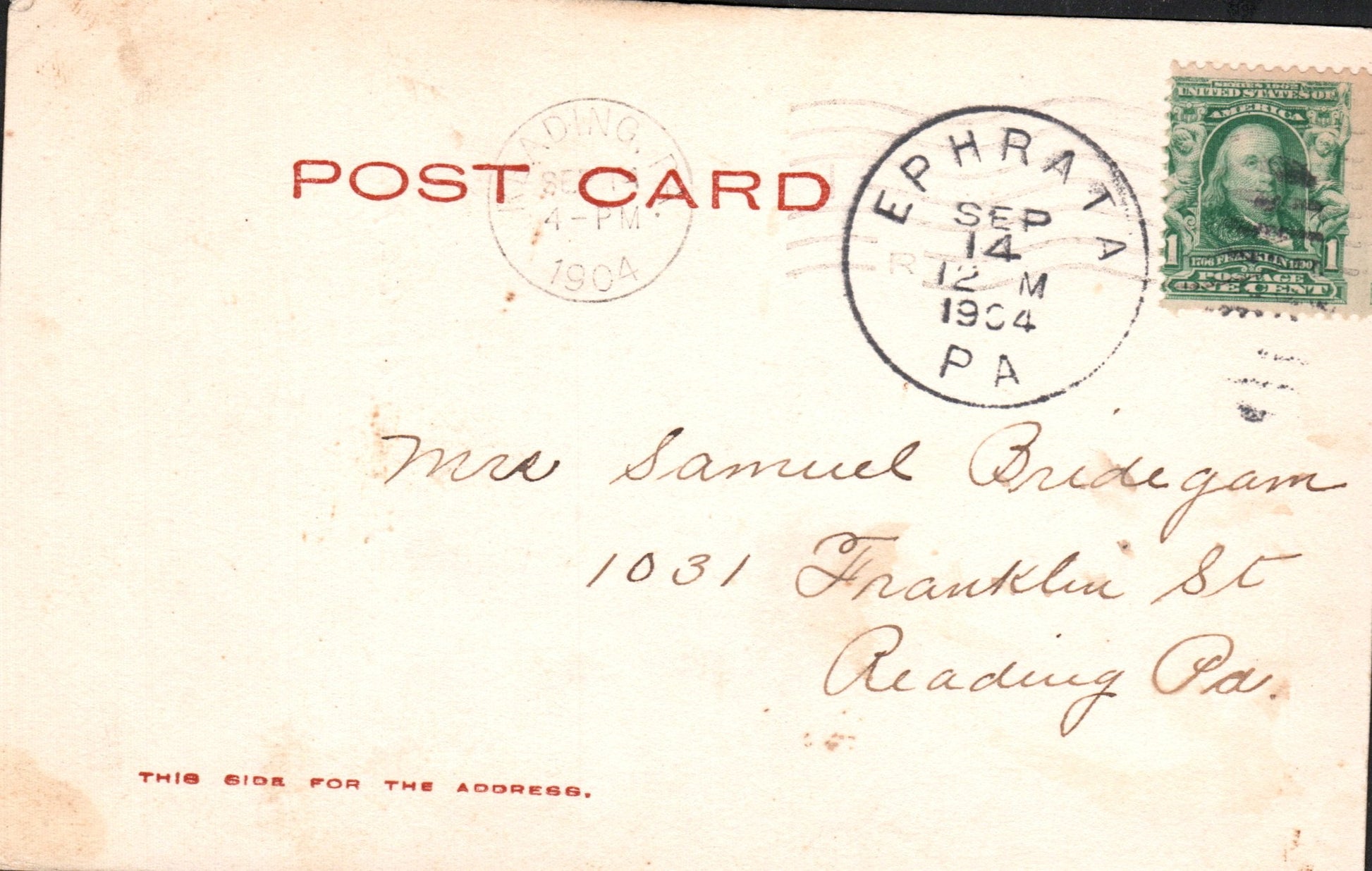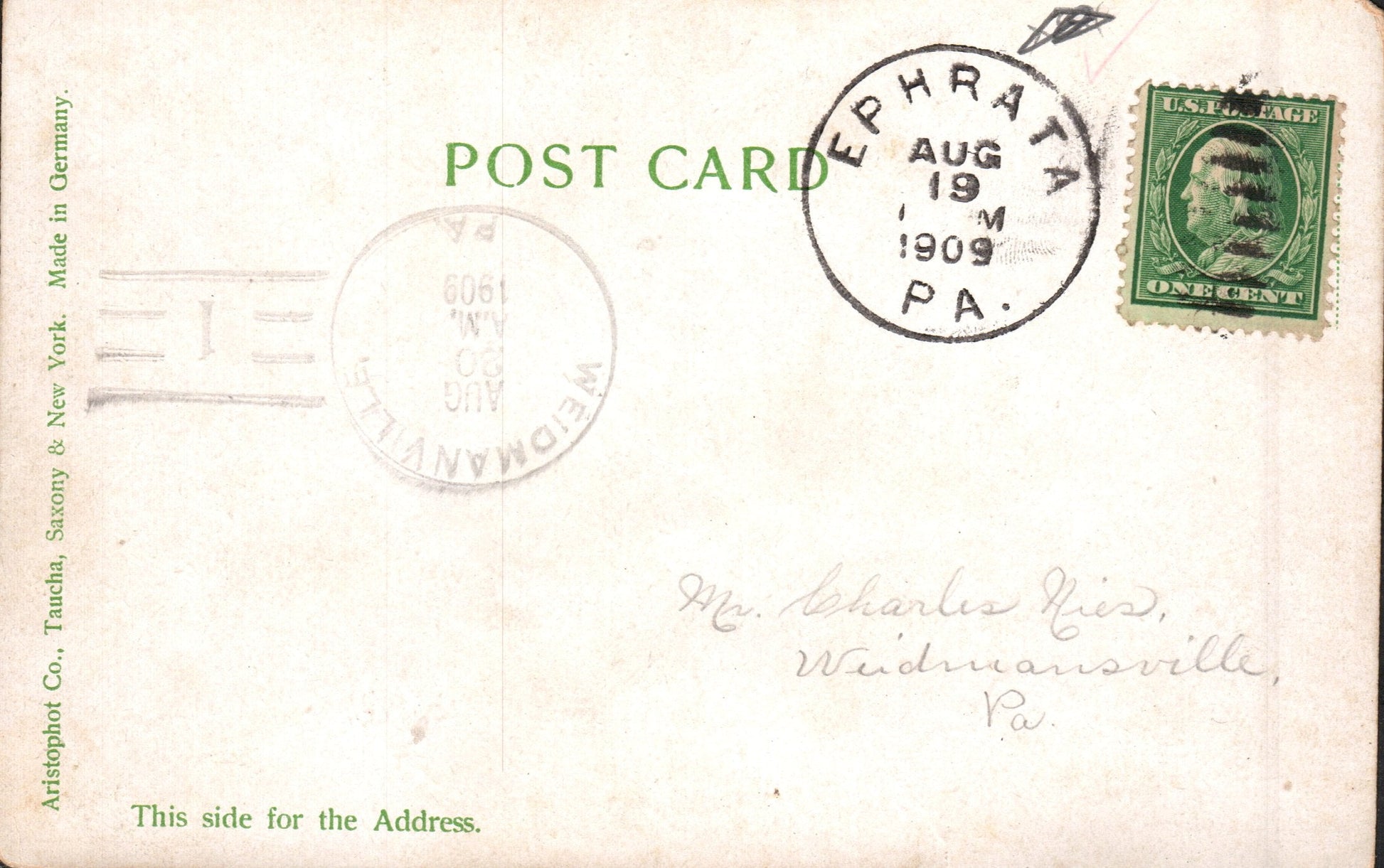 Weidmanville 1909 Doane 1 as rec’g mark from Ephrata on post card