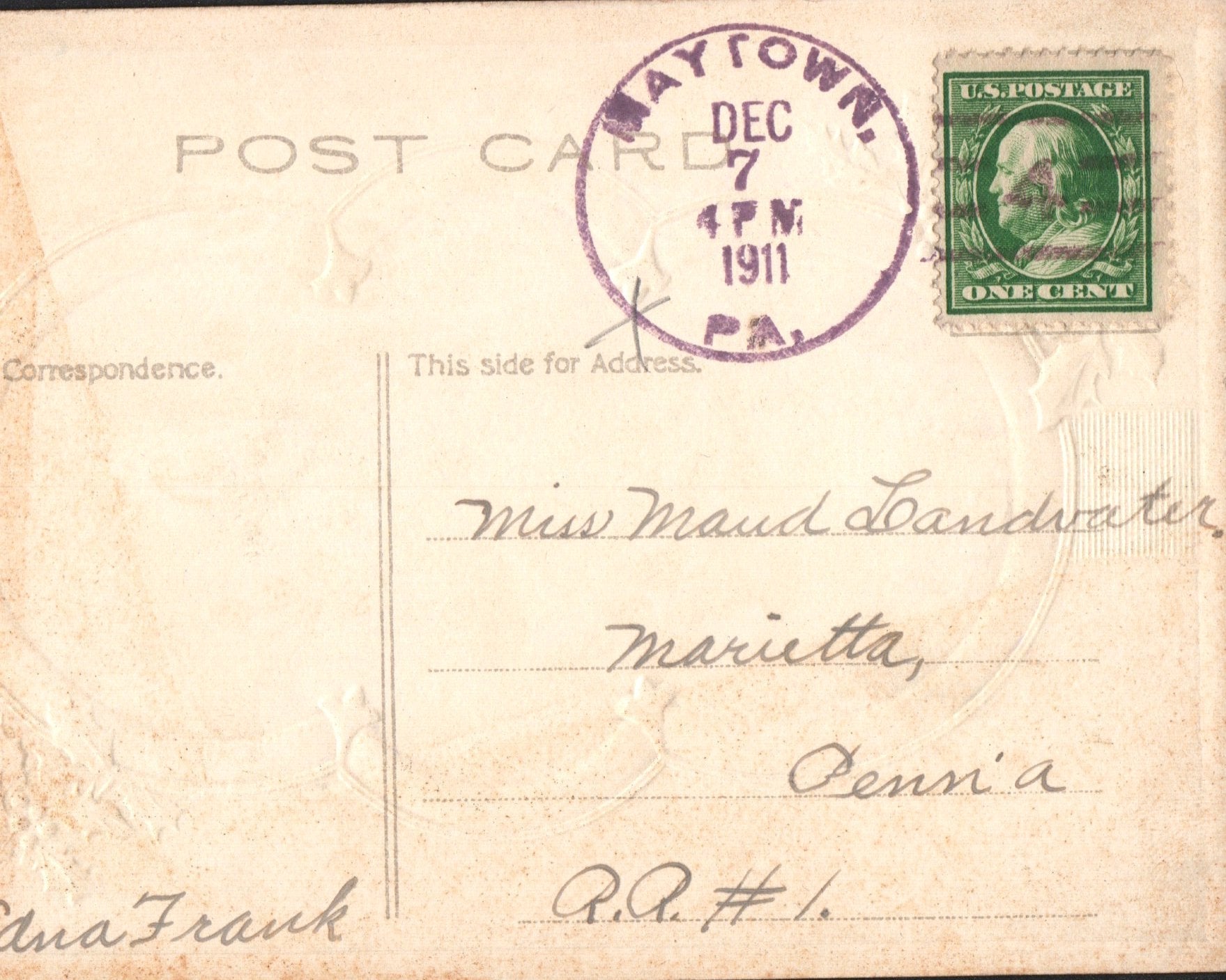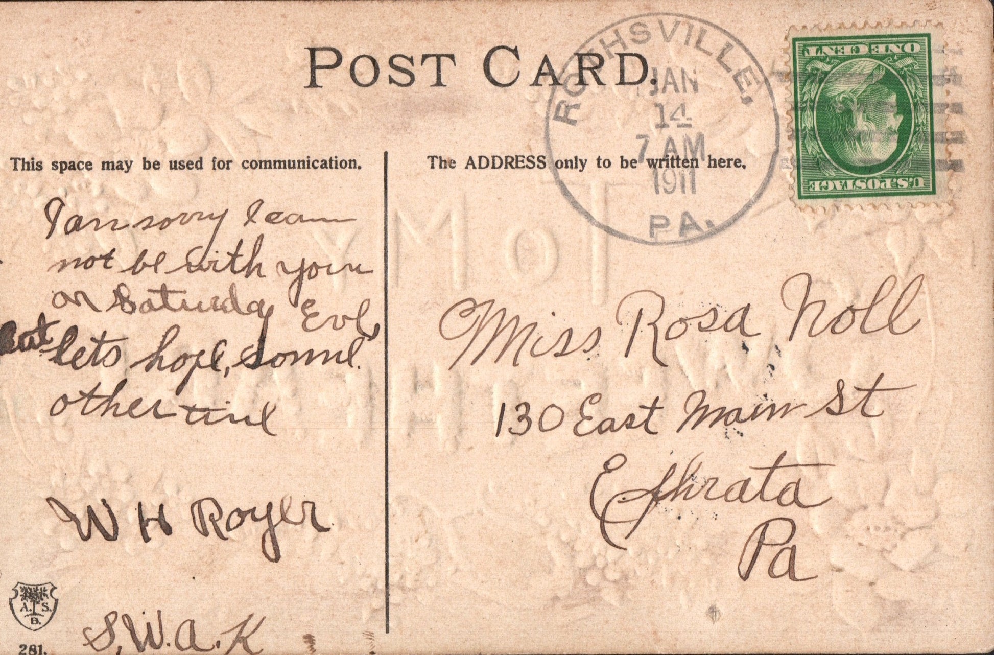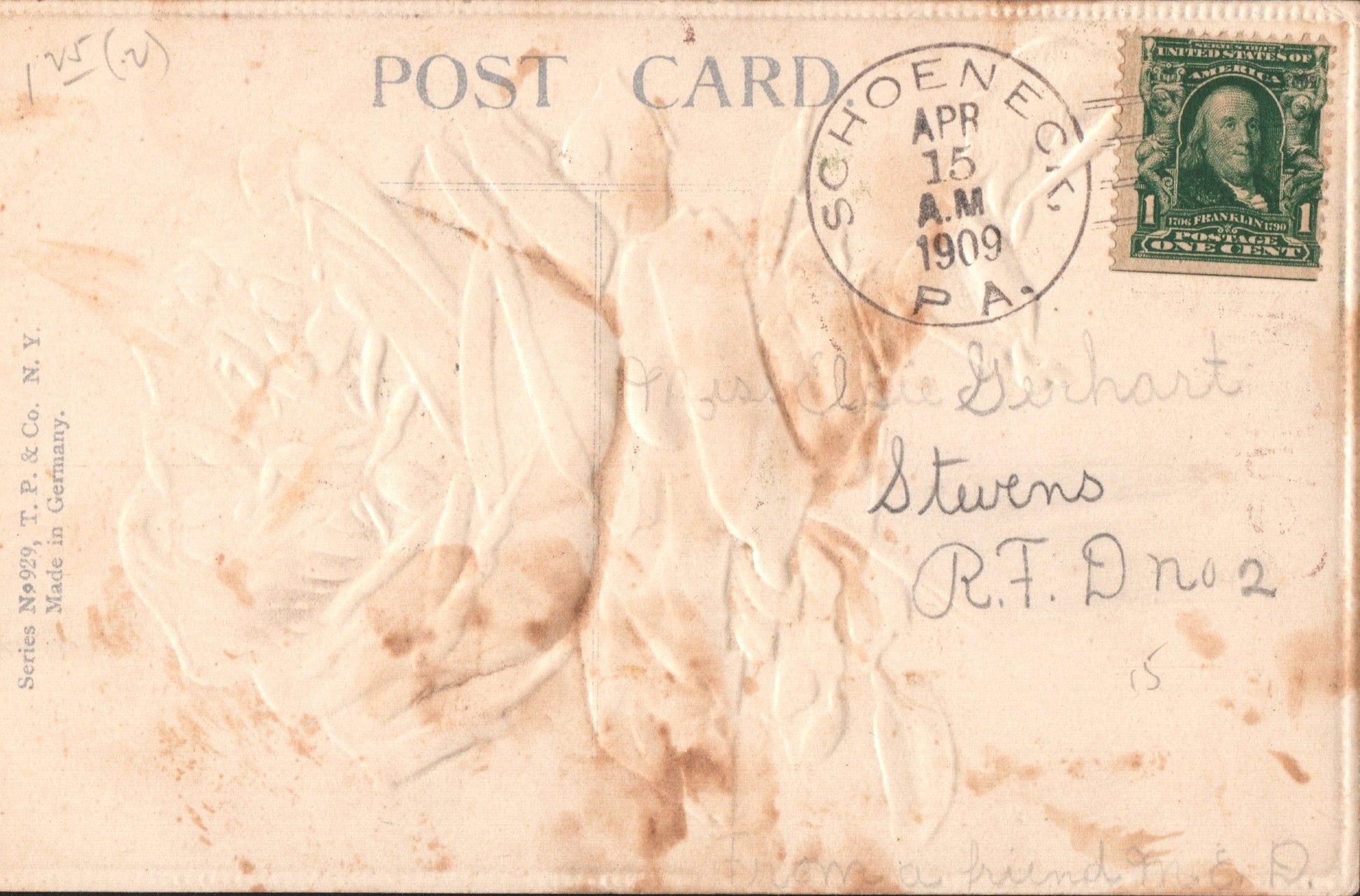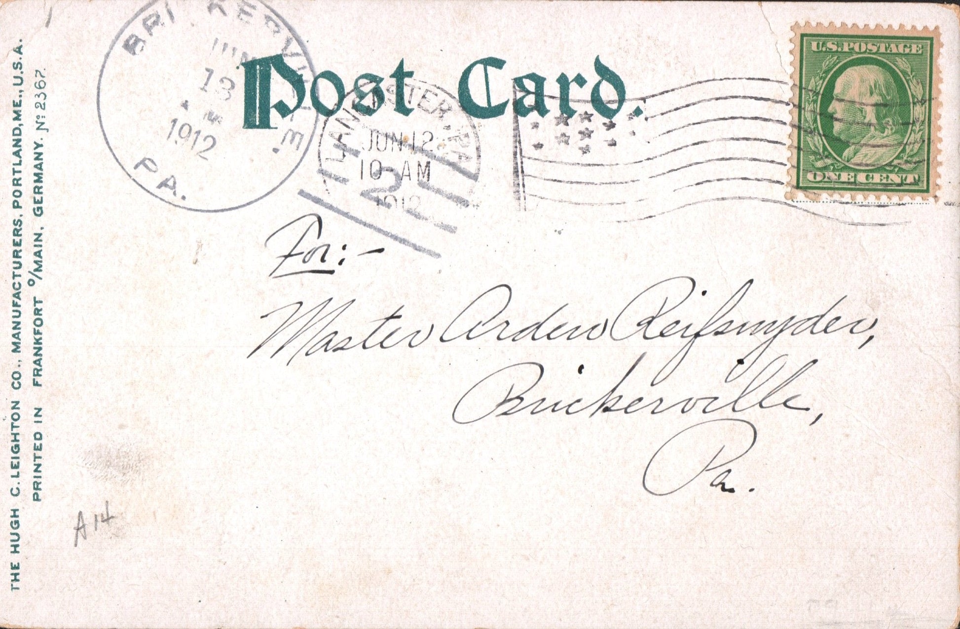 Weidmanville 1909 Doane 1 as rec’g mark from Ephrata on post card