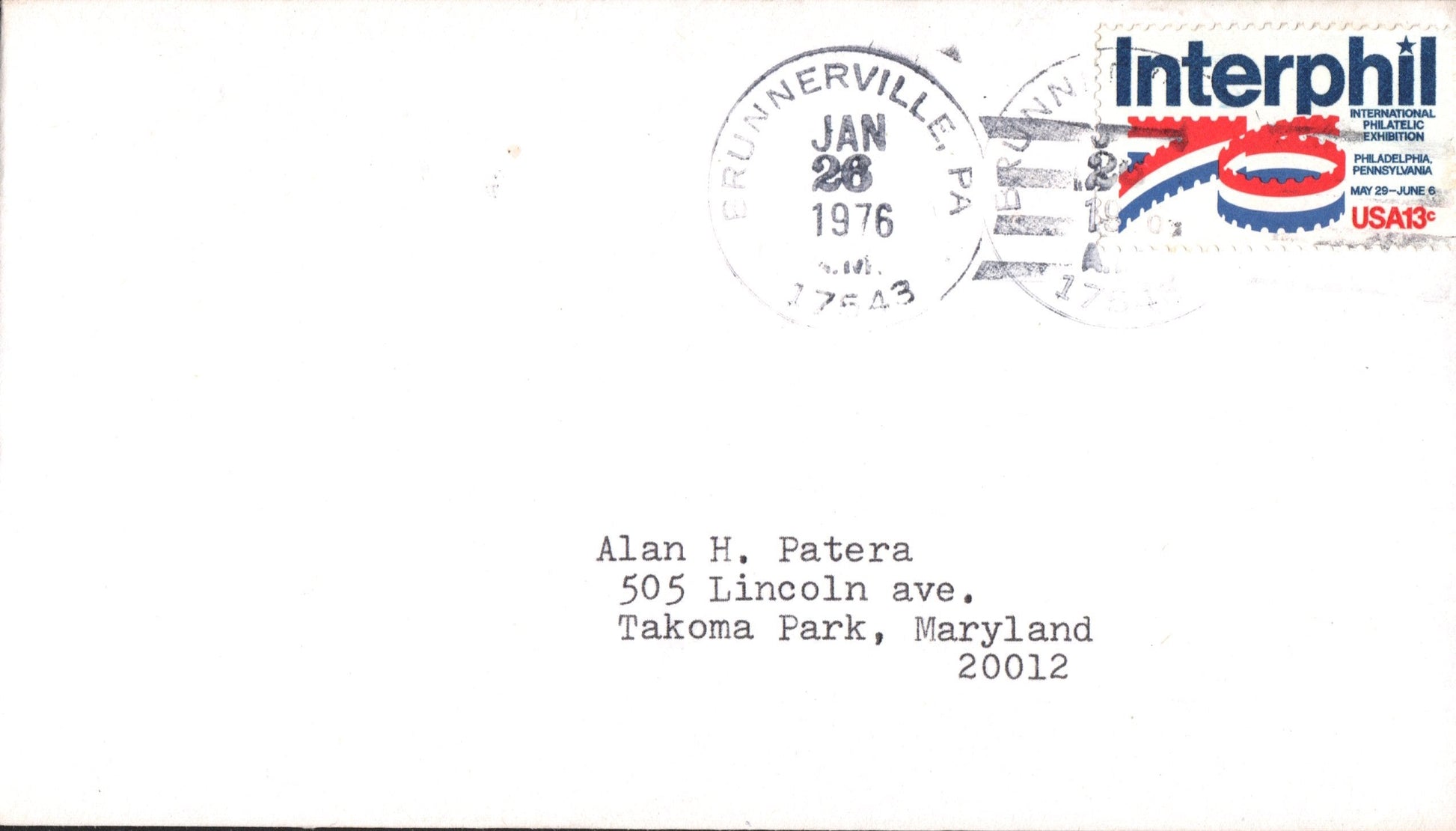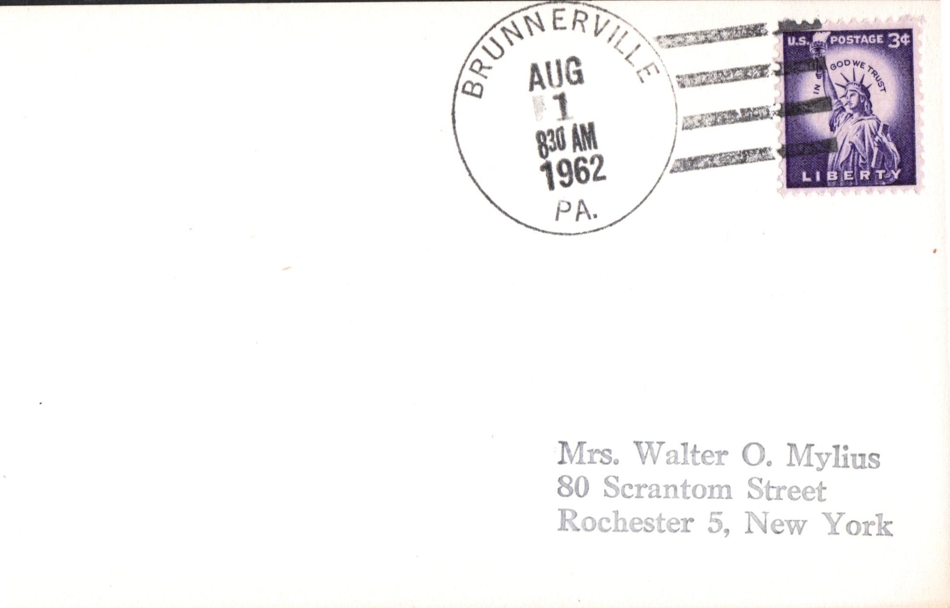 Brunnerville RS 1962 4-bar on FD [of postal status) cover-sized card; 1976 4-bar on cover