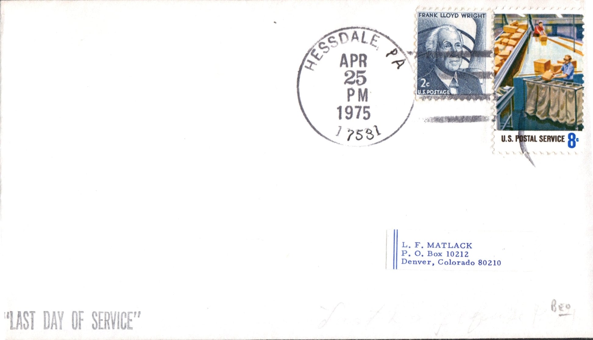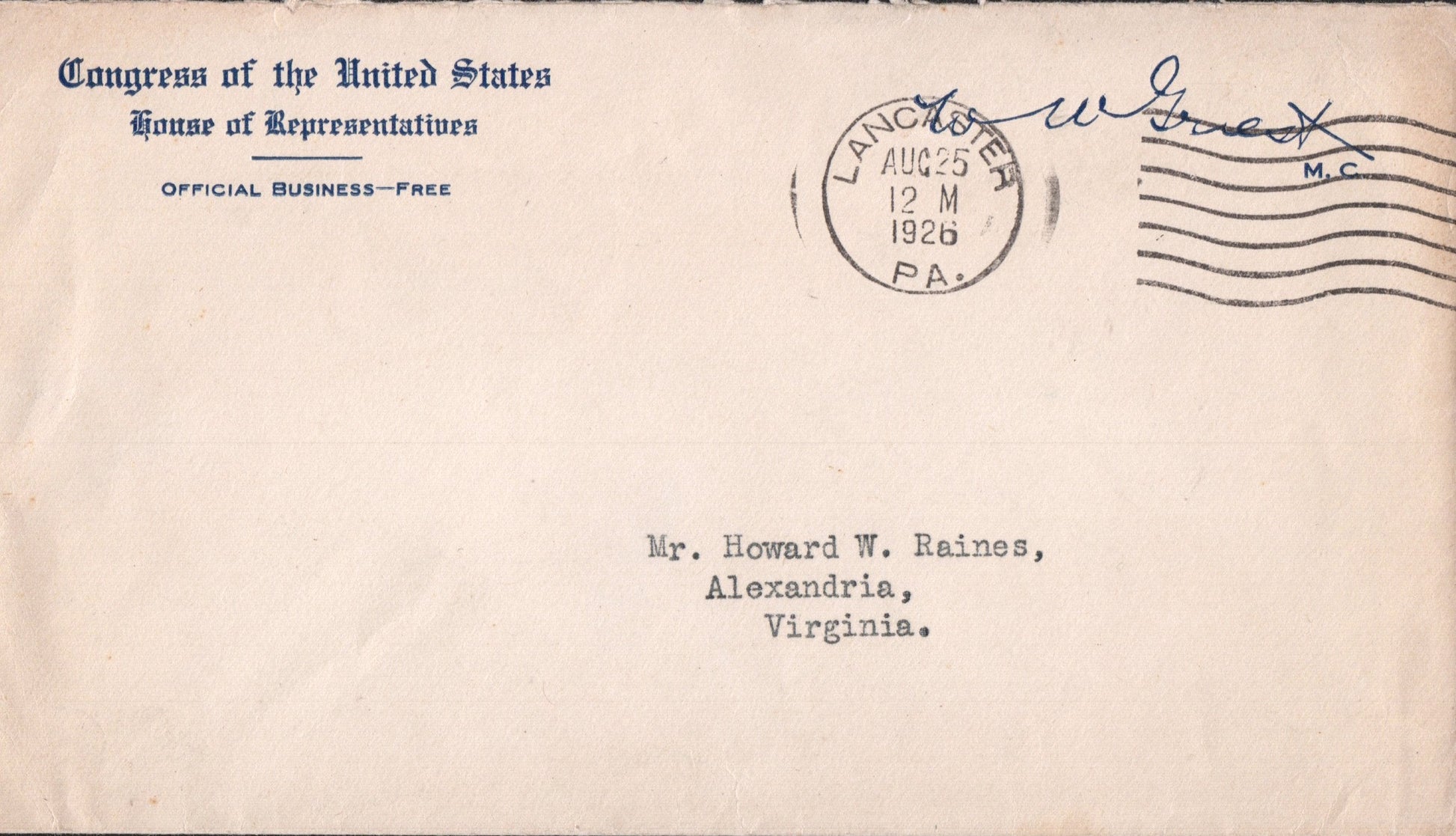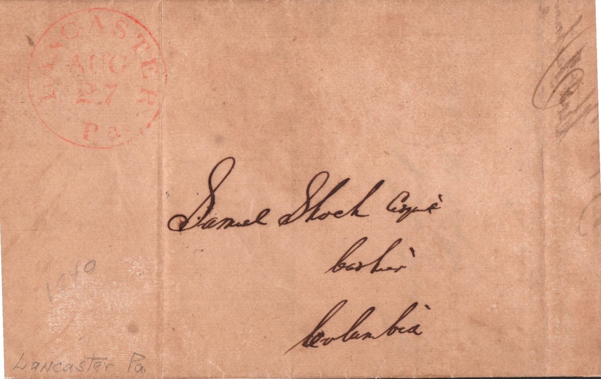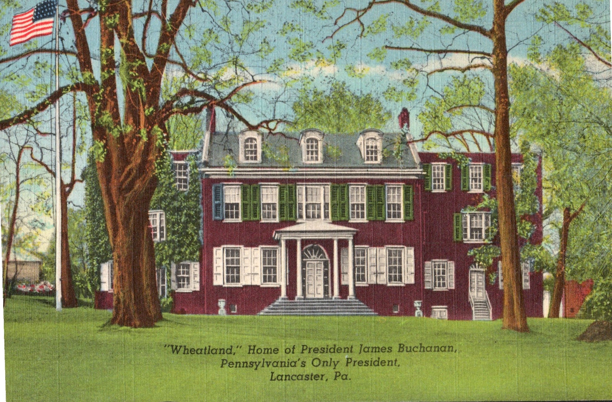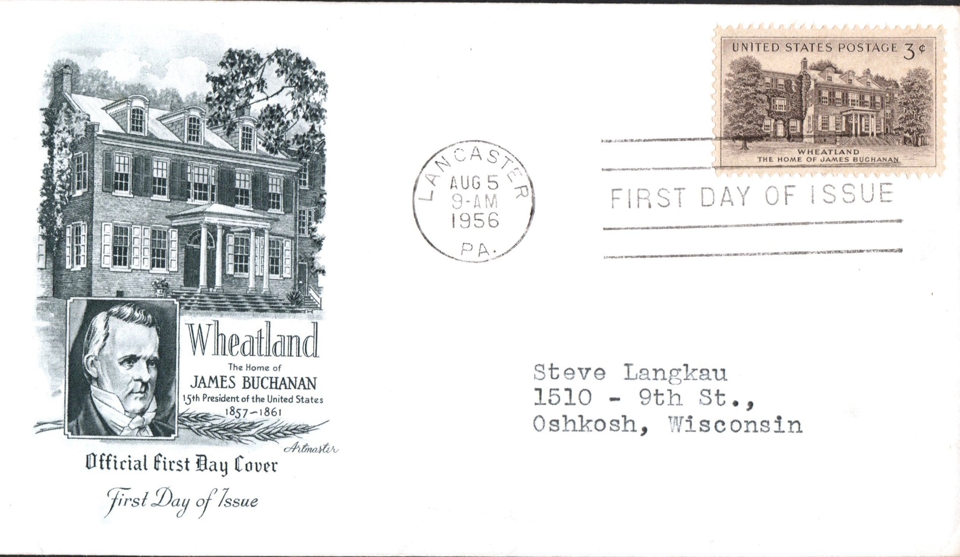 Lancaster stampless 1840 light red cds w/ banking transaction enclosure; 1889 illegible cds, “St. Luke’s Reformed Church” corner; 1916 Flag Cancel on post card of Buchanan’s tomb; 1926 machine cancel on Free frank cover from U.S. representative W.W. Guest; 1956 machine FD of issue 3¢ Wheatland stamp on cacheted cover; 1964 machine slogan [indistinct slogan]