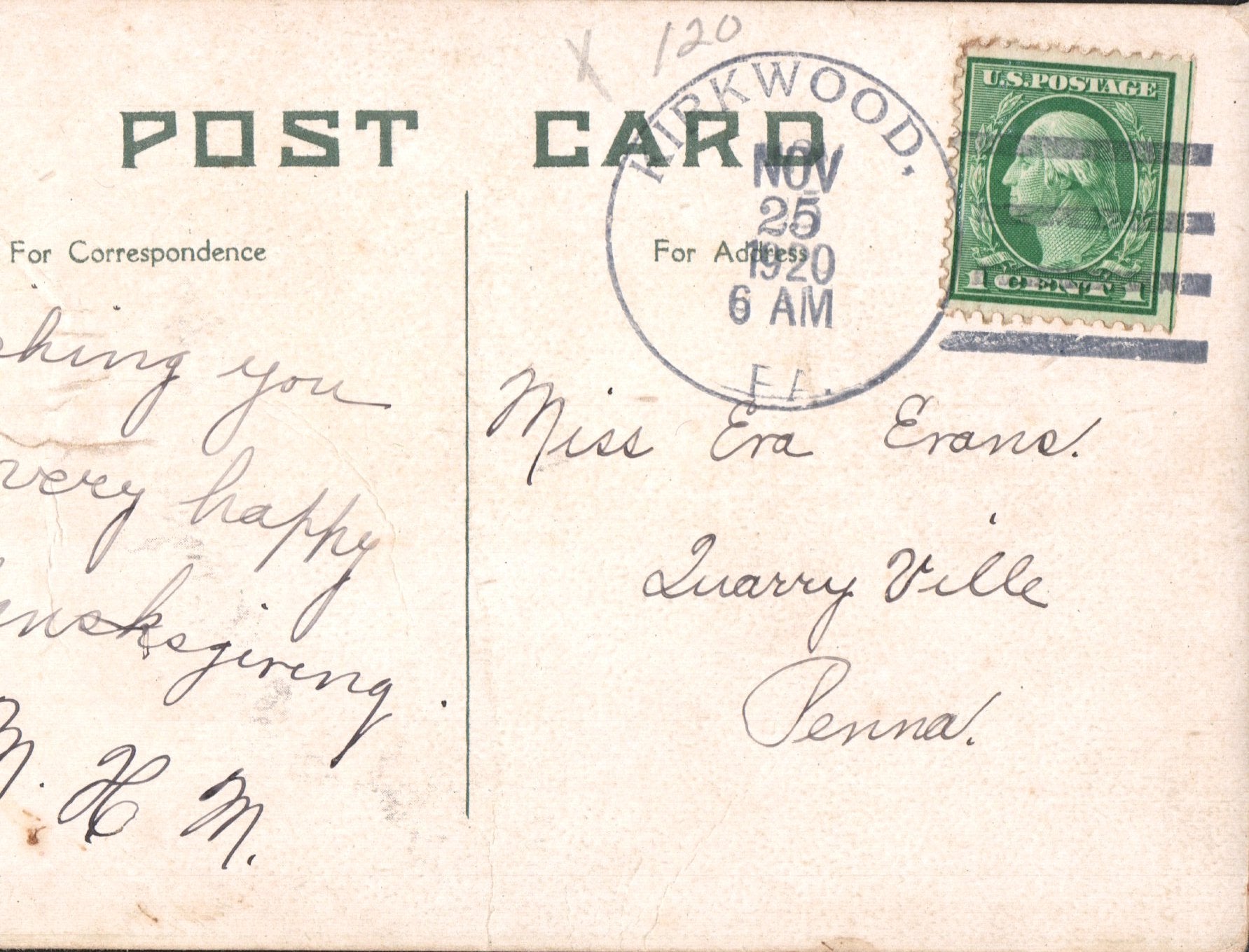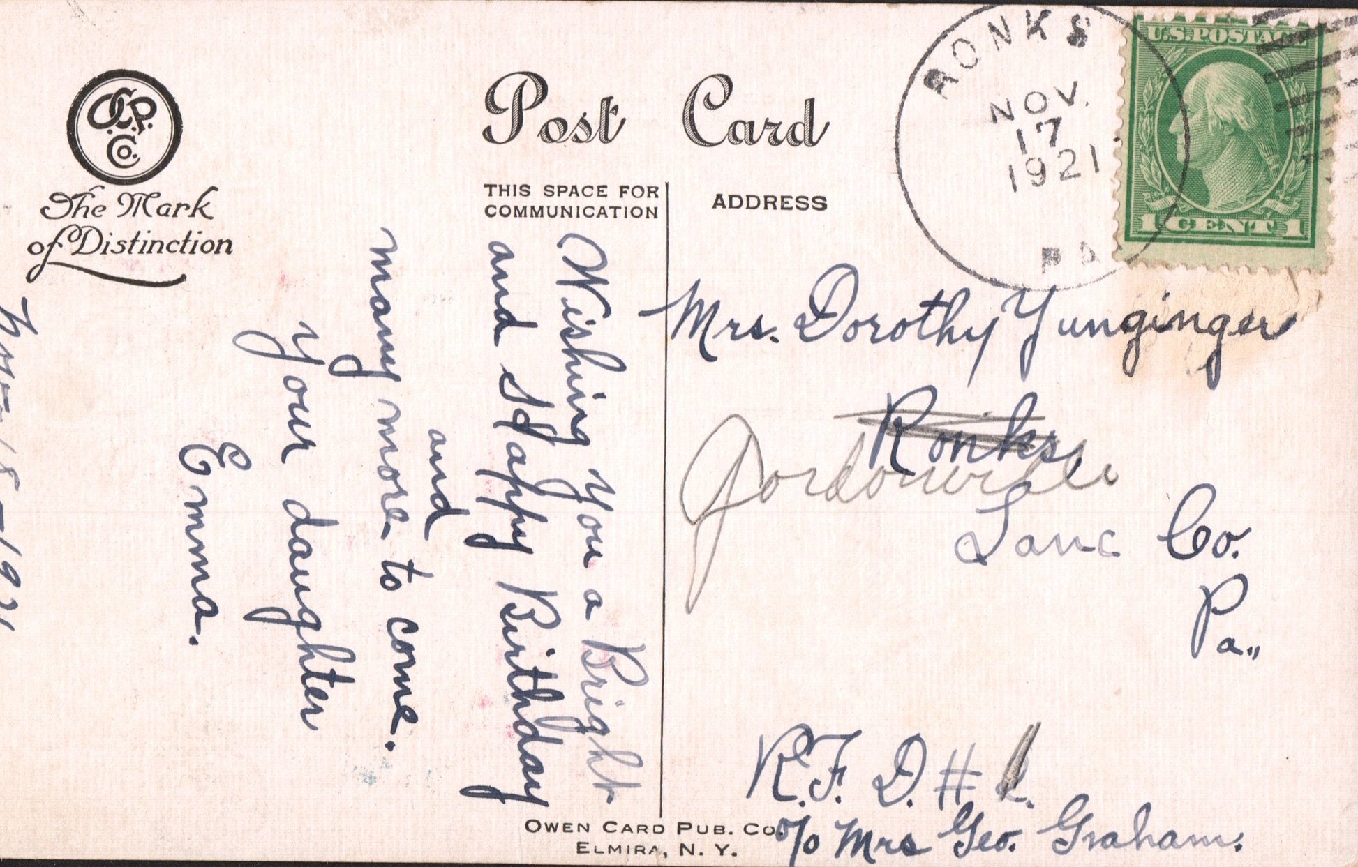 Ronks 1914 4-bar on post card; 1921 duplex on post card