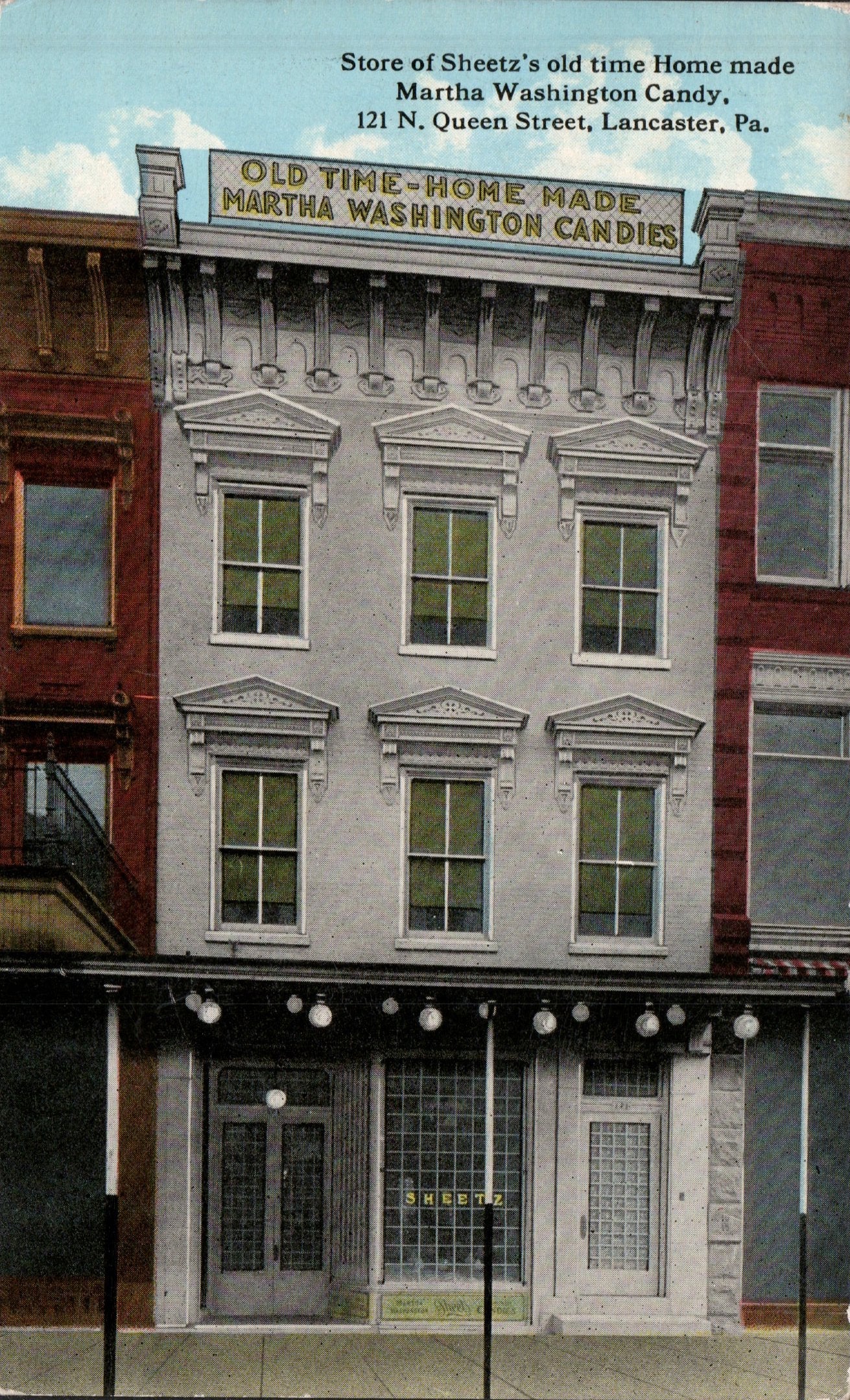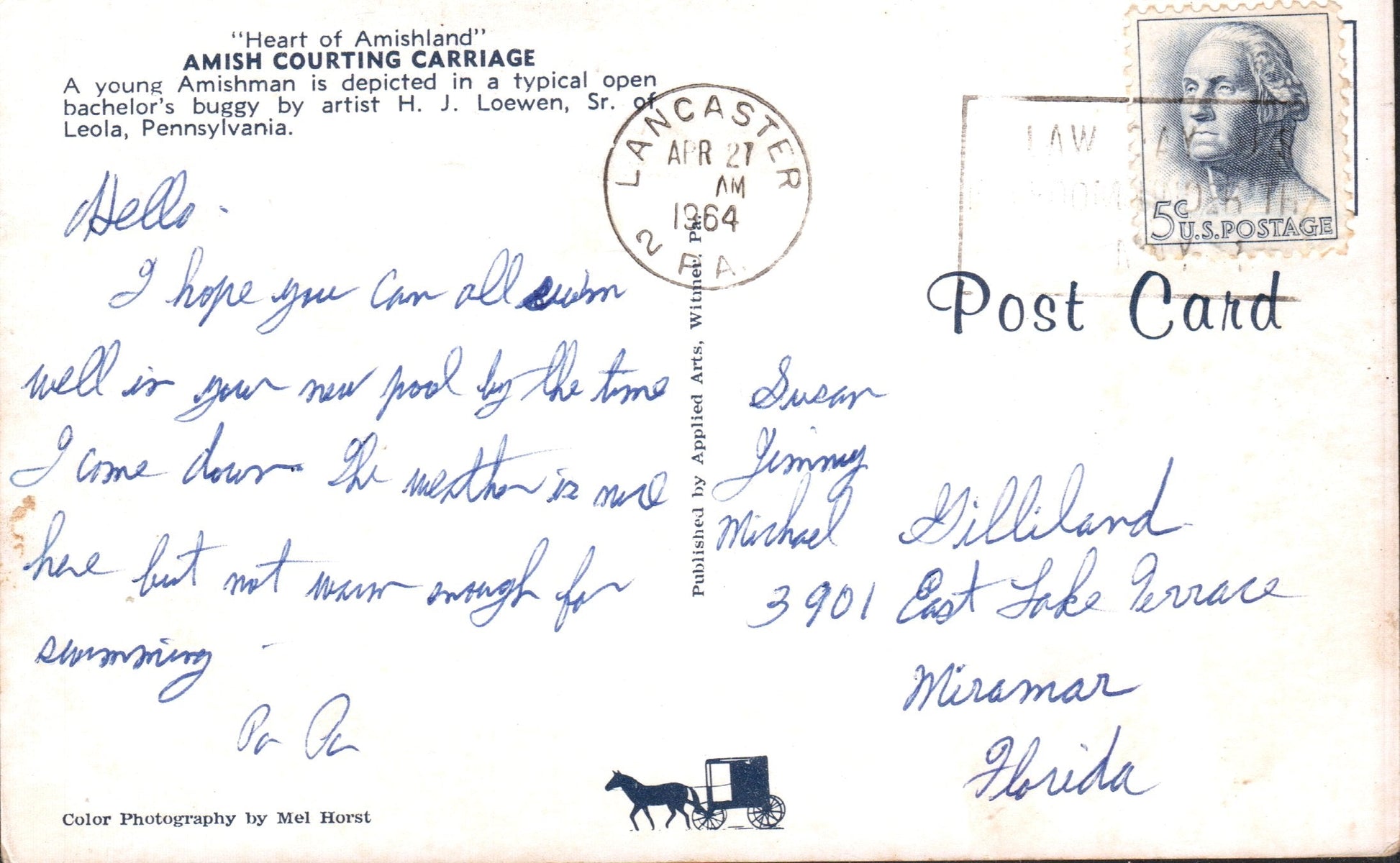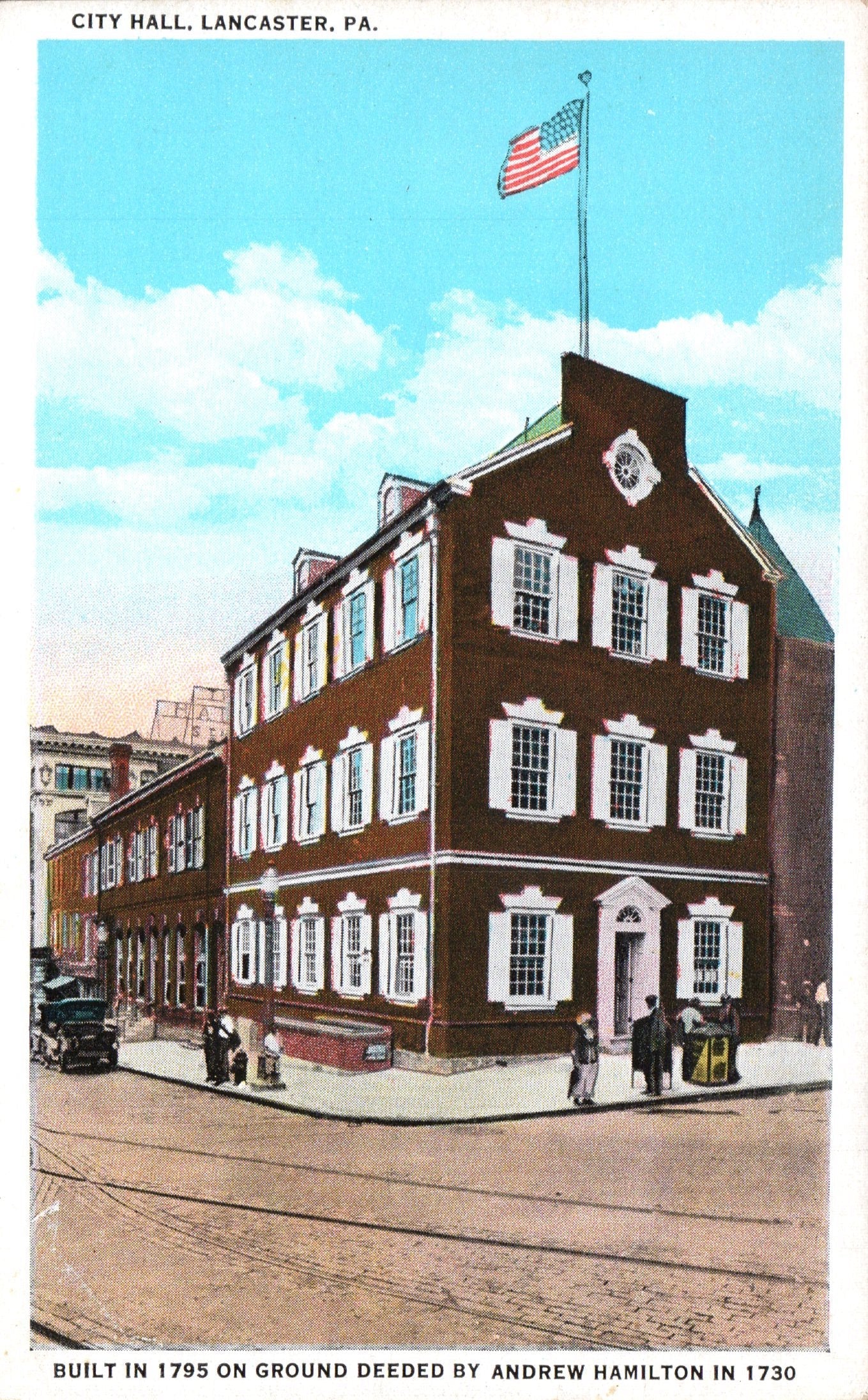 Post cards: City Hall [c.1925]; “Lutheran Church of the Holy Trinity” [chrome]; “Old Time Home Made Martha Washington Candies” [c.1910?]; “Wheatland, Home of President James Buchanan” [linen]; Miller’s Smorgasbord [chrome]; “The Amish Farm & House” [chrome]; “Ancient Abbyville Mill” [sepia, c.1910]
