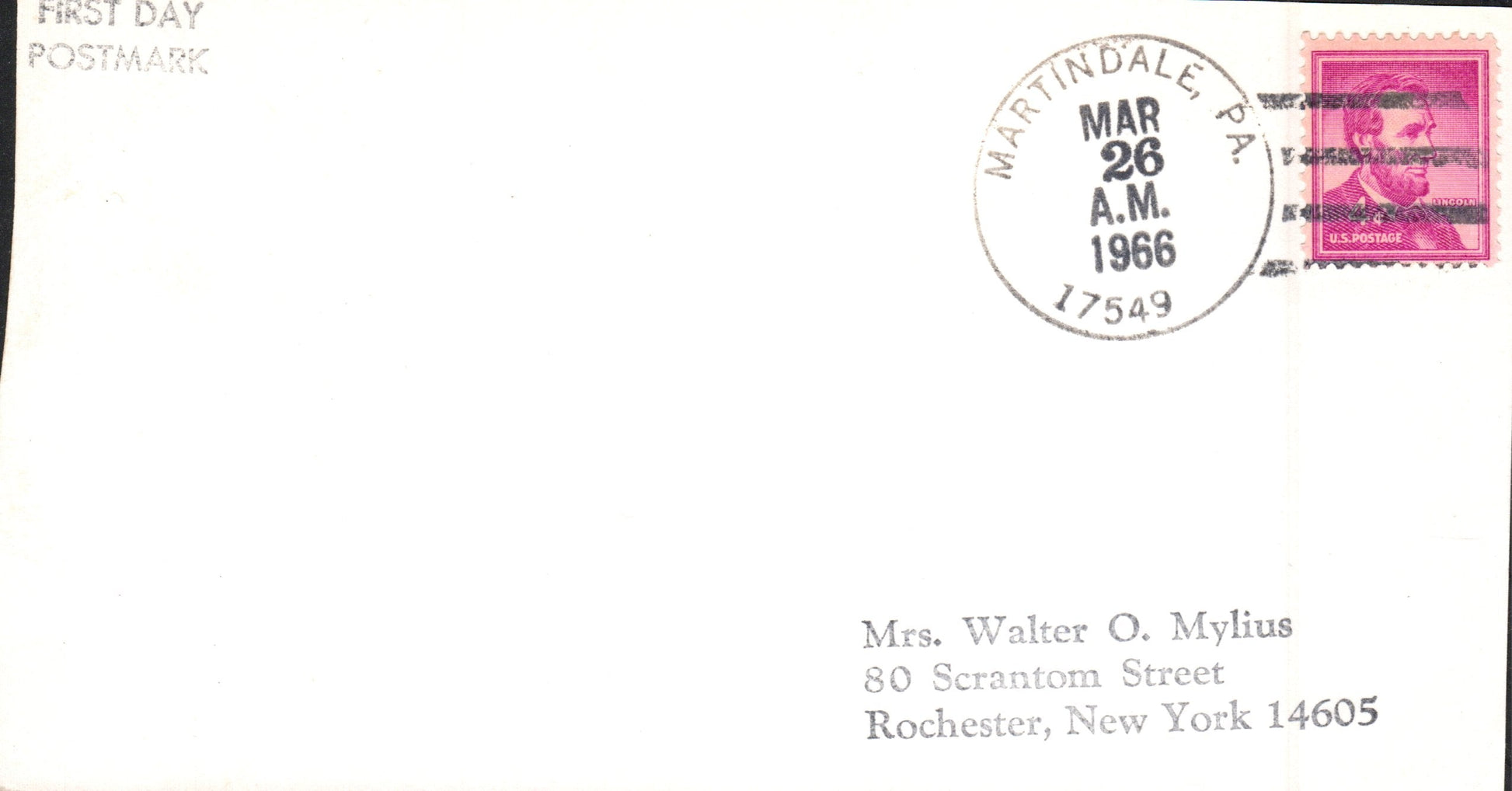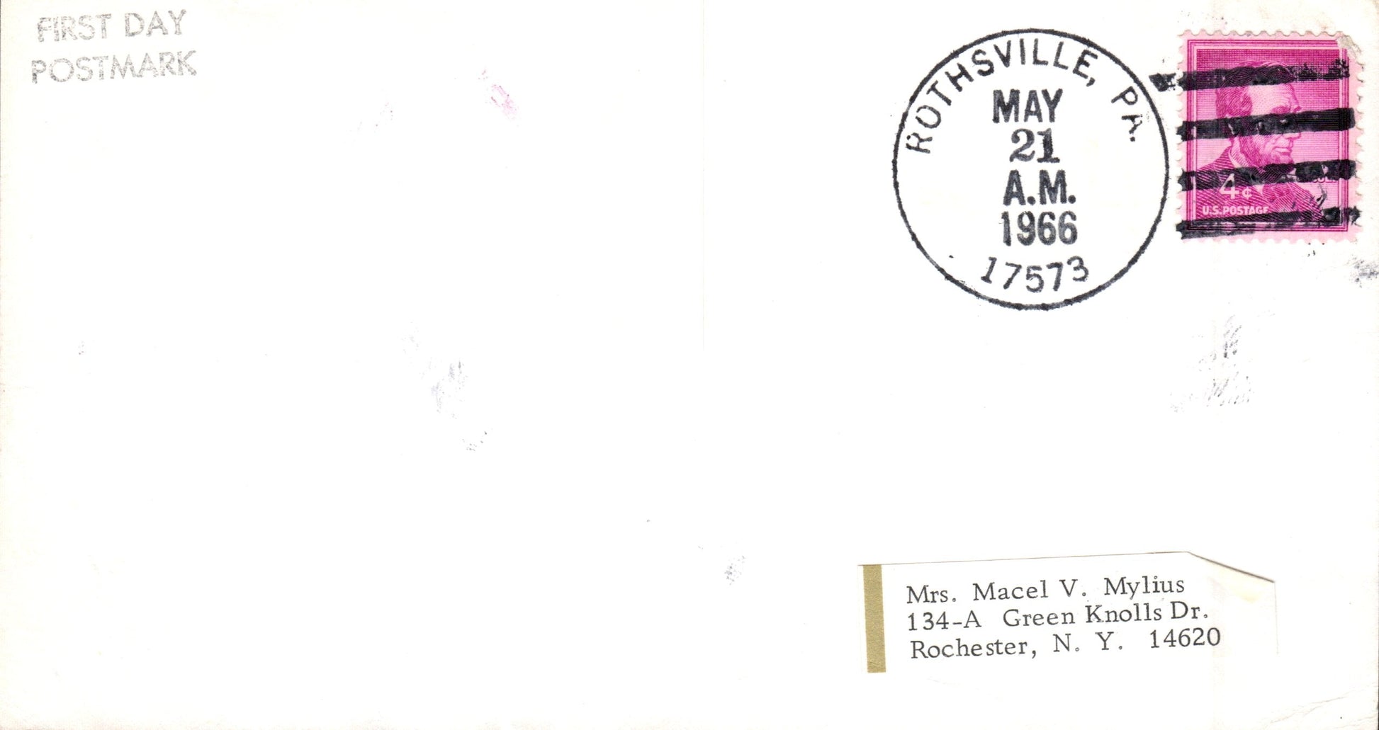 Rothsville B 1966 4-bar on FD [of postal status] cover-sized card, round dater on back