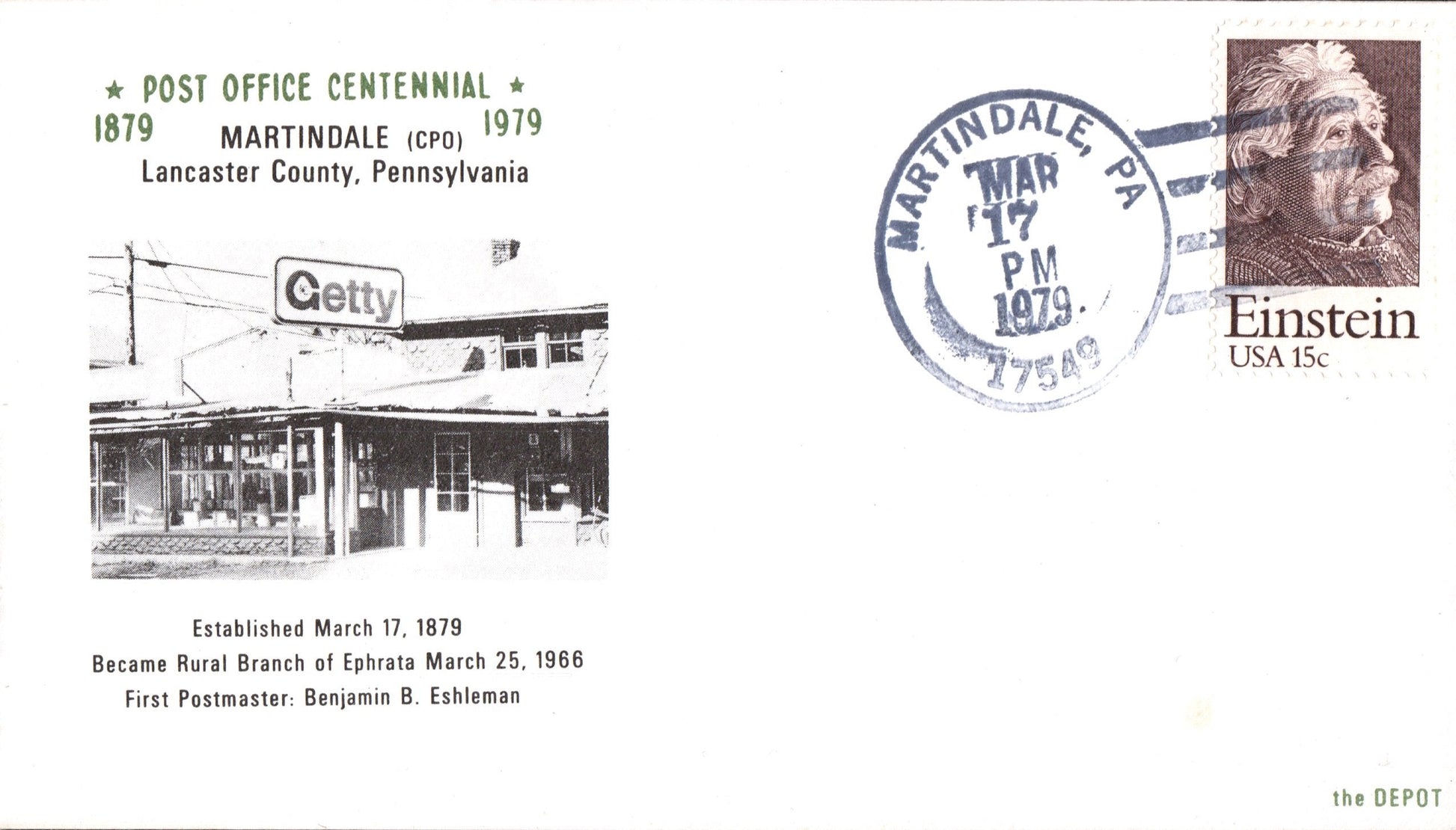 Martindale 1966 4-bar on FD [of postal status] on cover-sized card; 1979 4-bar on cacheted cover [photo of post office, for centennial of office]