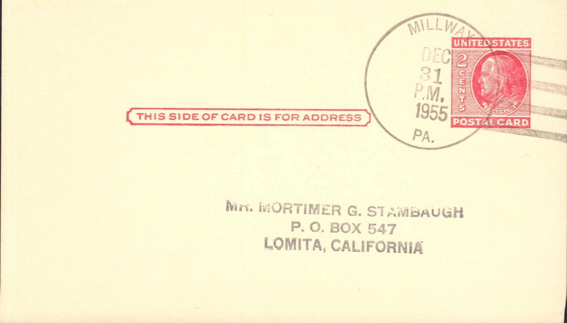 Millway (1861-1955) 1955 4-bar on LD Postal Card