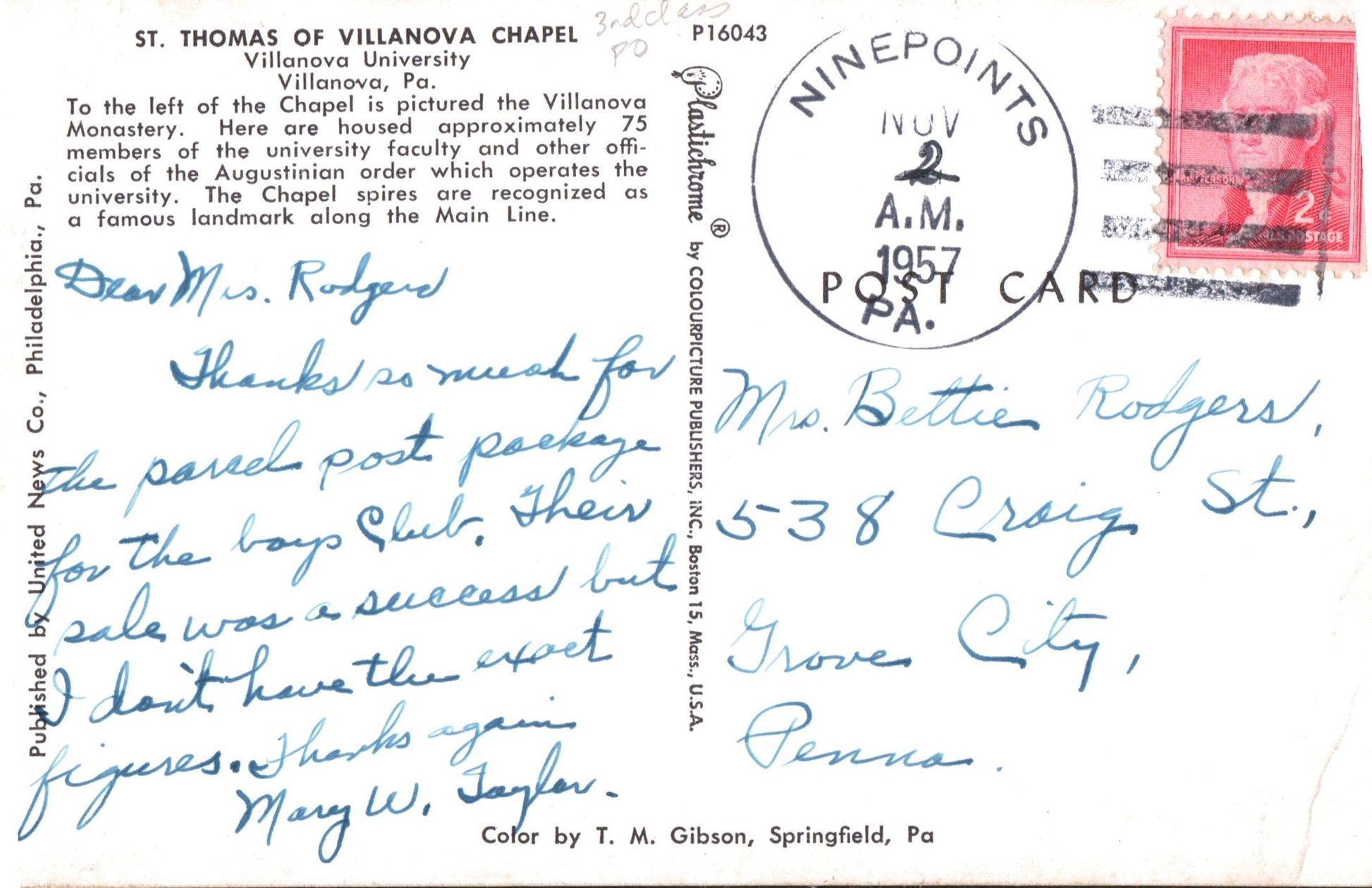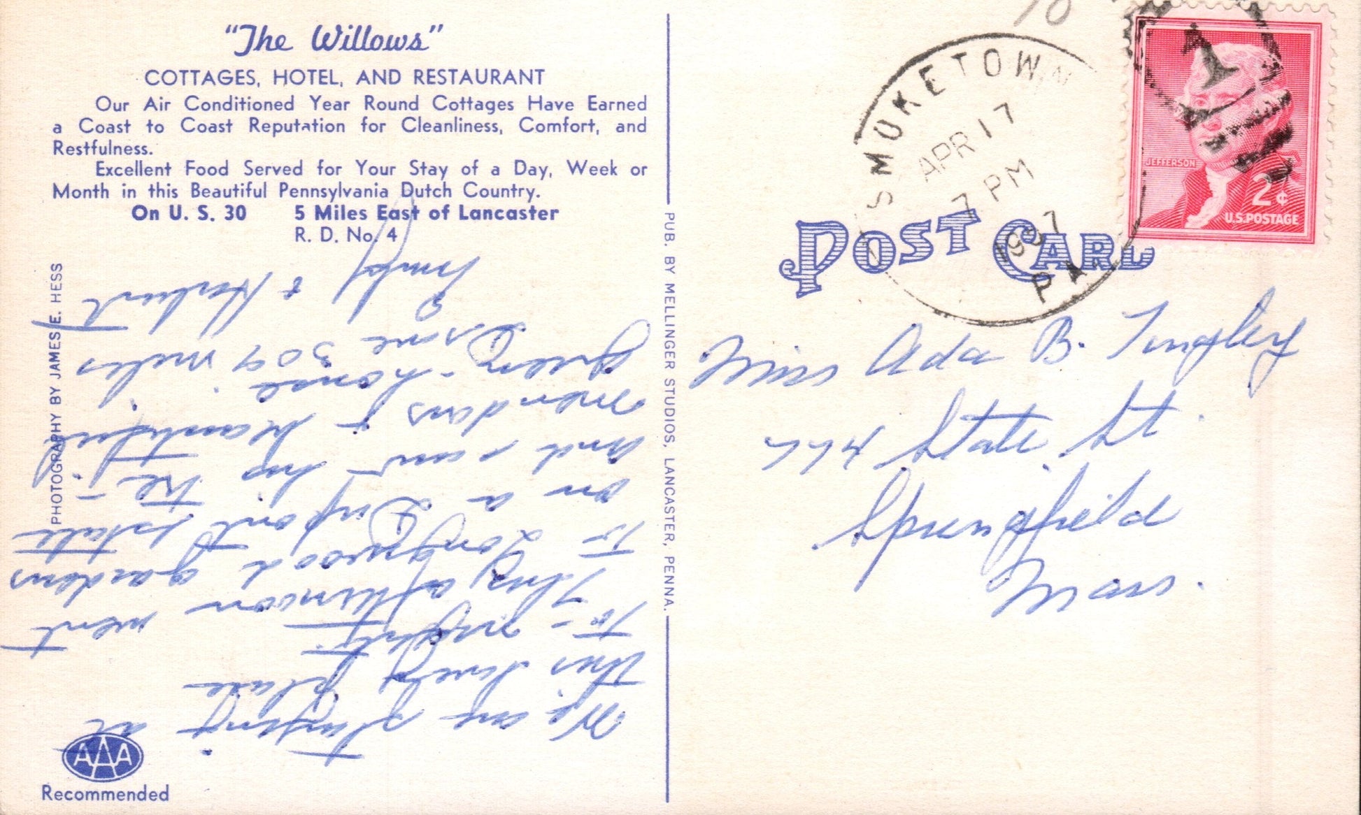 Smoketown 1932 4-bar on cover; 1957 duplex on post card, view of “The Willows” [linen]