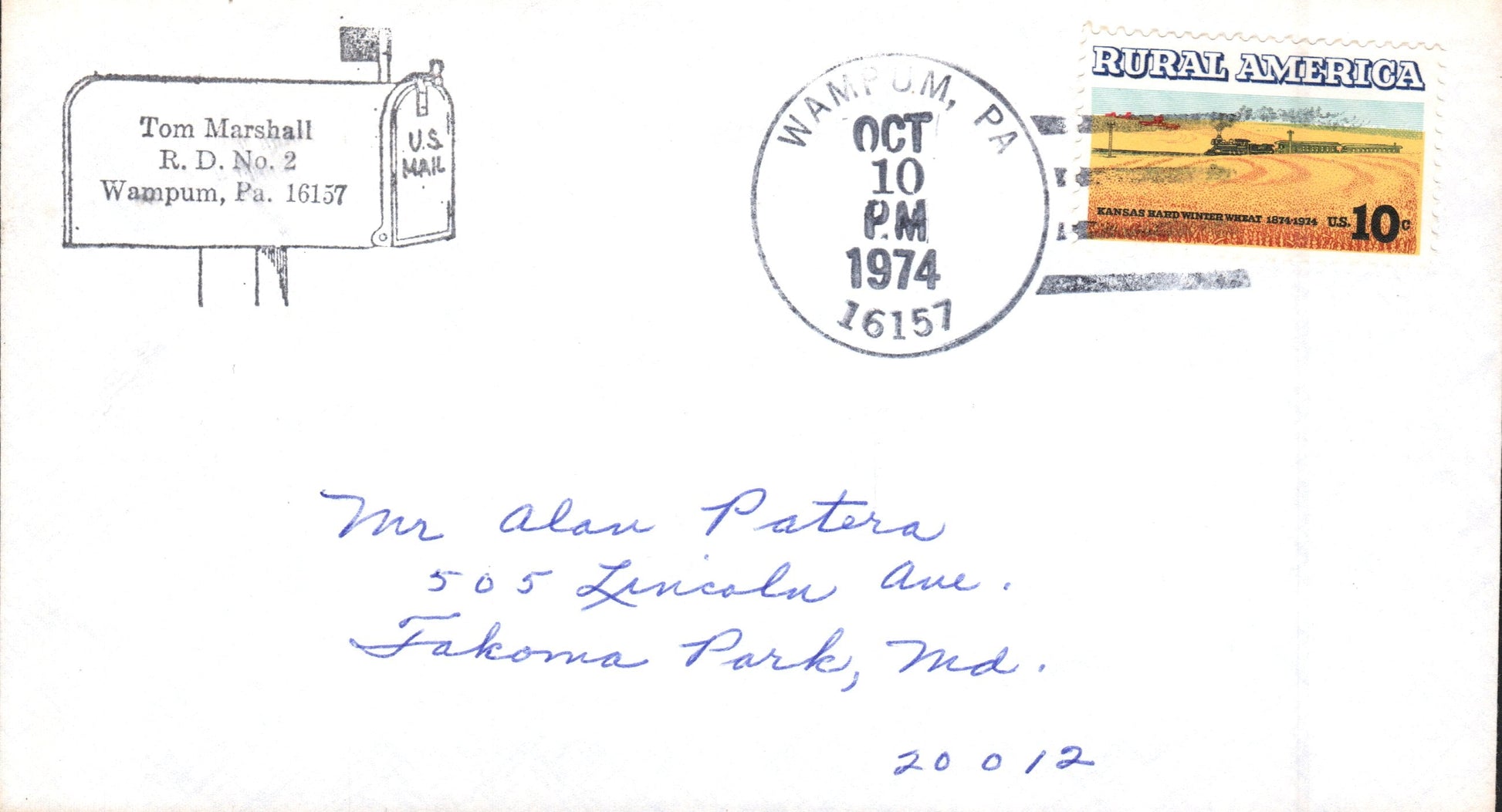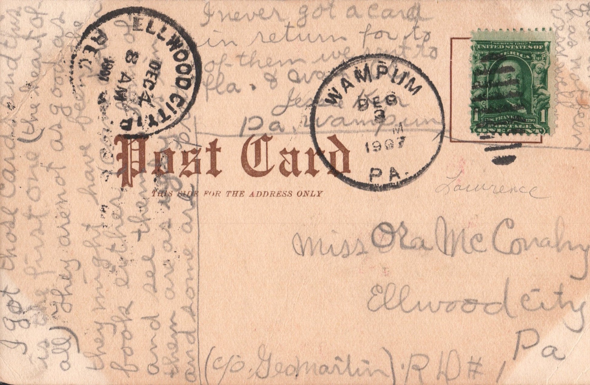 Wampum 1907 duplex on post card, also Ellwood City PA Rec’d; 1974 4-bar on cover
