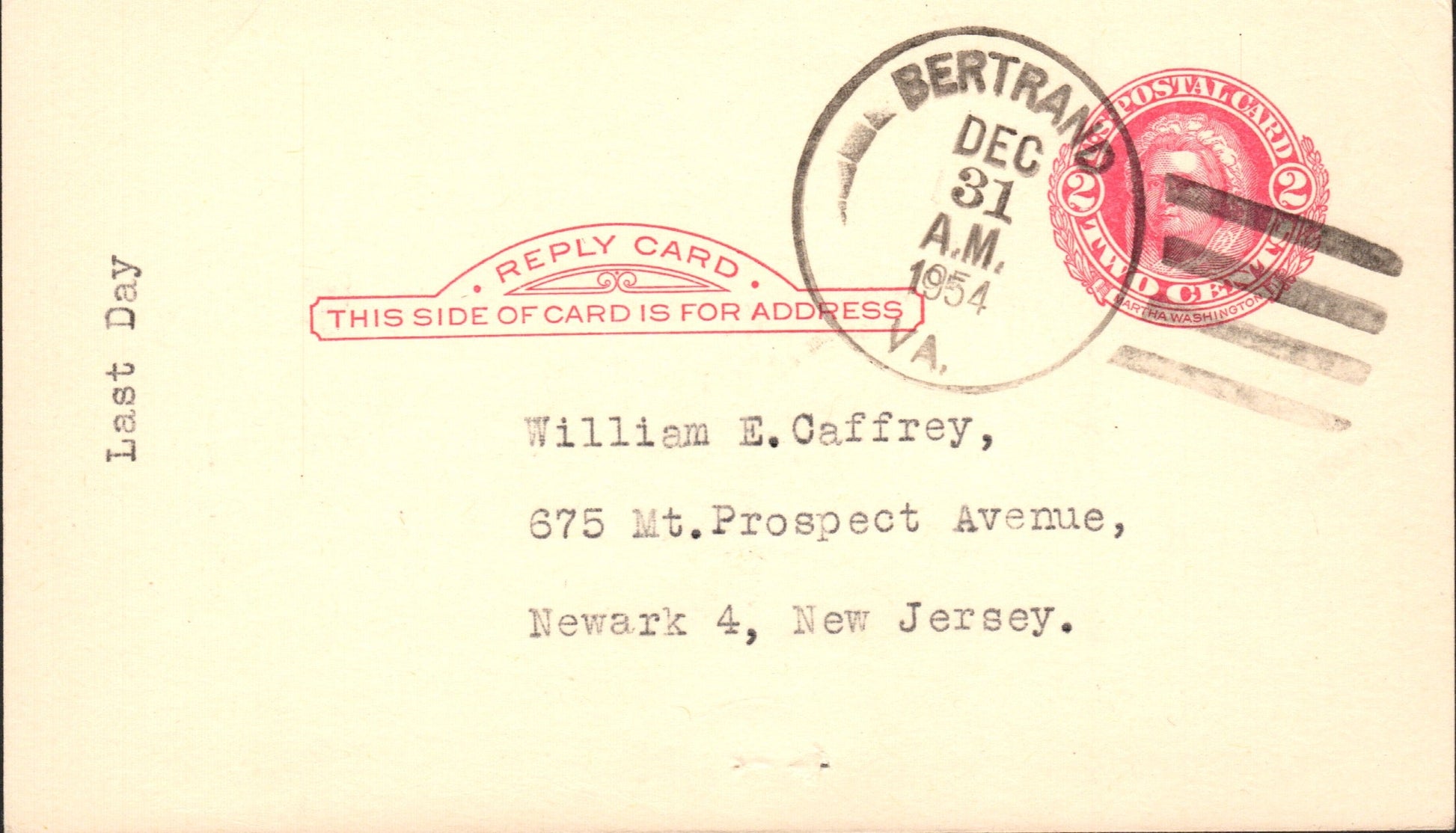 - Bertrand (1902-1954) 1954 4-bar on LD Postal Card