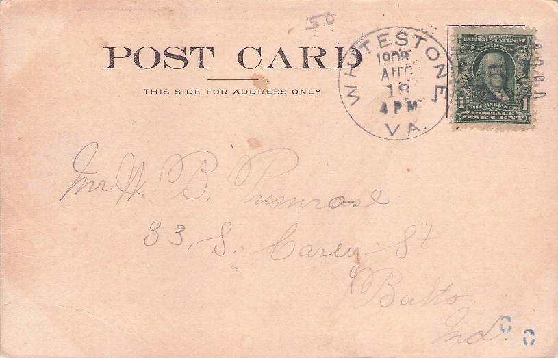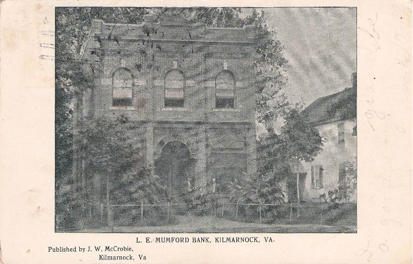 - Whitestone 1908 Doane 5 on post card, B&W view of I.K. Mumford Bank in Kilmarnock