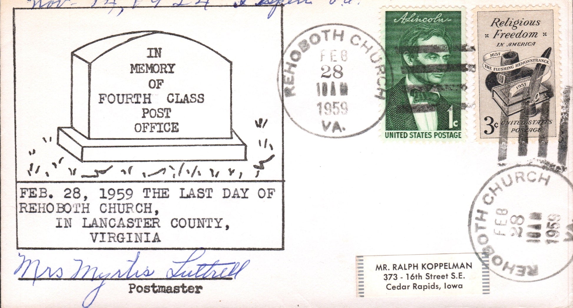 - Rehoboth Church (1824-1959) 1959 4-bar on cacheted LD cover, PM autograph