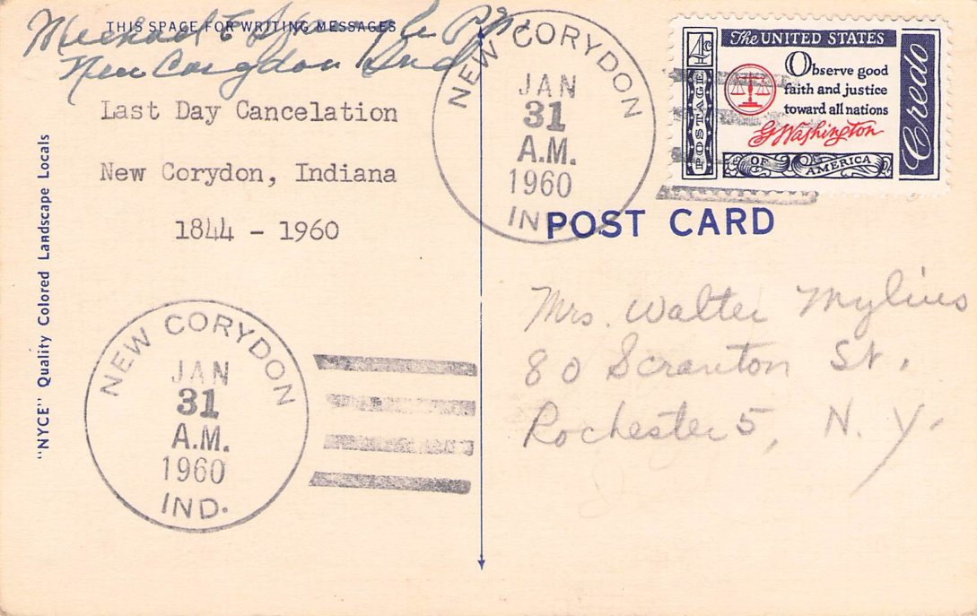 New Corydon (1844-1960) 1960 4-bar LD? on New Corydon post card