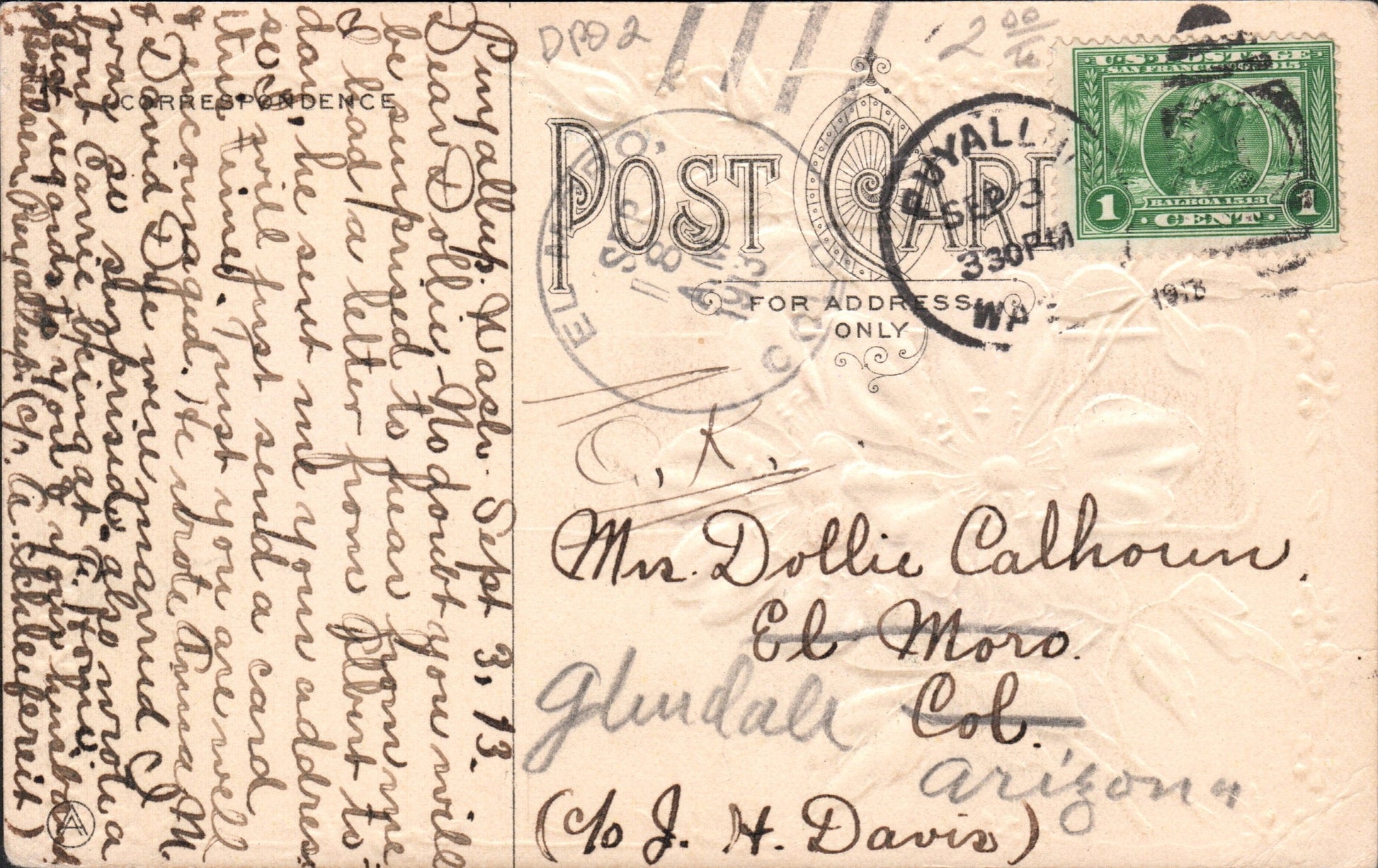 El Moro (1896/1933) 1913 4-bar as transit mark on post card from Puyallup, Wash. and forwarded to Glendale, Arizona