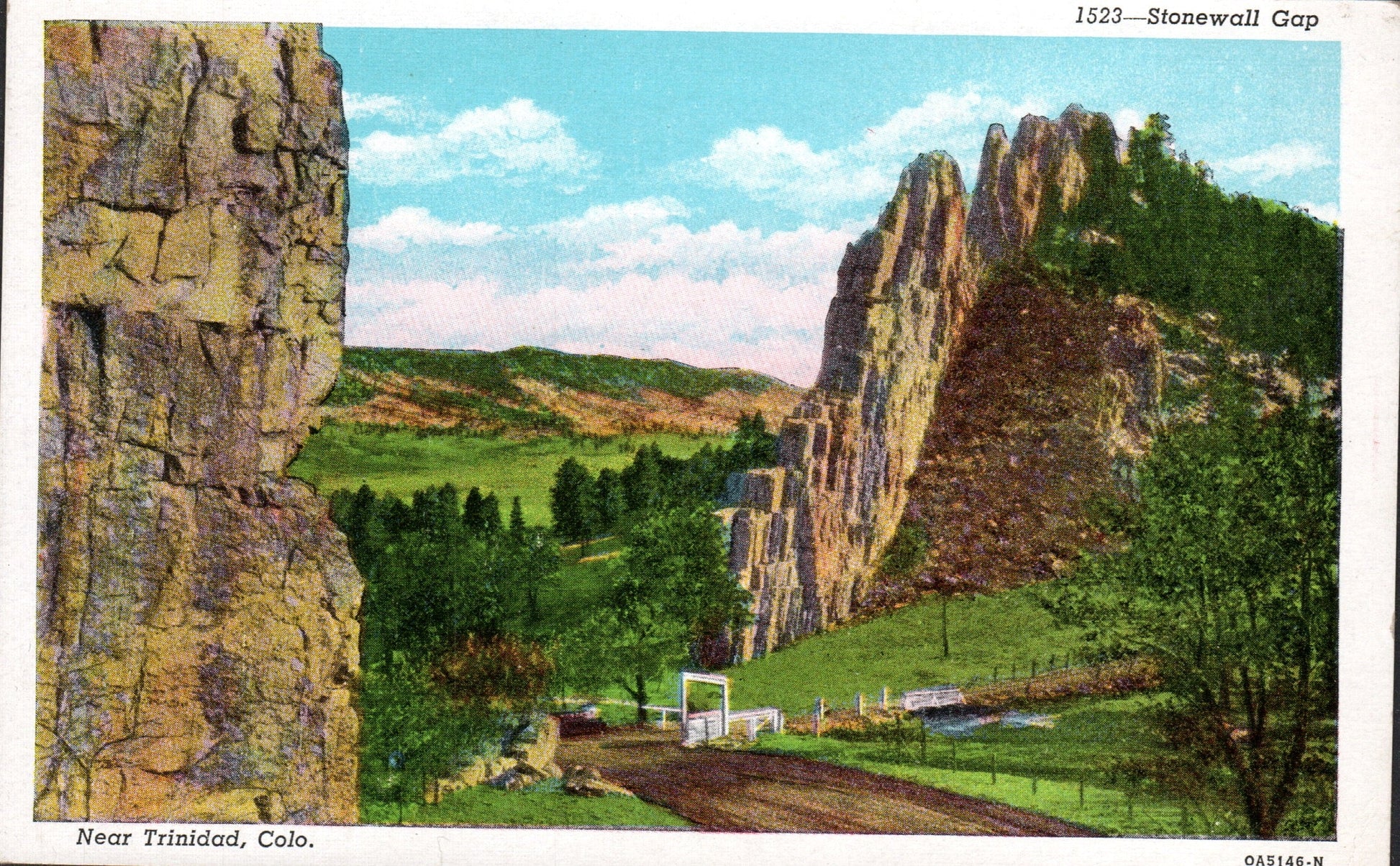Post cards: Overview of town and Fisher’s Peak [2 views, one B&W, c.1910, bent corner, one c.1920]; Old Baca House Museum [chrome] Fisher’s Peak [c.1920?]; “Stonewall Gap” [linen, S#1523]