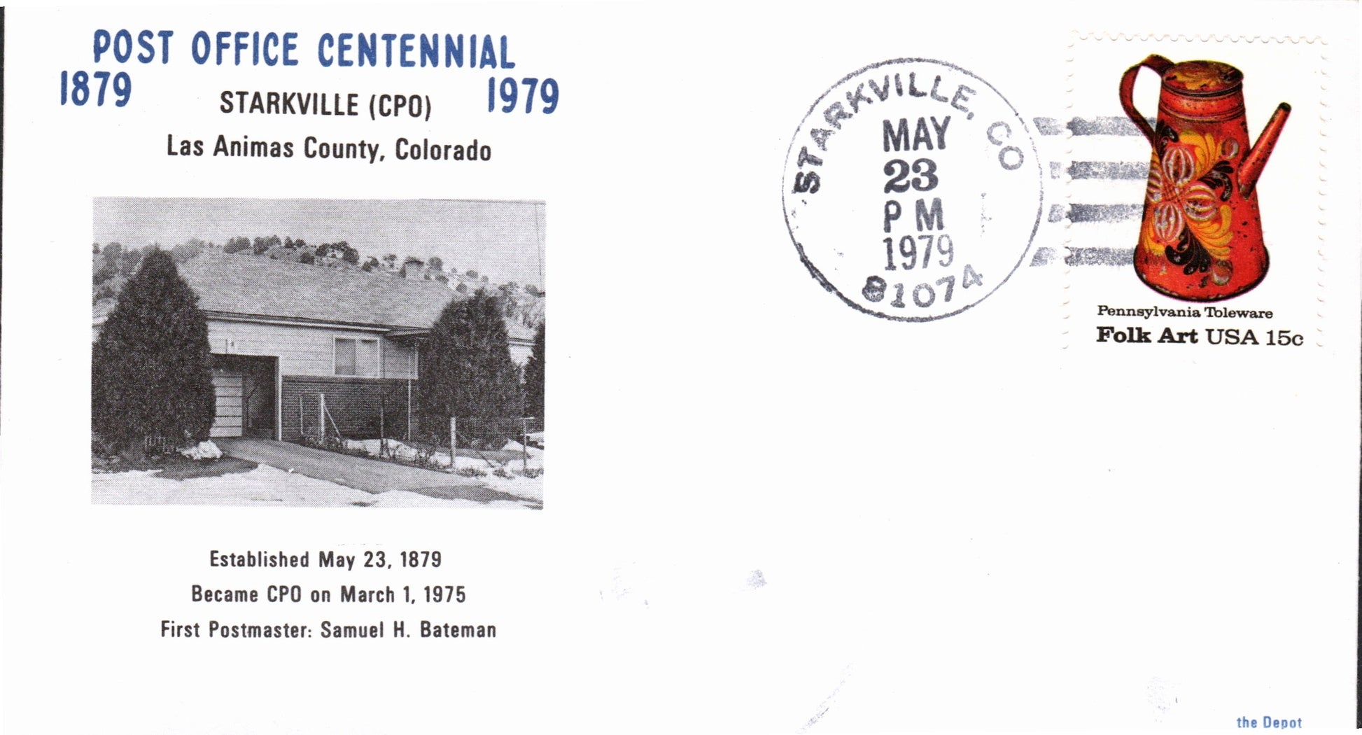 Starkville 1979 4-bar on cover, centennial of post office cacheted with photo of post office