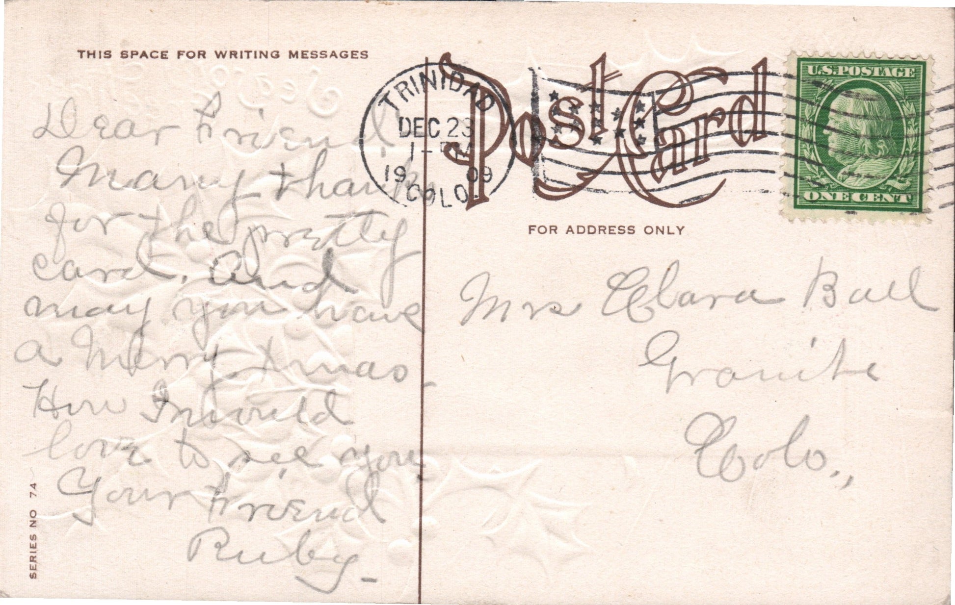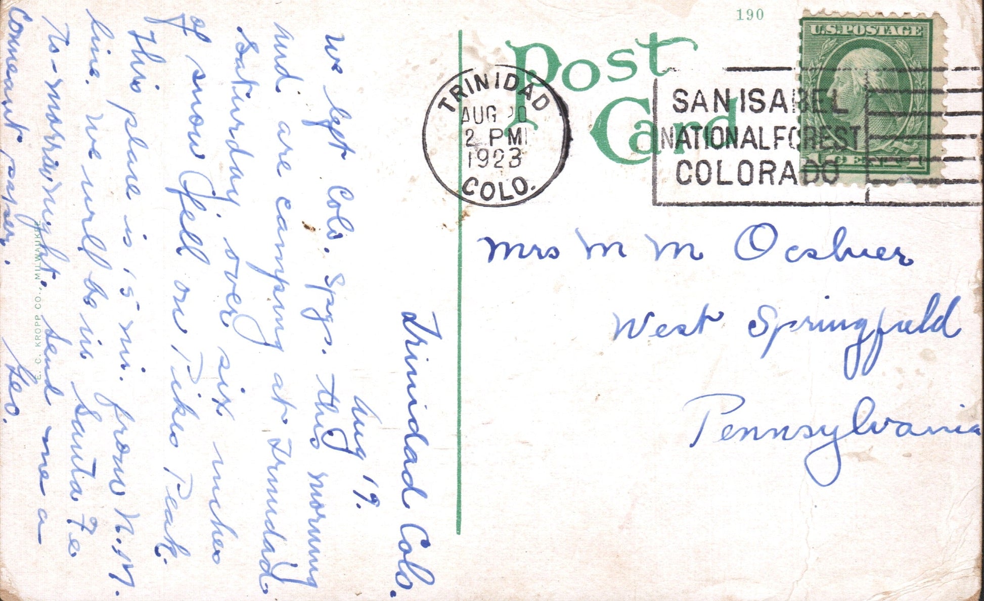Trinidad 1909 Flag cancel on post card; 1923 machine slogan “San Isabel National Forest” on post card